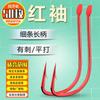 50 anzóis de manga vermelha ensacados, farpados planos, farpados, a granel, anzóis de cabo longo, carpas, carpas, anzóis finos