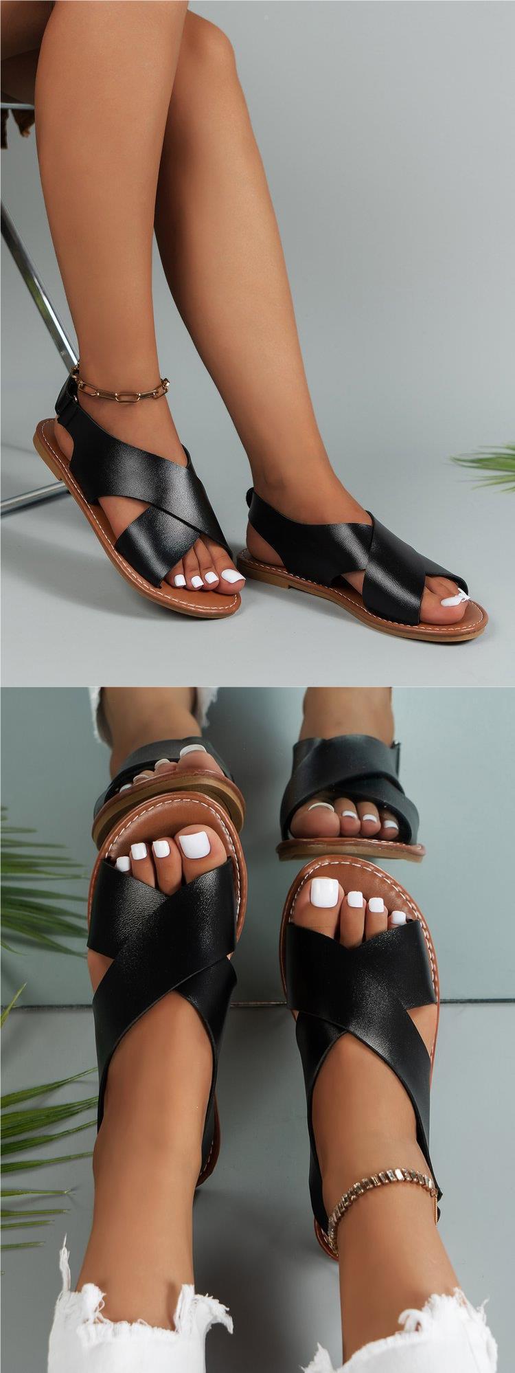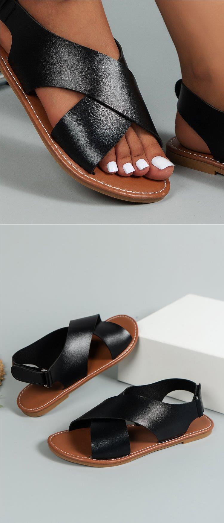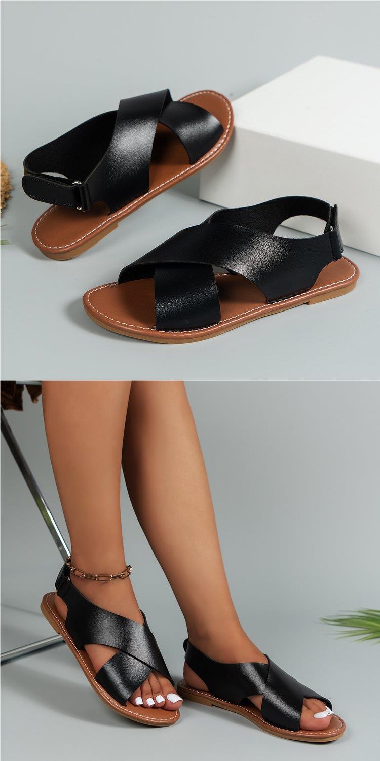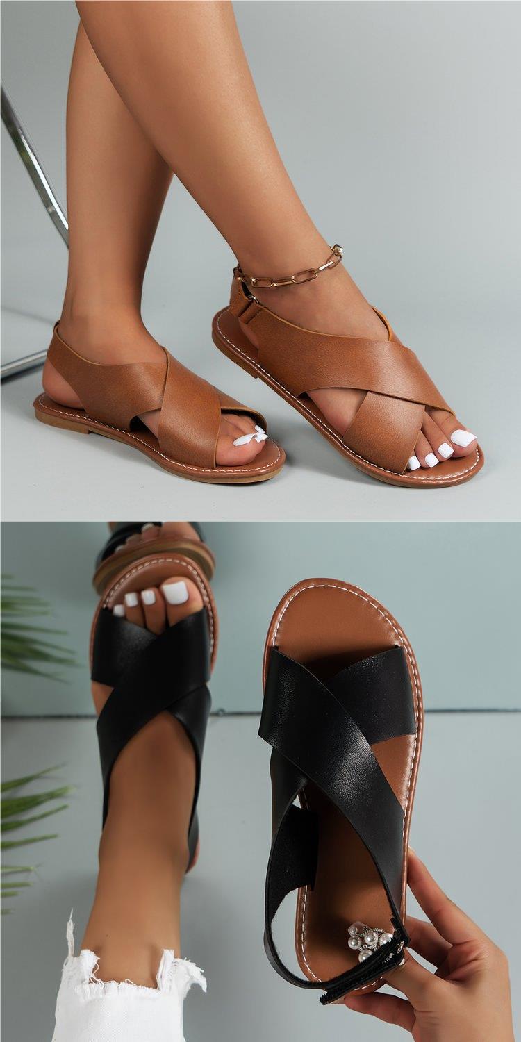 2024 Verão Comércio Exterior plus size Cross Strap Flat Sandálias Femininas Estilo Retro Cor Sólida Sandálias de Praia de Biqueira Aberta para Mulheres