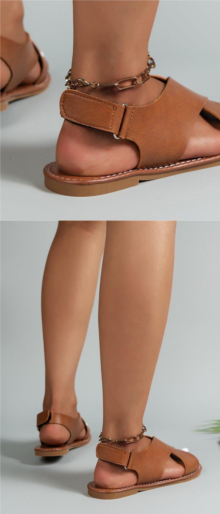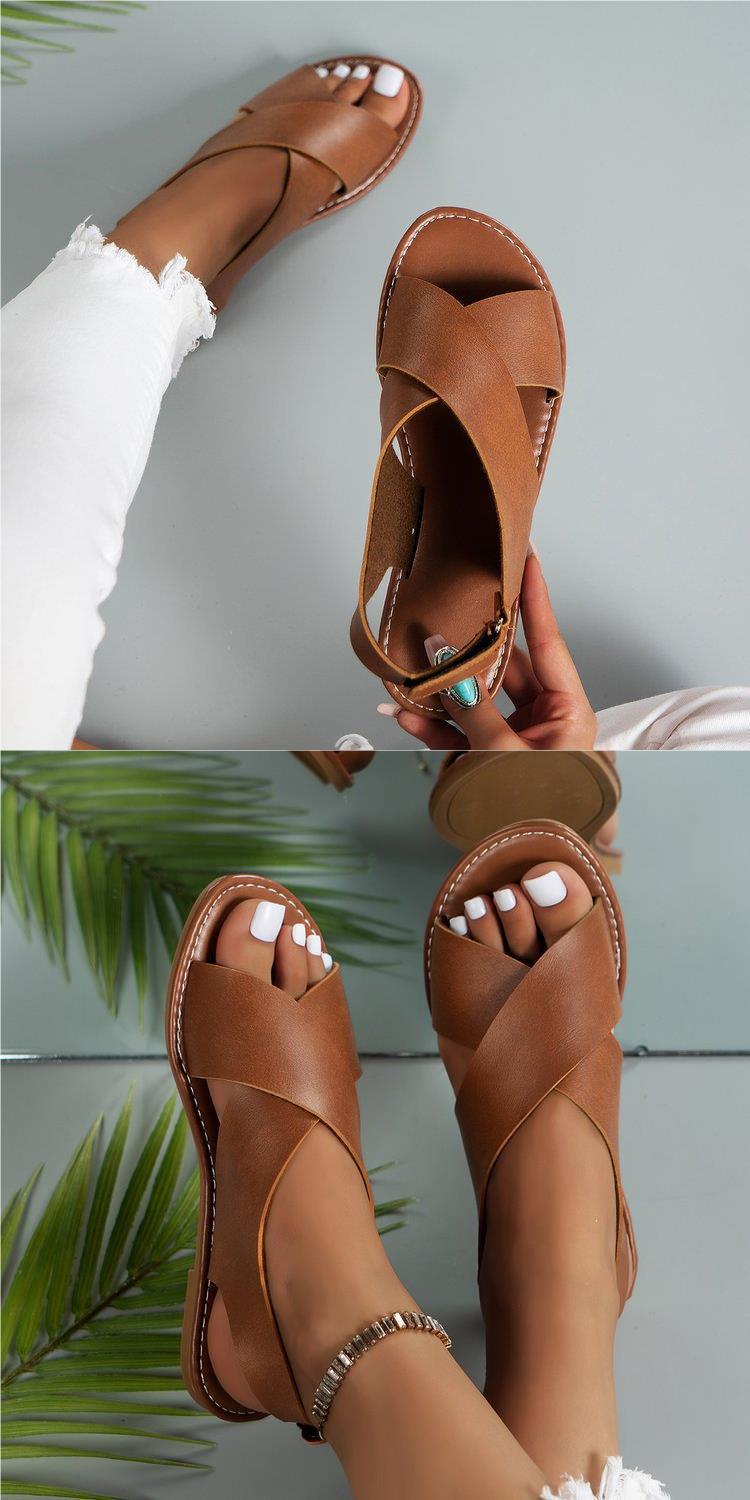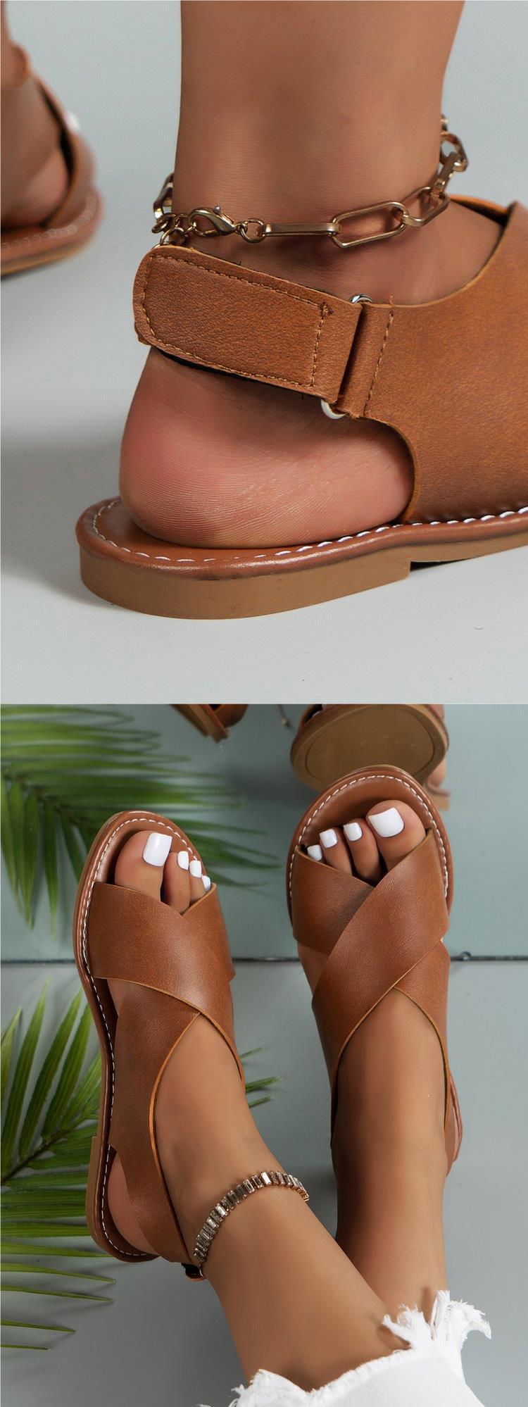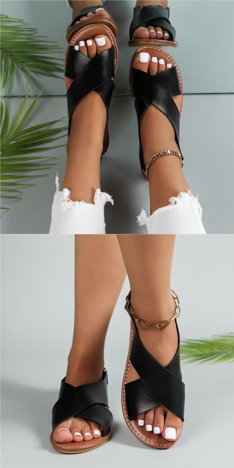 2024 Verão Comércio Exterior plus size Cross Strap Flat Sandálias Femininas Estilo Retro Cor Sólida Sandálias de Praia de Biqueira Aberta para Mulheres