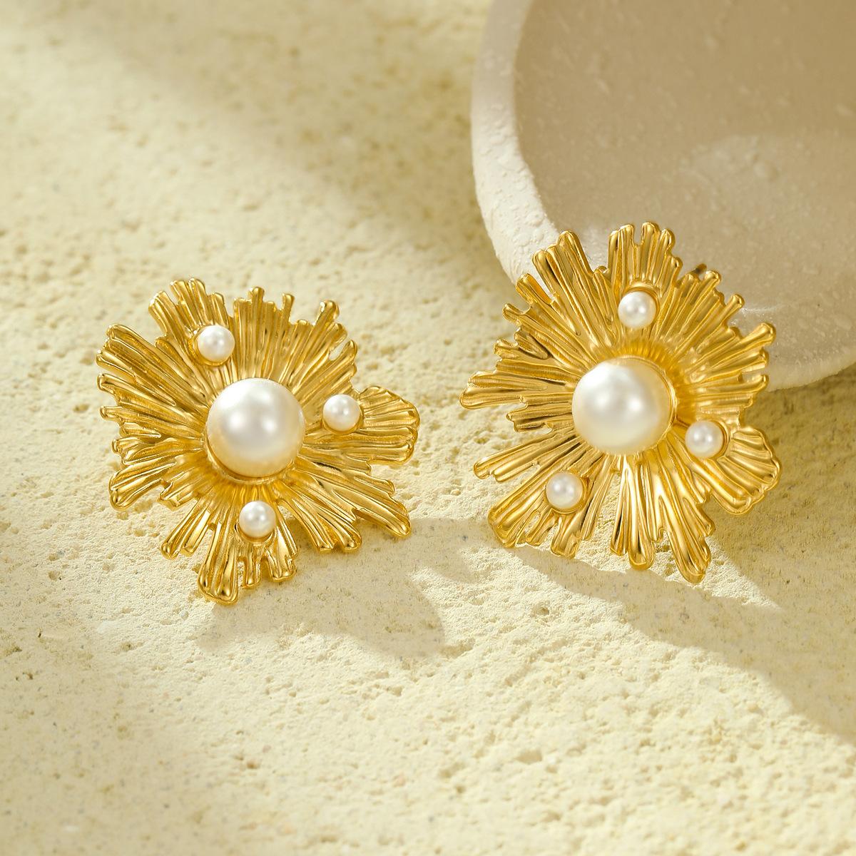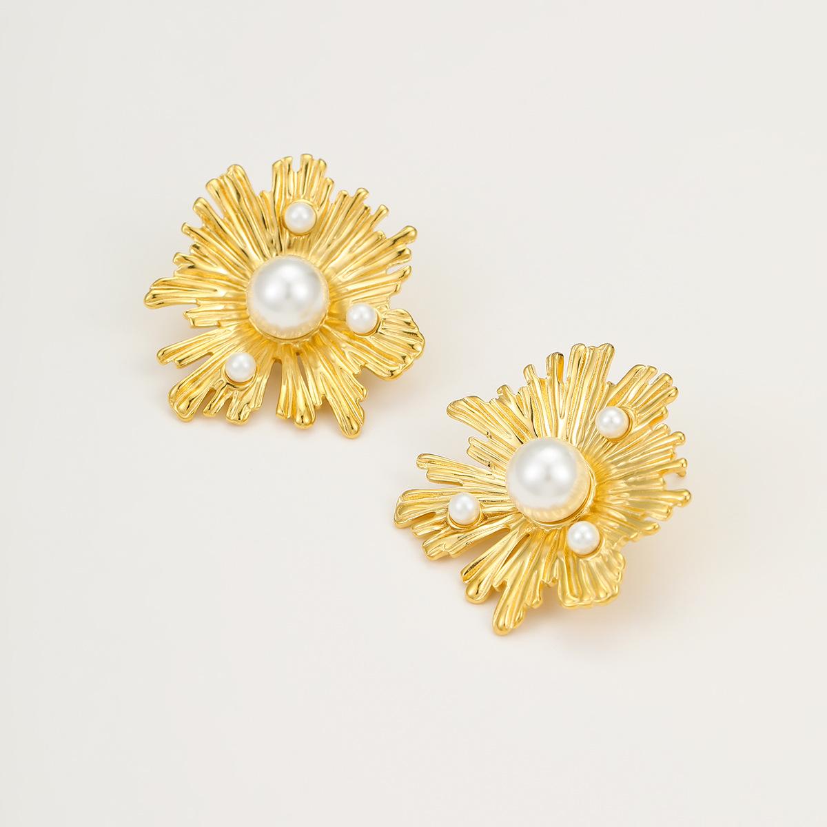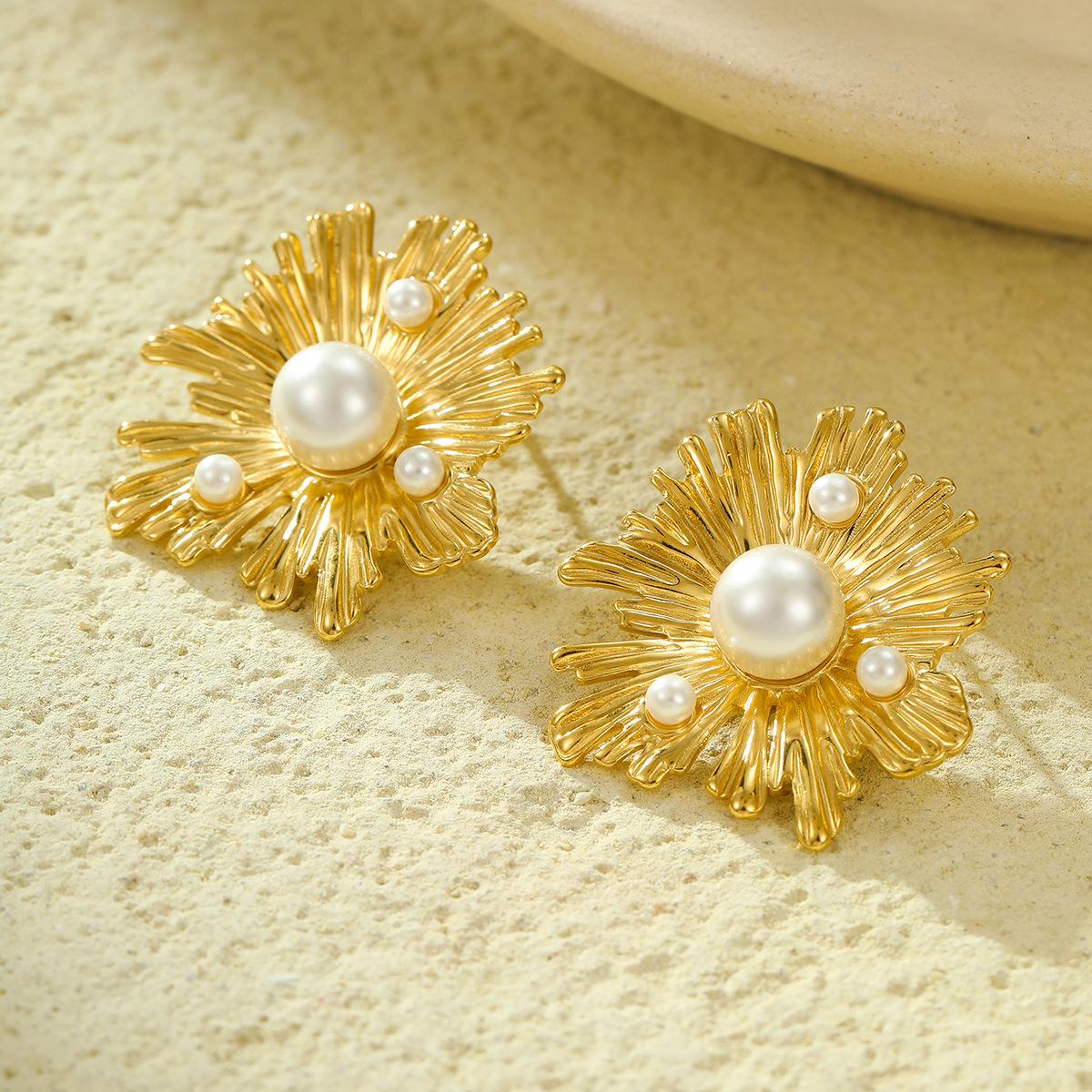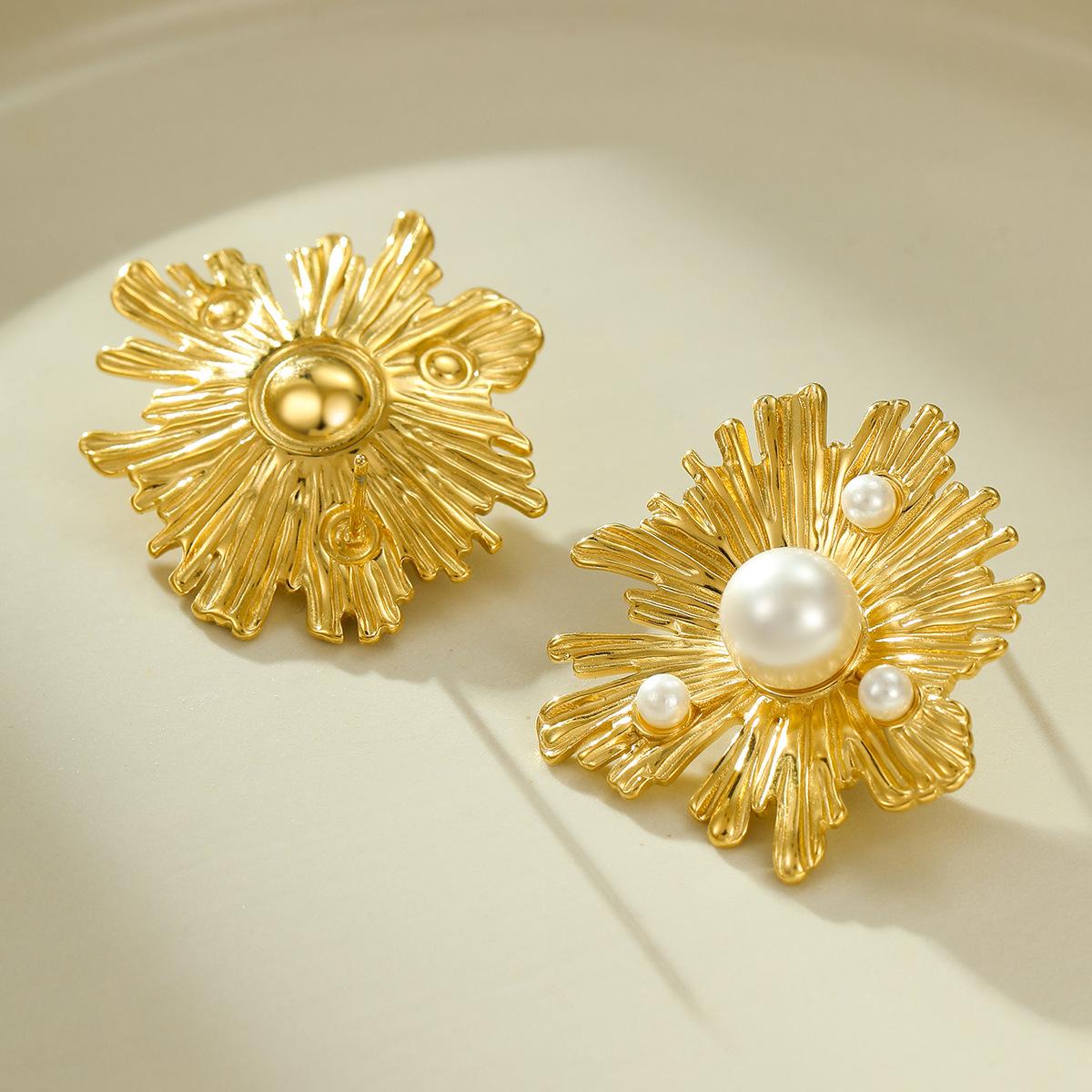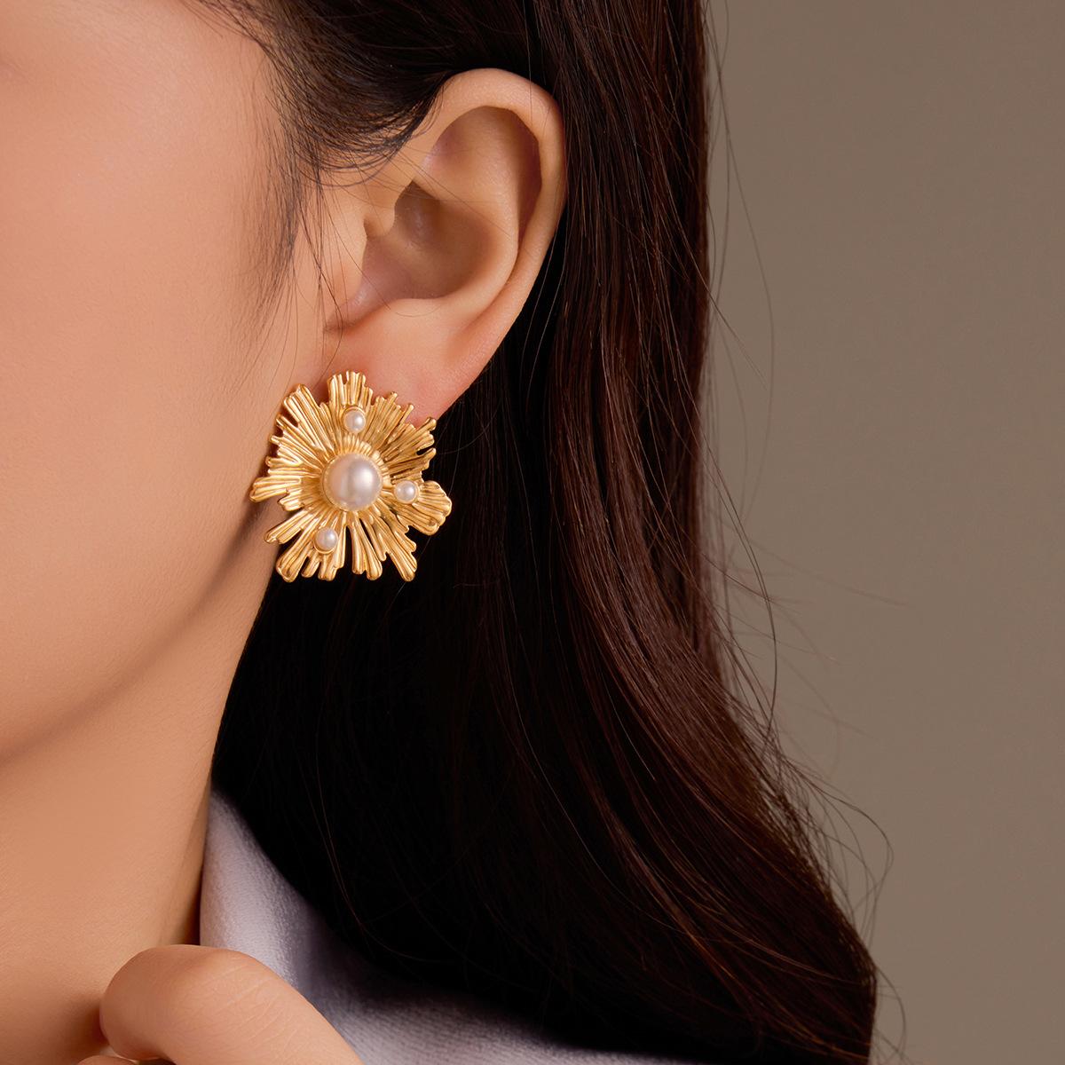 Compre Brincos Franceses Retrô de Nicho de Alta Qualidade em Aço Inoxidável Pétalas Irregulares Linhas Incrustadas com Brincos de Pérola Atacado no atacado no Joom.pro