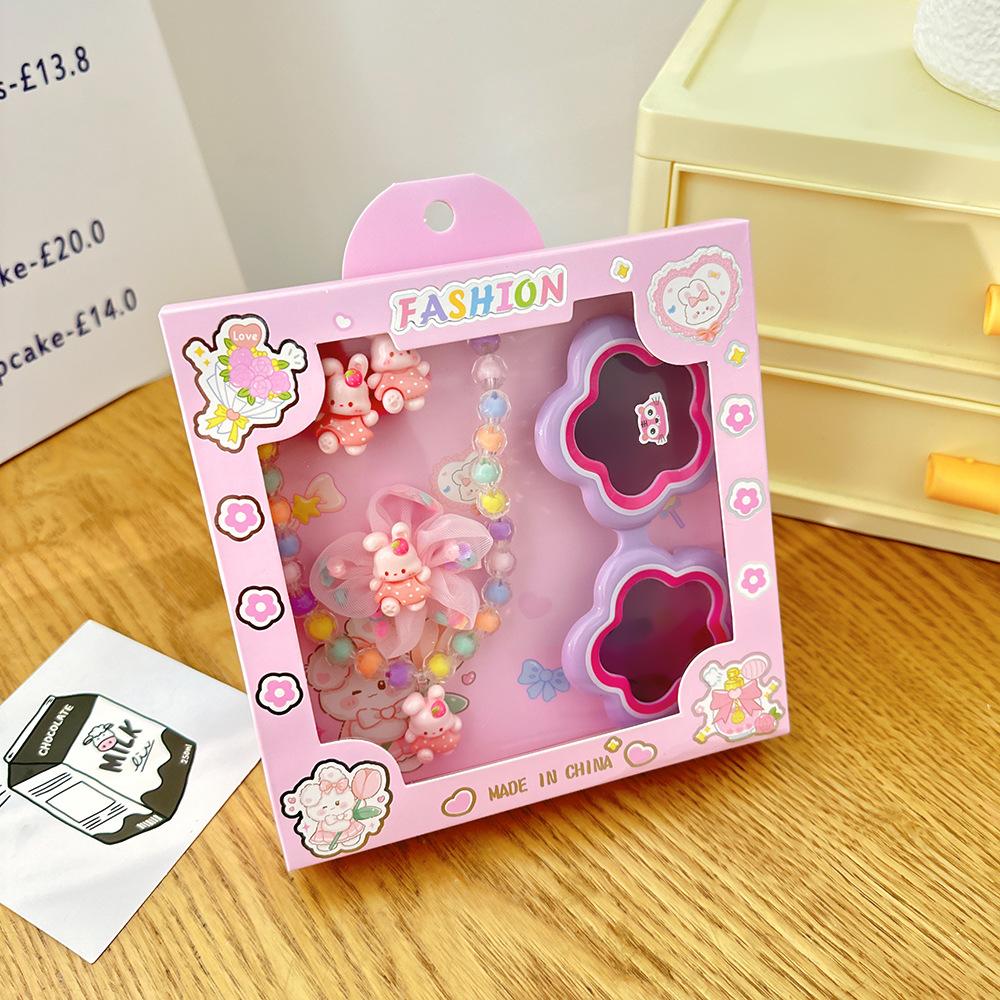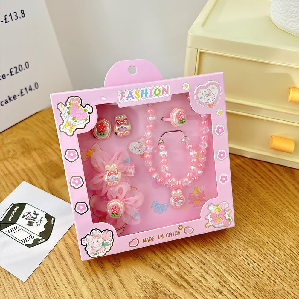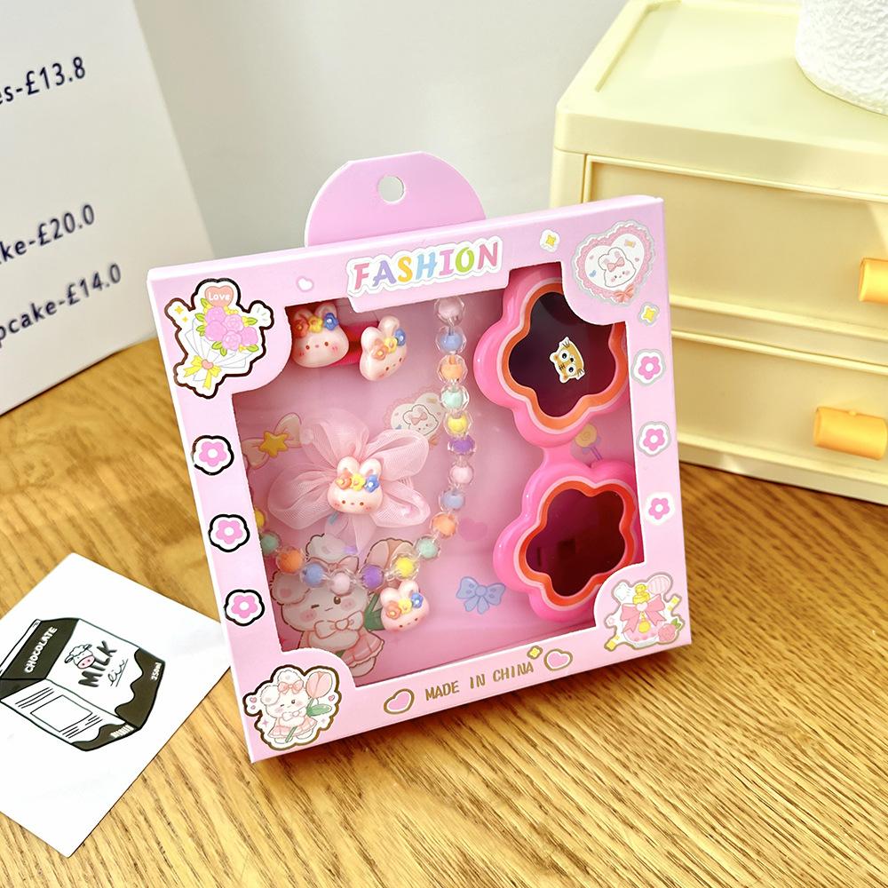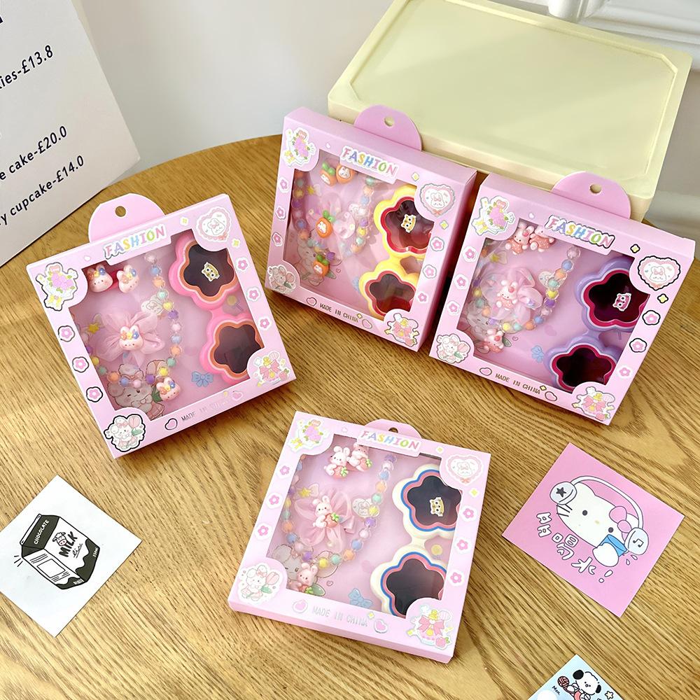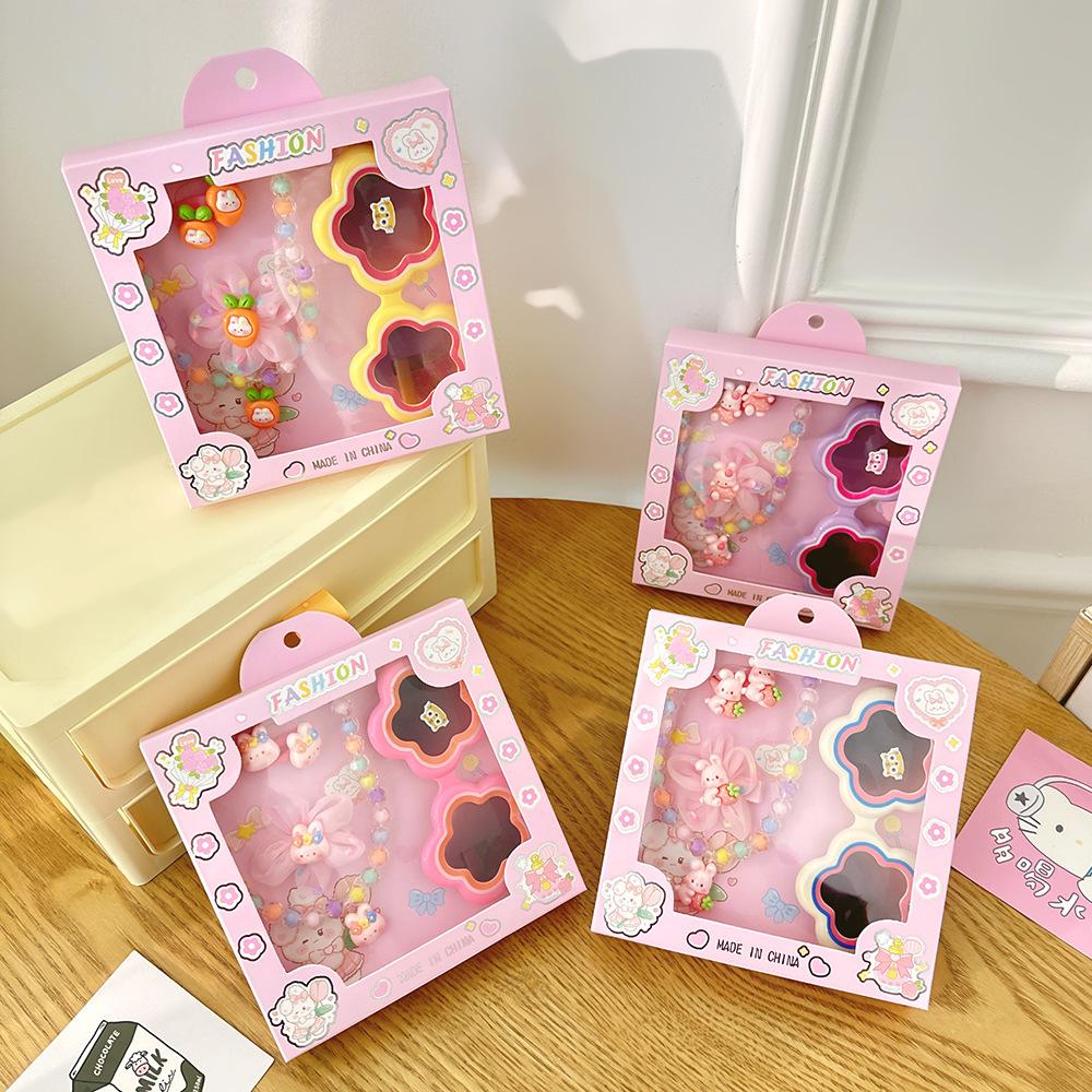 Conjunto de joias de princesa infantil, caixa de presente, desenho animado, coelho fofo, grampo de cabelo, acessórios para cabelo, colar de cor doce, joias