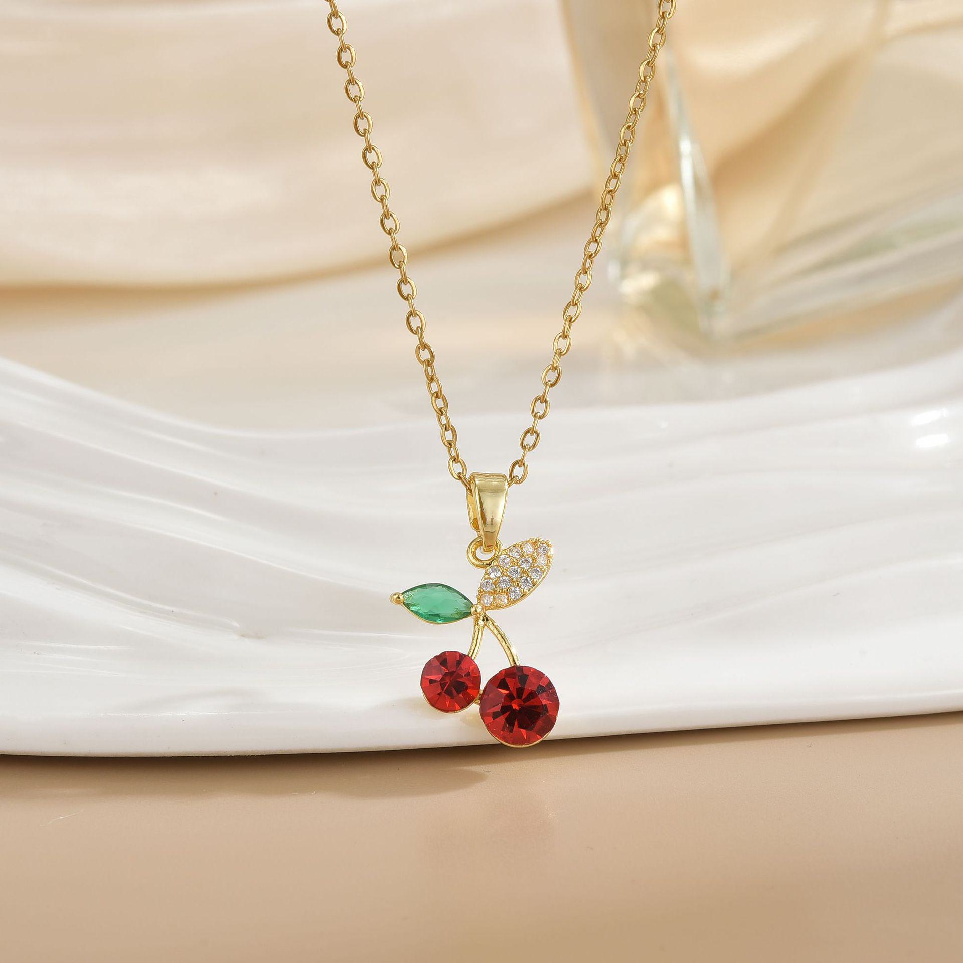 [Aço titânio] Colar de Diamante Completo de Zircão de Cereja Leve de Luxo Elegante Lindo Colar de Diamante Completo para Mulheres Corrente de Clavícula de Titânio