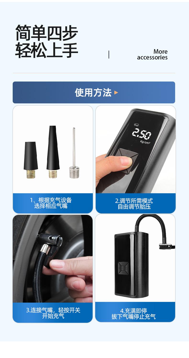 3. Selecione a válvula correspondente para se adaptar ao enchimento de uma variedade de equipamentos, como pneus de carro, pneus de motocicleta, pneus de bicicleta, bolas, etc.