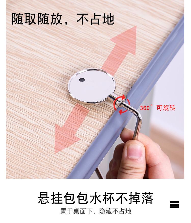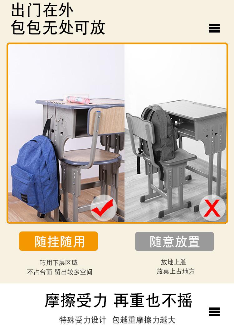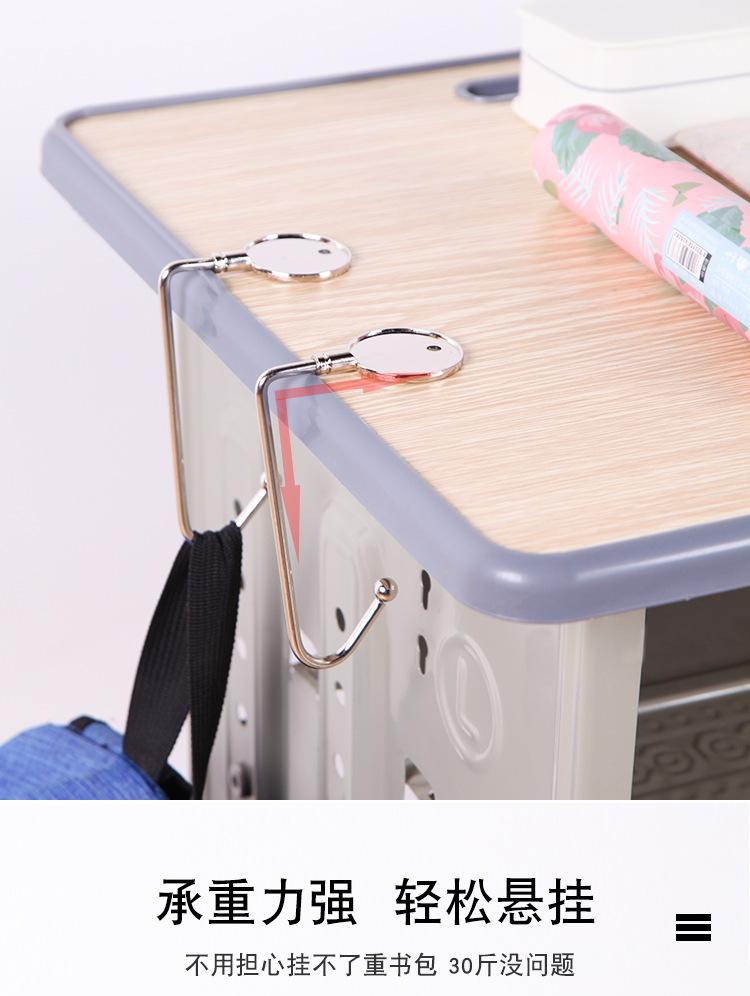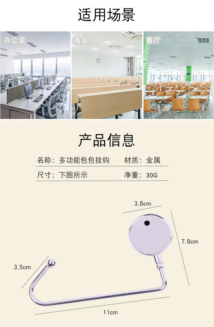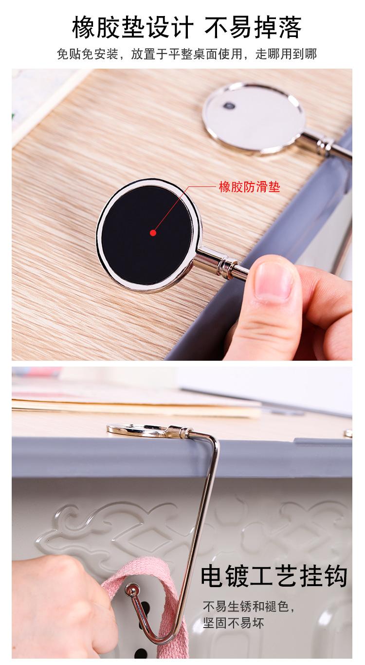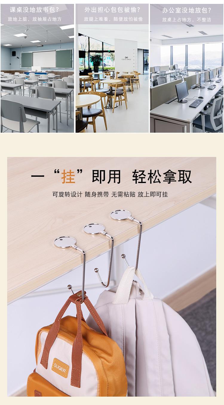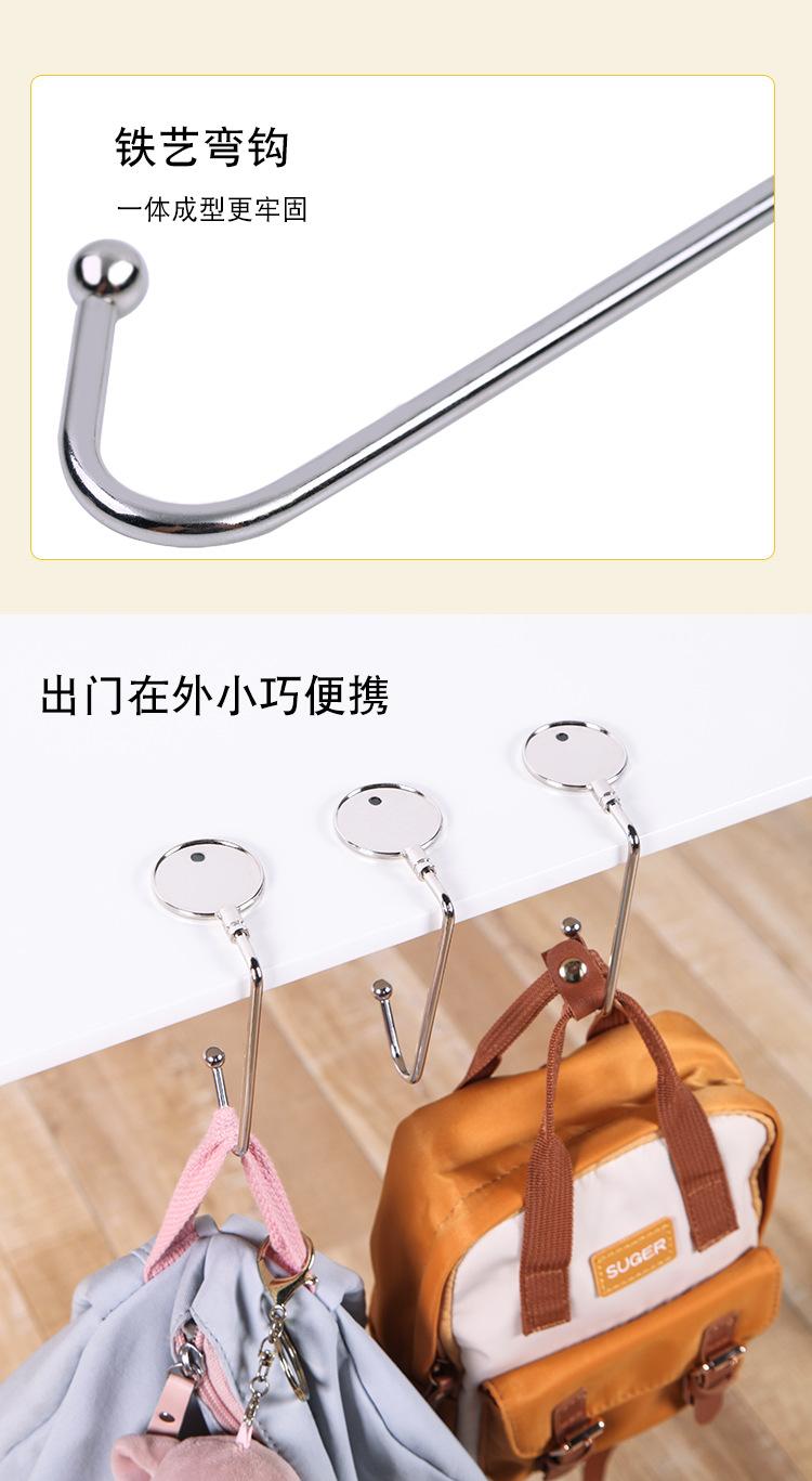 Gancho de bolsa multifuncional, feito de metal, forte capacidade de carga; pode ser pendurado sob a mesa, não ocupa espaço; pode pendurar mochilas escolares, bolsas, vários itens pequenos, etc. O processo de galvanoplastia não enferruja e desbota facilmente, é forte e não quebra facilmente. Pequeno e fácil de guardar, pode ser carregado com você e pode ser usado quando necessário.