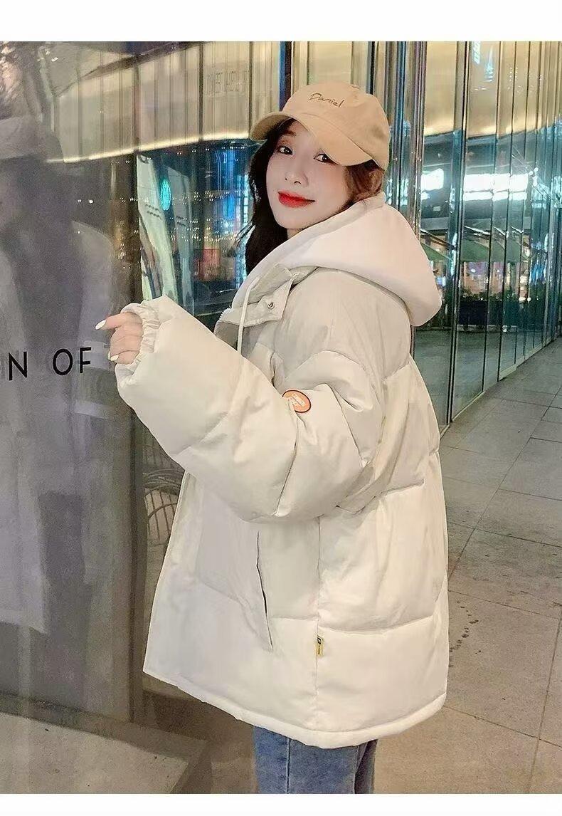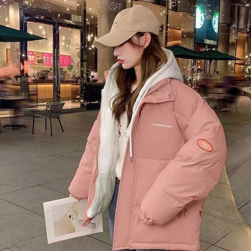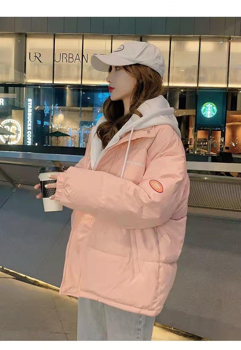 Jaqueta acolchoada de algodão feminina 2024 inverno nova jaqueta solta acolchoada de algodão para estudantes jaqueta curta espessada com capuz fashion jaqueta falsa de duas peças acolchoada de algodão