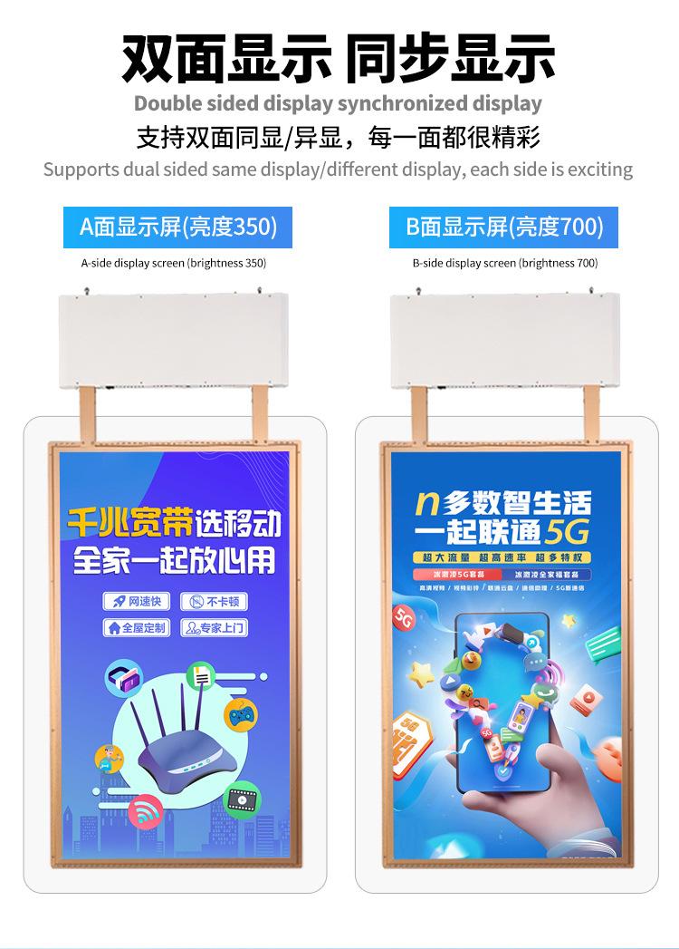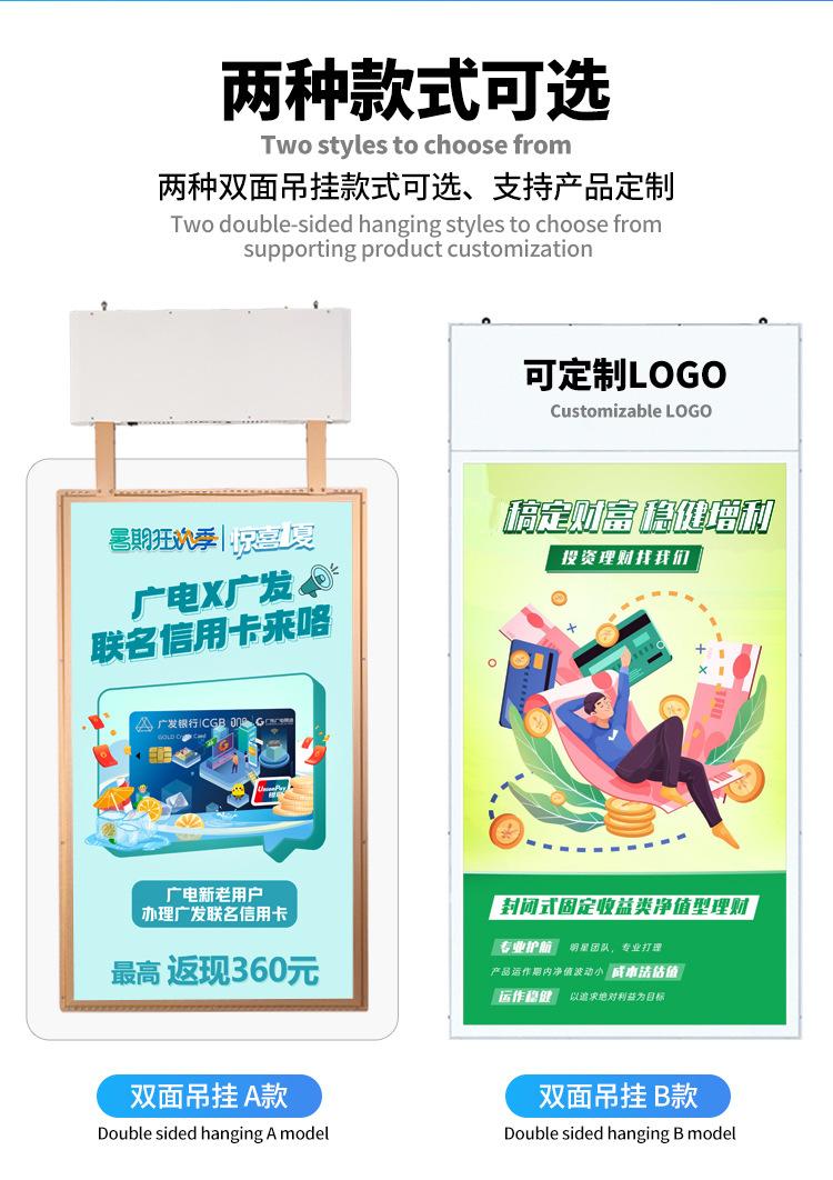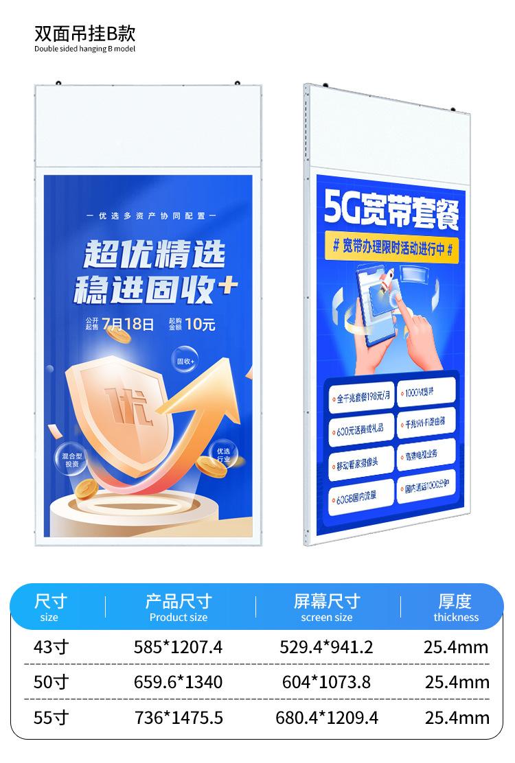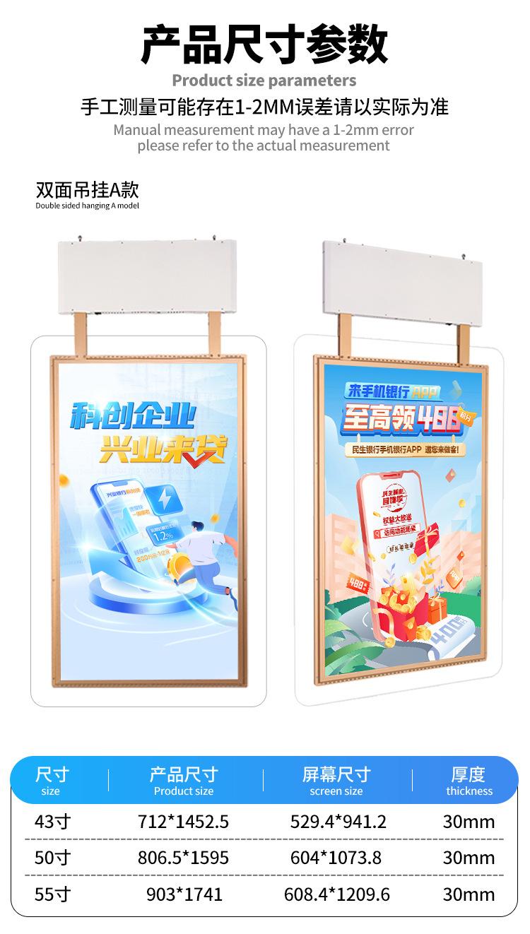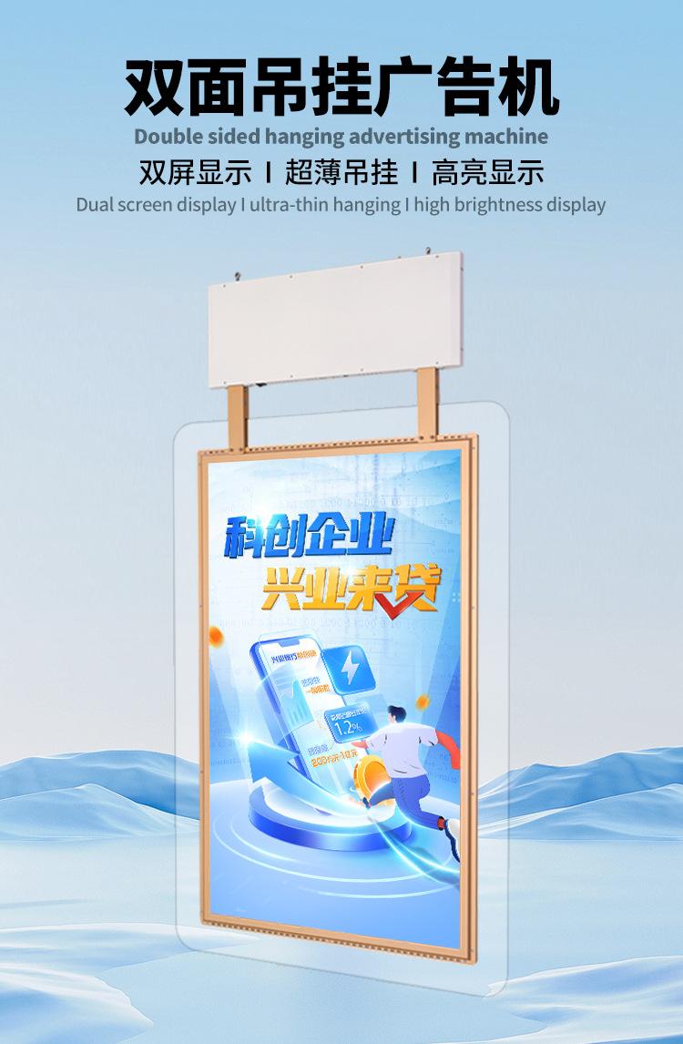 Máquina de propaganda dupla face suspensa de 43/50/55 polegadas, janela de loja de banco, tela transparente, ultrafina, tela dupla suspensa, máquina multifuncional