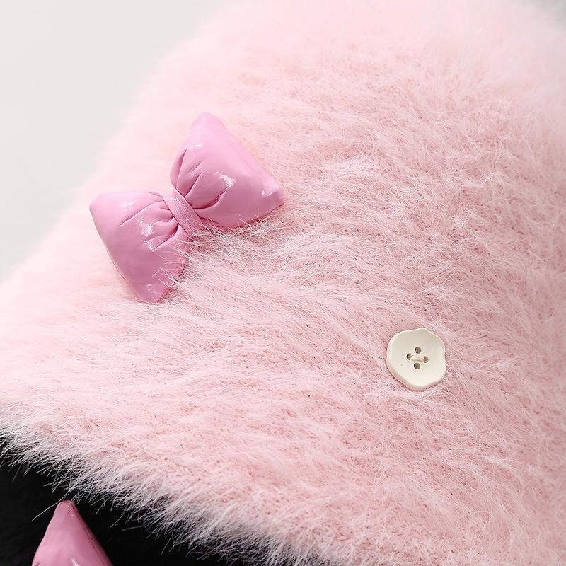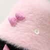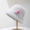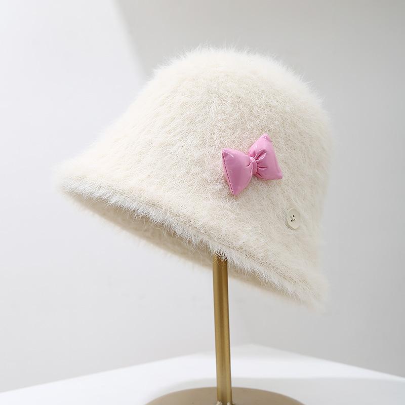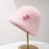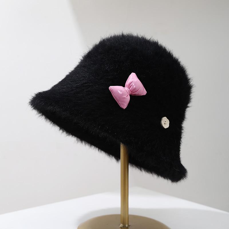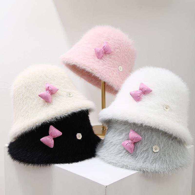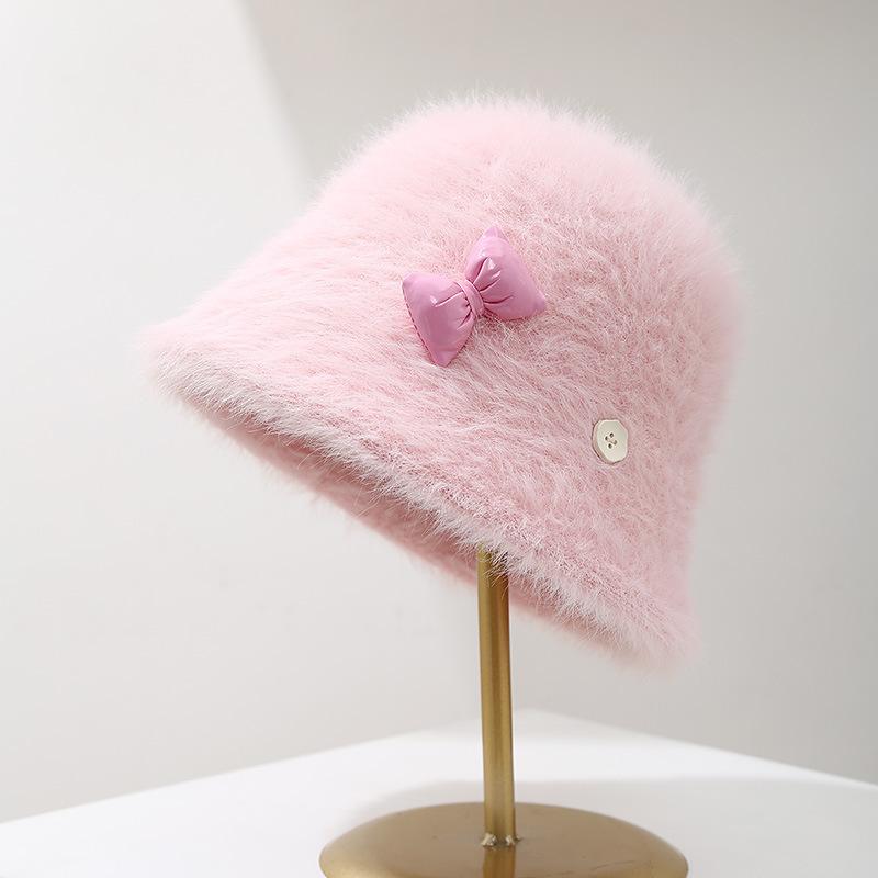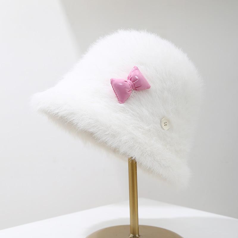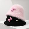 Chapéu de pescador de pelúcia com laço de pele de coelho estilo japonês, chapéu feminino de outono e inverno, chapéu de proteção de orelha quente e espesso para rosto, chapéu de bacia pequeno com amor