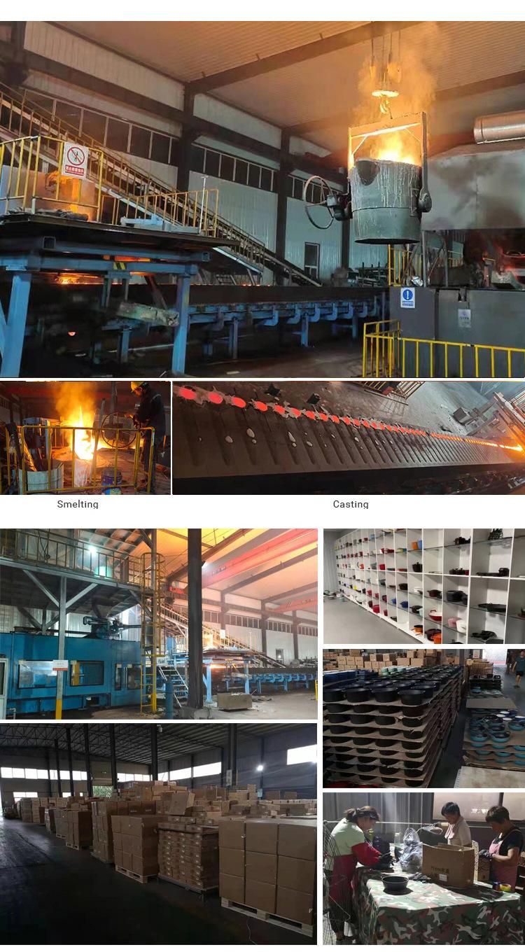 [Produtos principais]: Panelas esmaltadas, frigideiras de ferro fundido, frigideiras de bife de ferro fundido, panelas de guisado de ferro fundido, woks de ferro fundido, panelas de ferro fundido de dupla finalidade, etc. Há muitos anos que estamos envolvidos na produção e exportação de panelas de ferro fundido e mais de 90% dos nossos produtos são exportados para Europa, América e outros países.