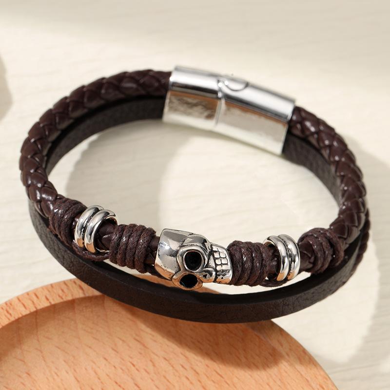 Jóias transfronteiriças europeias e americanas masculinas All-match Handmade Pulseira de couro tecido Punk Skull Magnetic Buckle Bracelet
