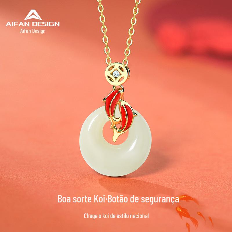 Boa sorte Koi Ping An Fivela Hetian Jade Colar Feminino s925 Prata Esterlina Nacional Tendência Nova Corrente de Clavícula Koi Chinesa para Namorada