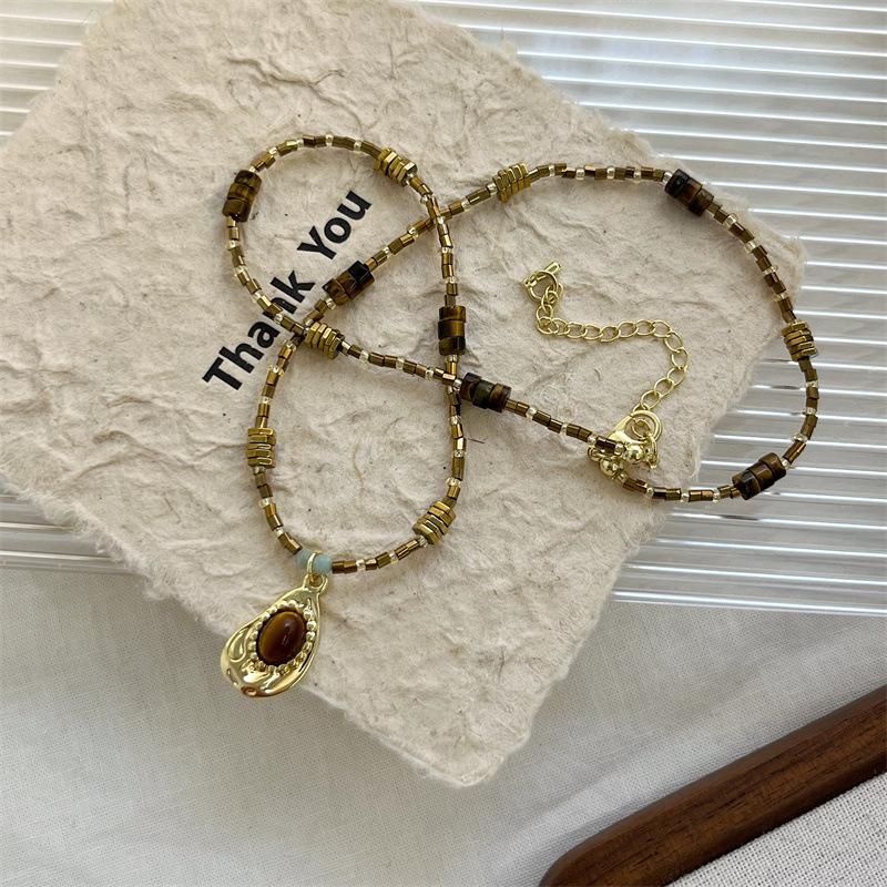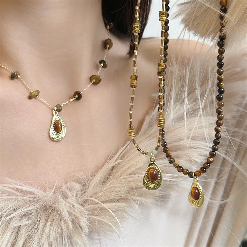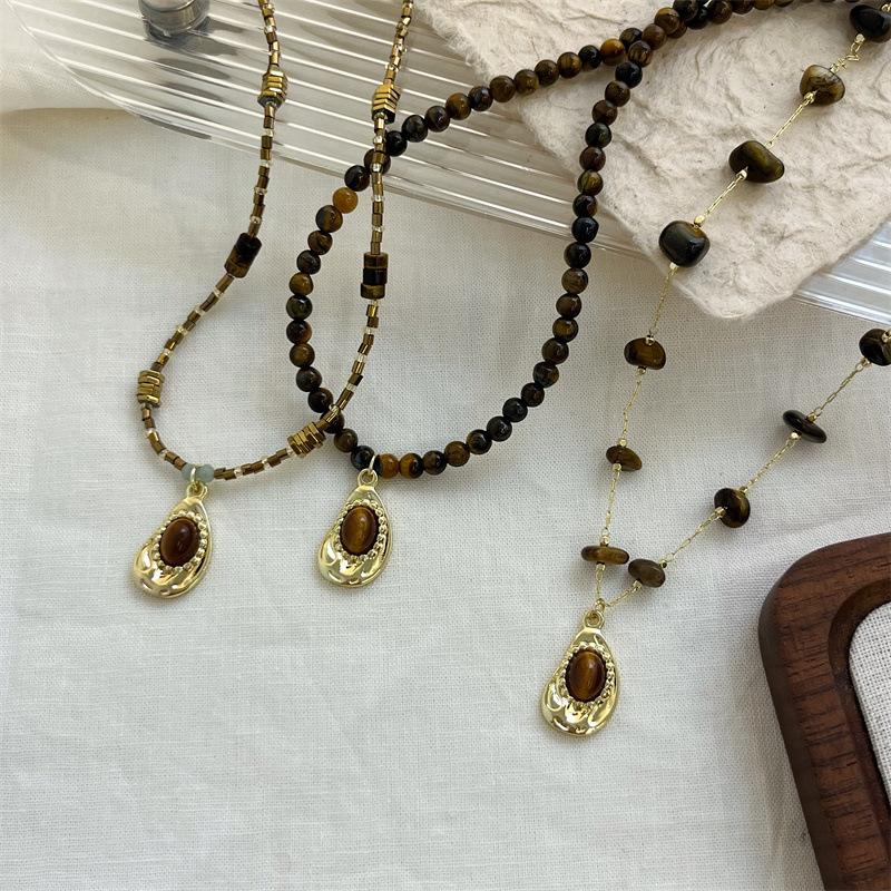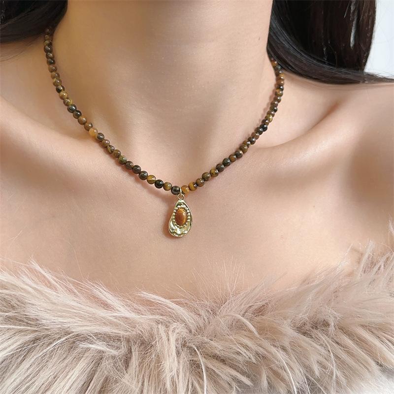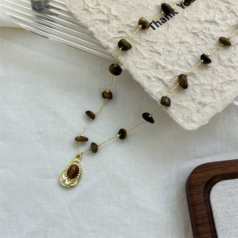 Compre Colar vintage de pedra olho de tigre natural temperamento simples nova corrente de clavícula de contas chinesas outono e inverno corrente de lã combinando na moda no atacado no Joom.pro