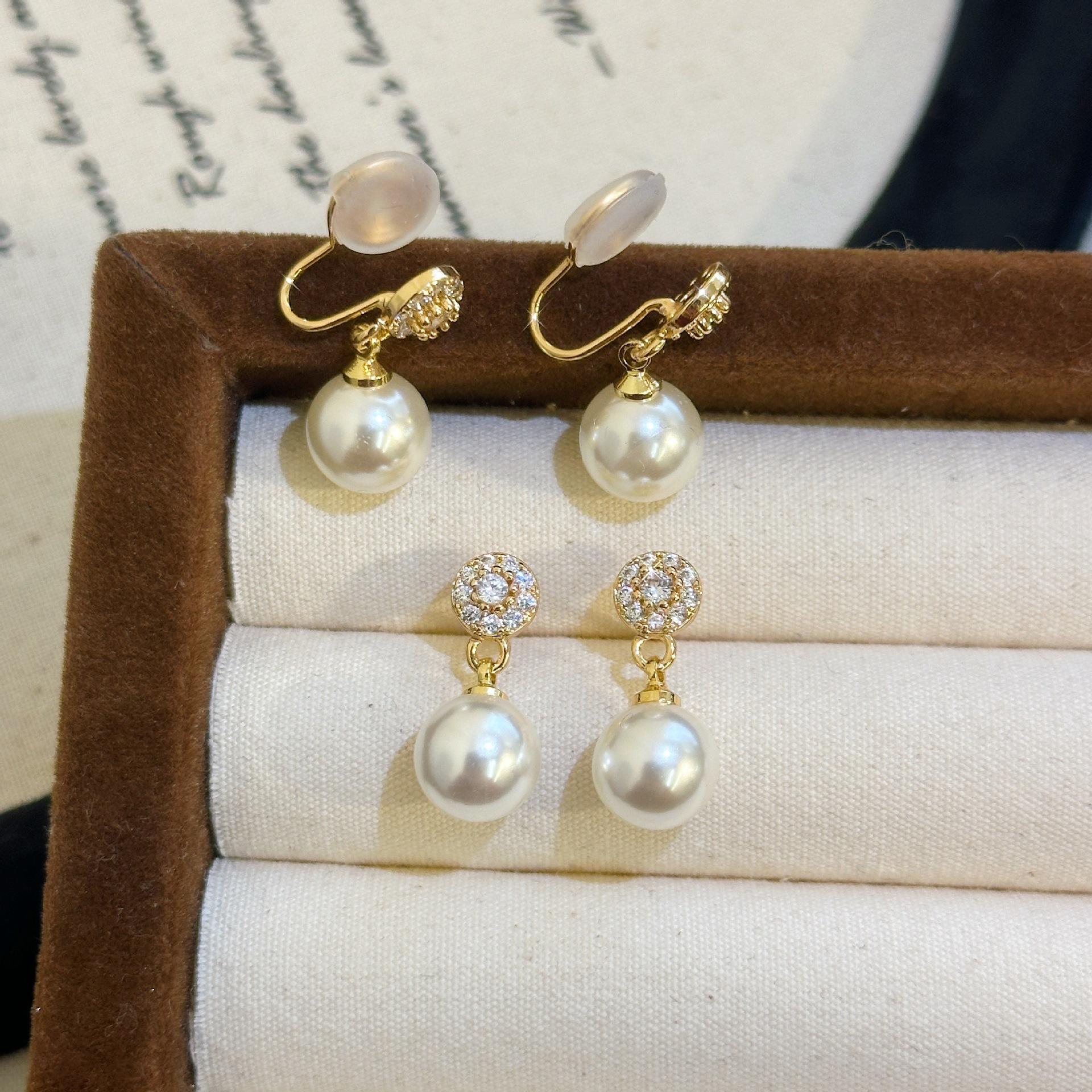 Gold mosquito coil plates white pearl ear clips, Gold zircon white pearl stud earrings