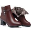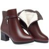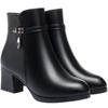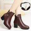 Botas curtas de outono e inverno de meia-idade, botas femininas de salto grosso, couro macio, salto médio quente, forro de lã, sapatos de couro, mãe de meia-idade, sapatos de algodão
