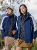 Casaco de inverno masculino e feminino com blocos de cores, jaqueta para montanhismo ao ar livre, à prova d'água, à prova de vento, forrado com lã, engrossado, quente