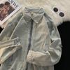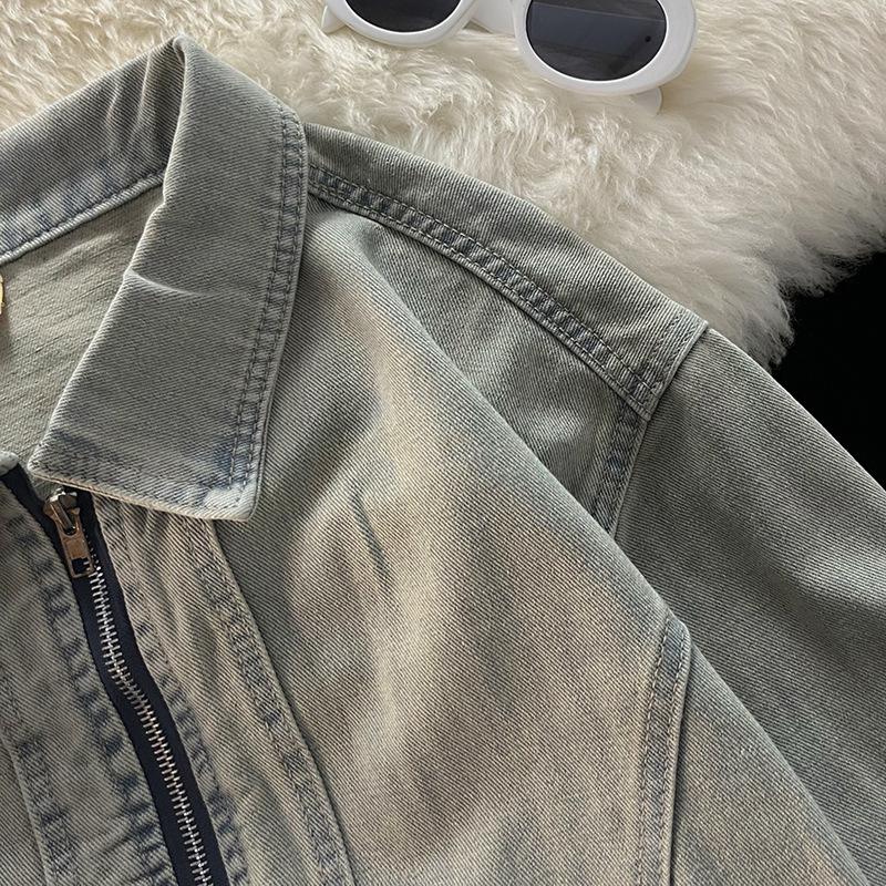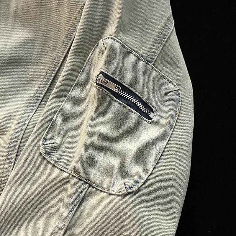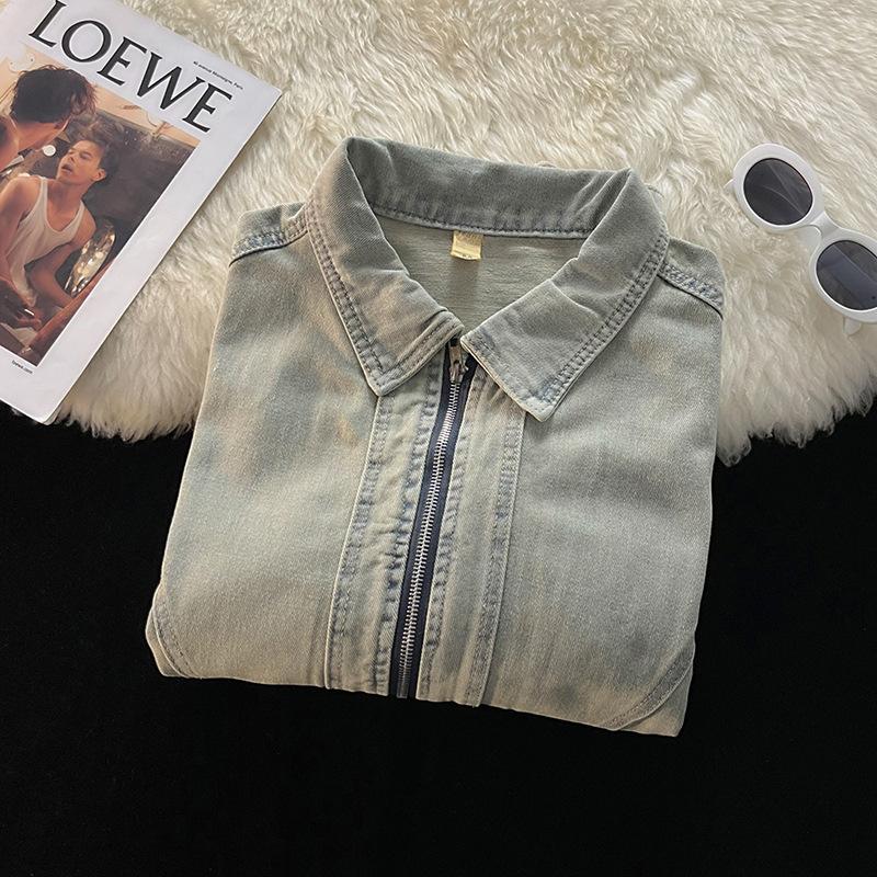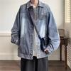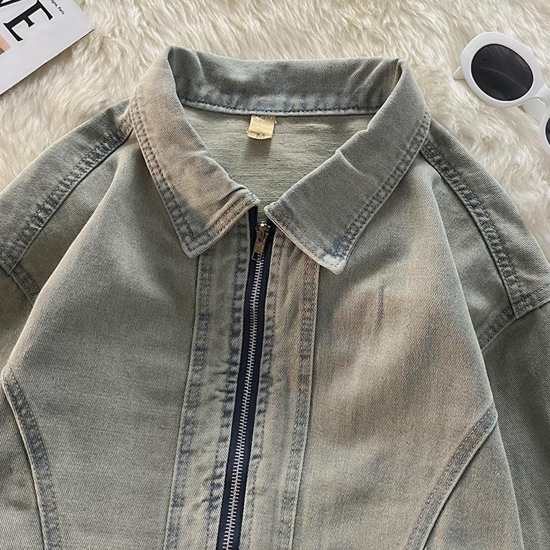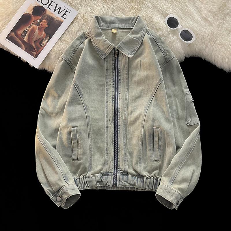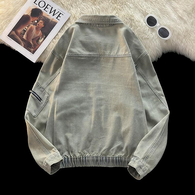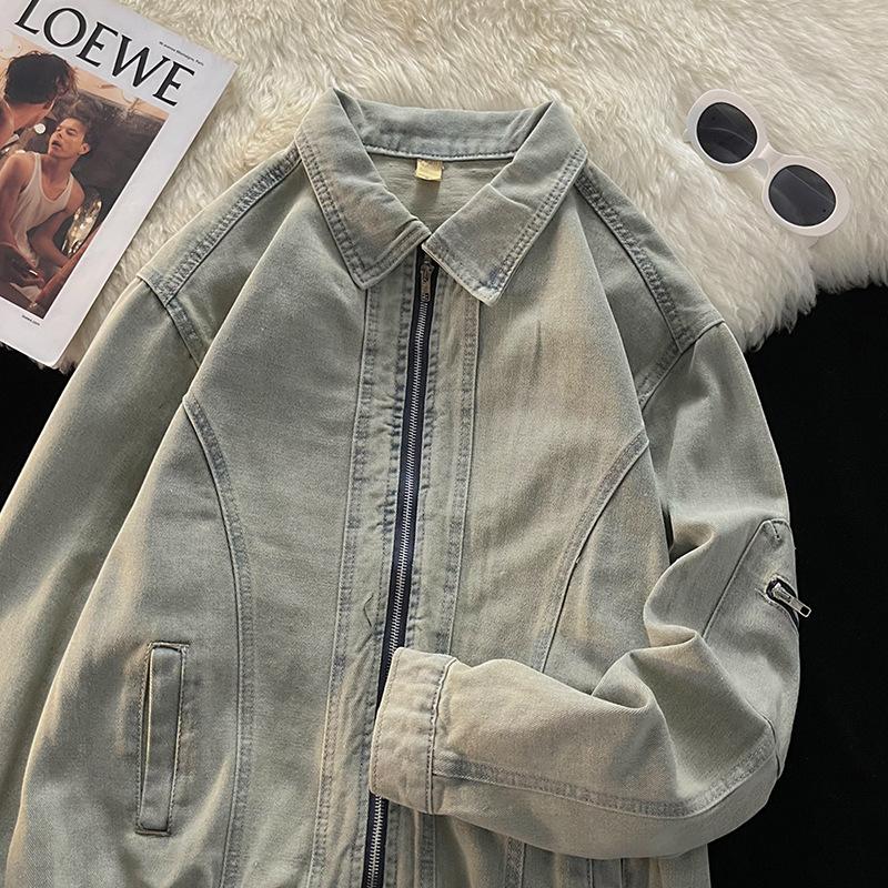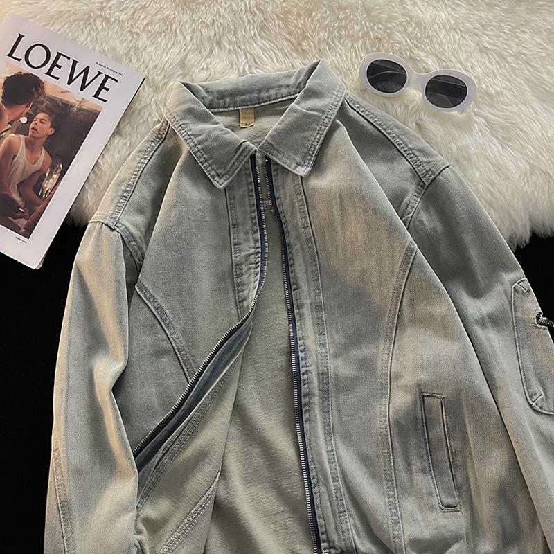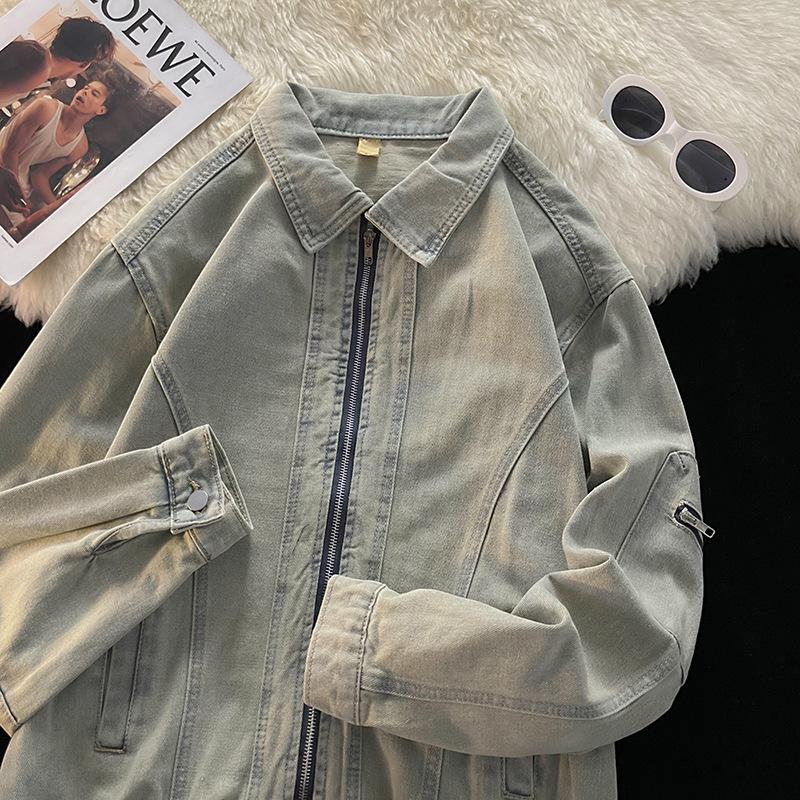 Jaqueta jeans masculina estilo americano de primavera e outono com zíper lavado vintage e design solto e de lapela de marca da moda