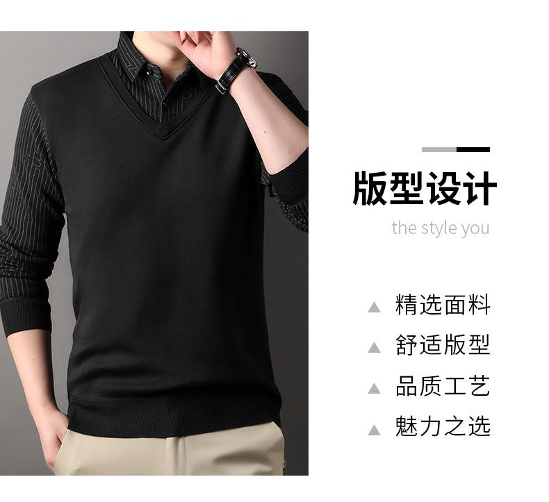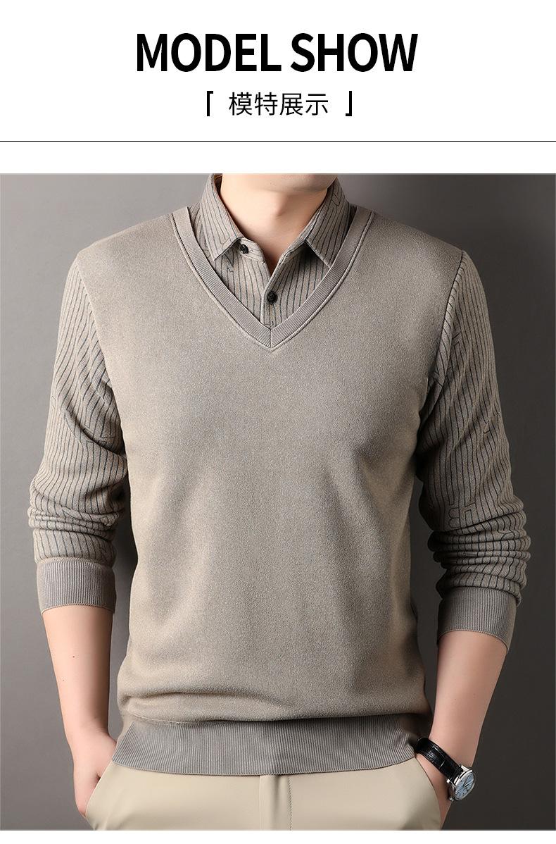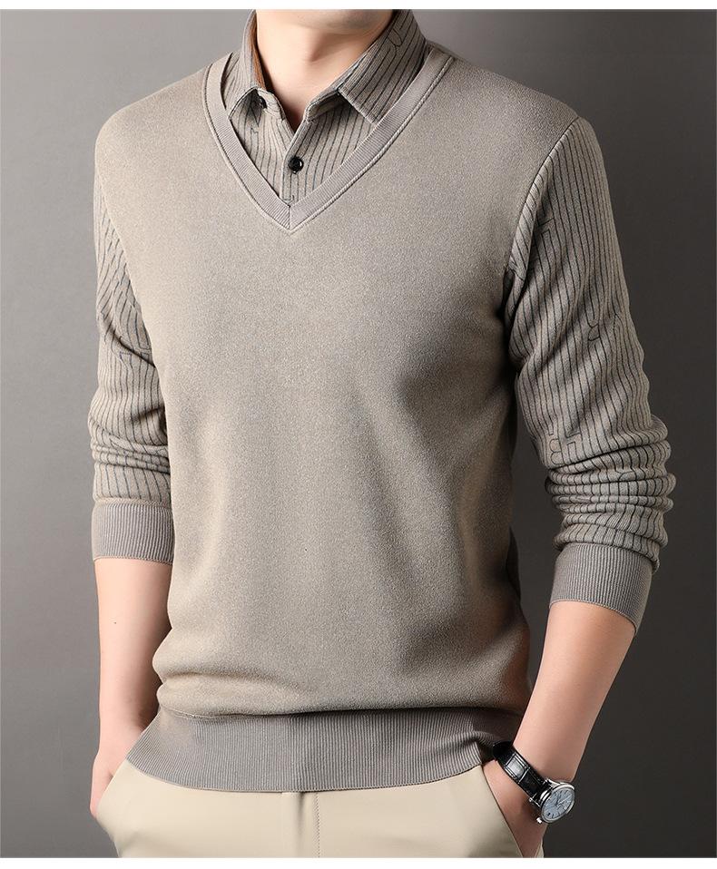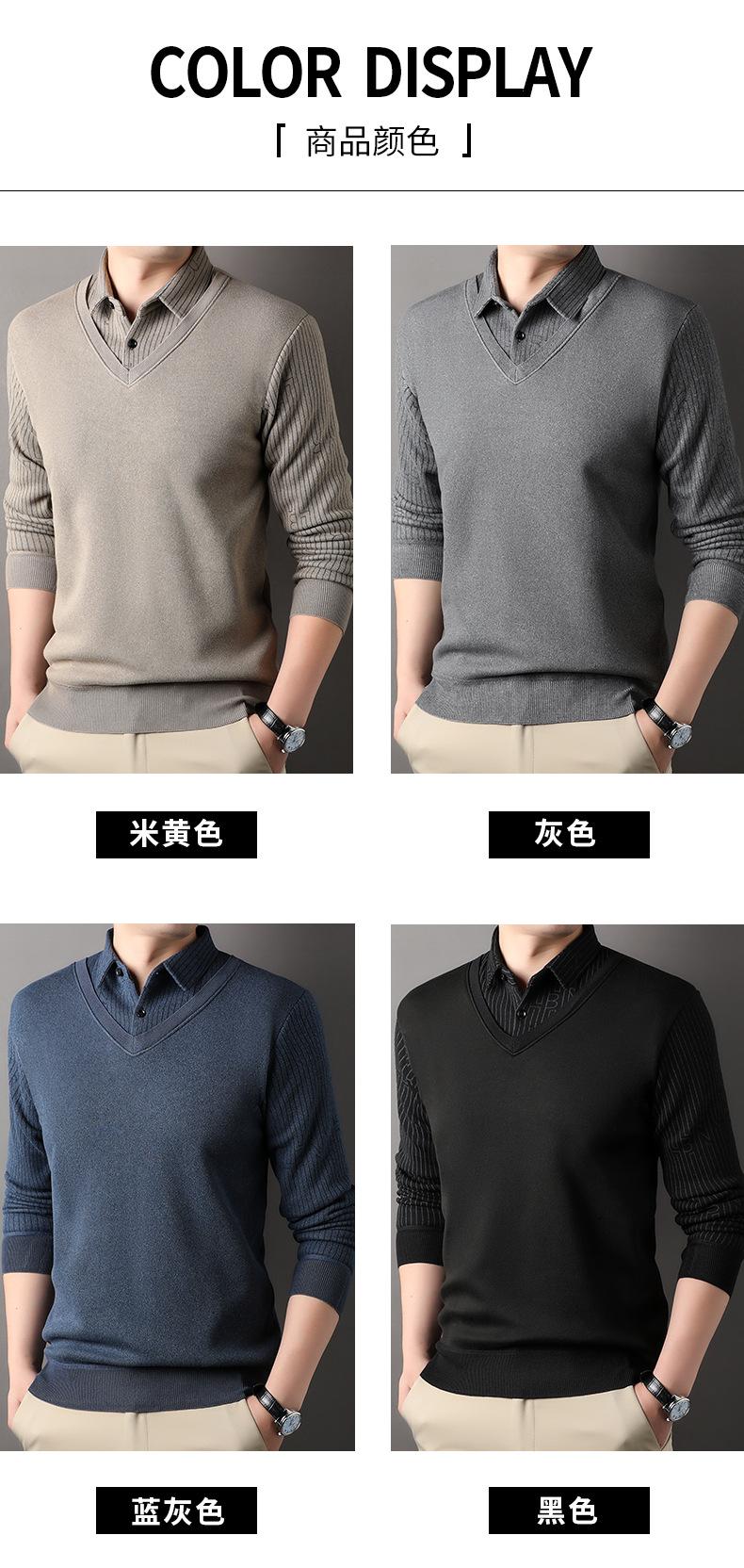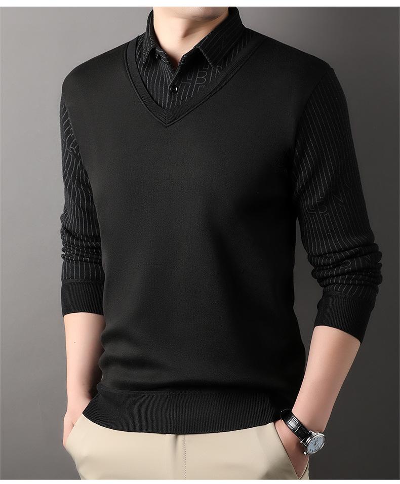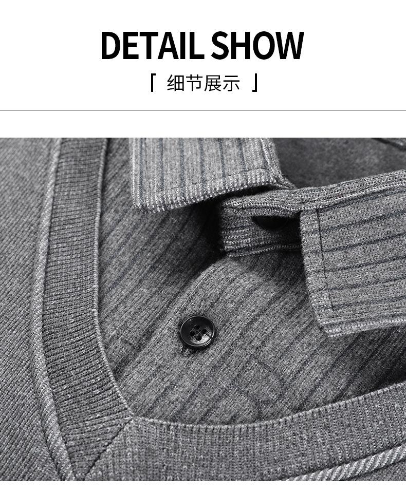 Suéter falso de duas peças masculino outono e inverno suéter de malha quente listrado gola de camisa uso interno uso externo suéter casual base camisa