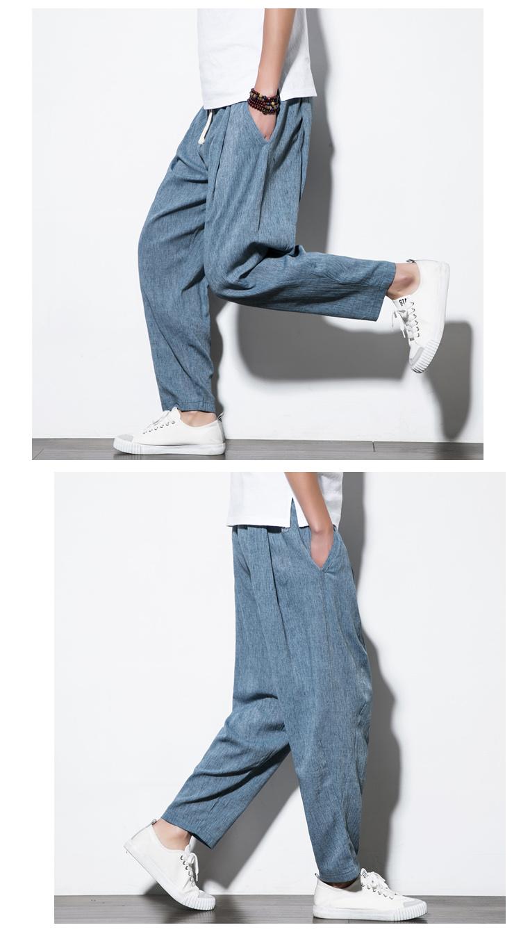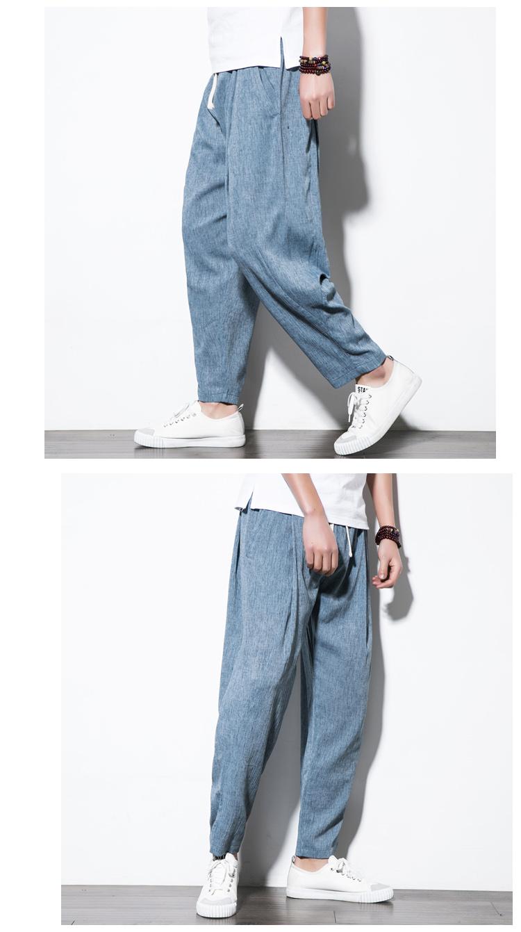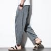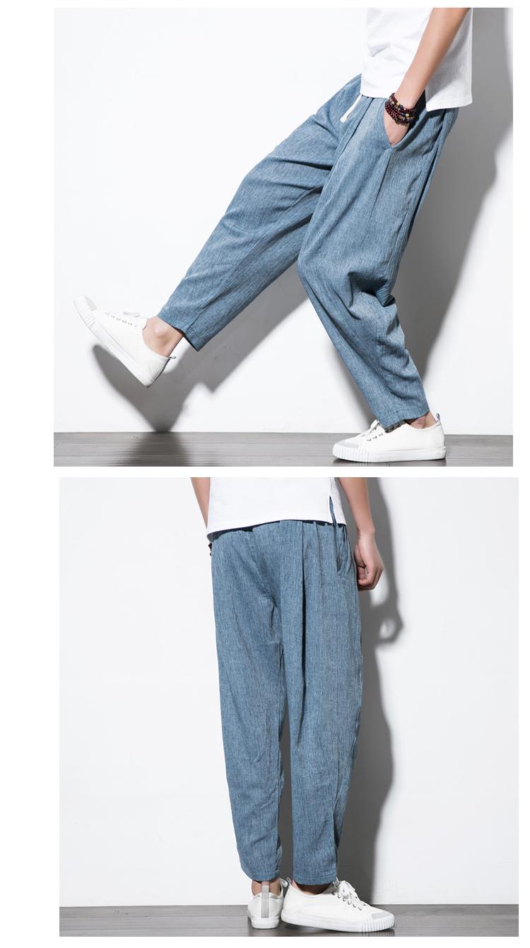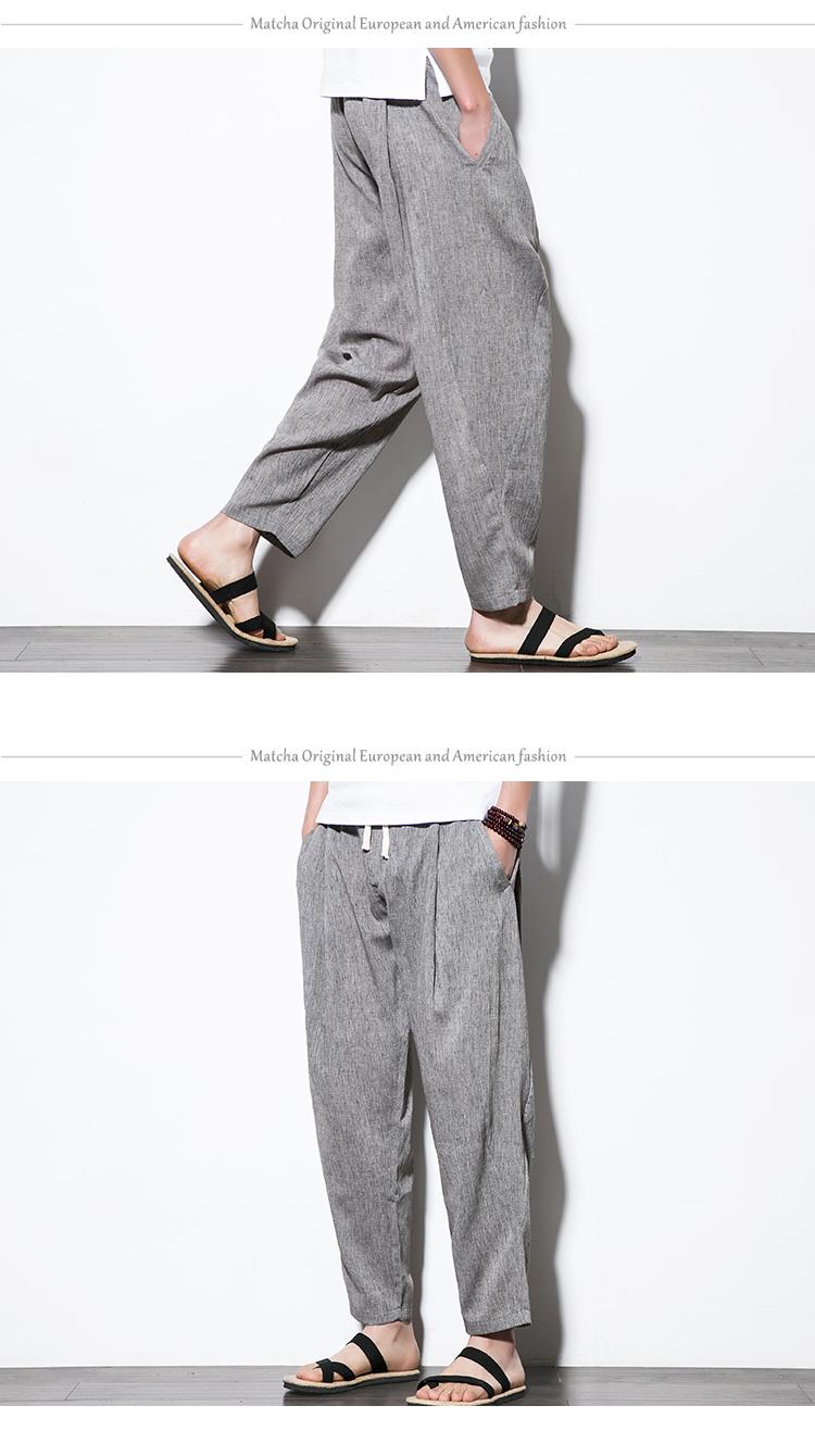 Calças de linho estilo chinês tamanho grande para uso no verão, calças casuais finas e soltas para homens, calças harém de algodão e linho, atacado