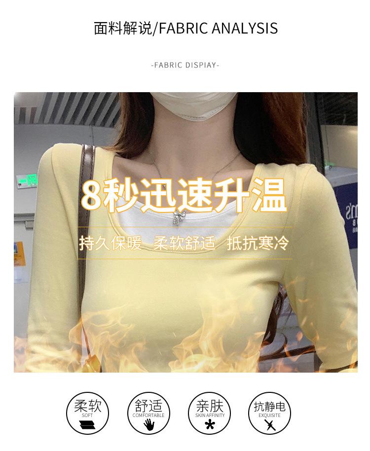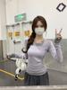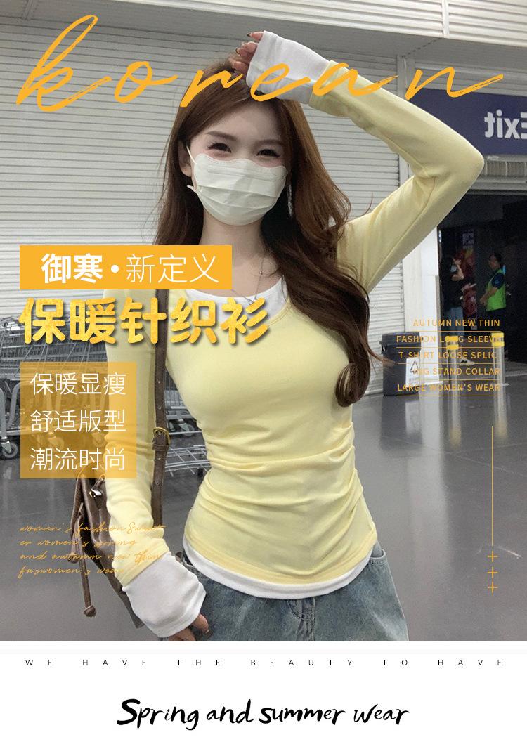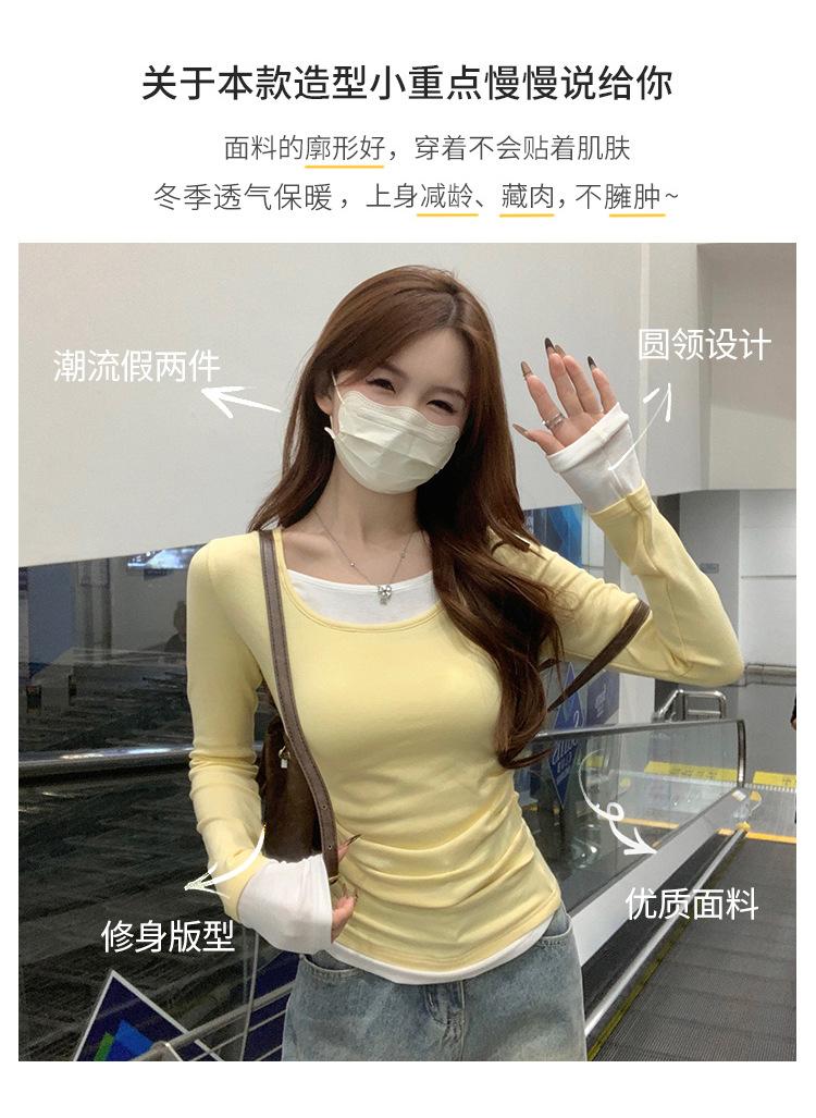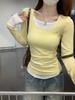 Camiseta de manga comprida com costura falsa de duas peças, cor de ombro, top feminino, primavera e outono, slim fit, emagrecimento, puro desejo, base interna, camisa