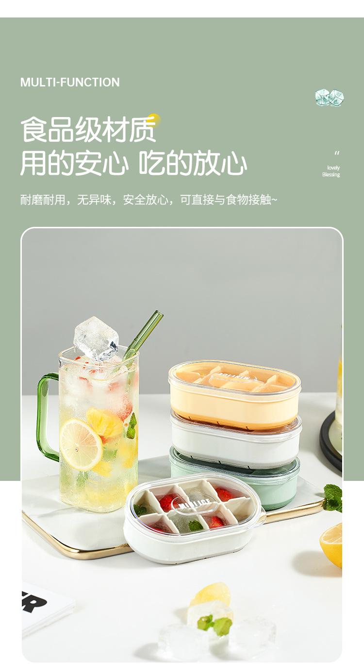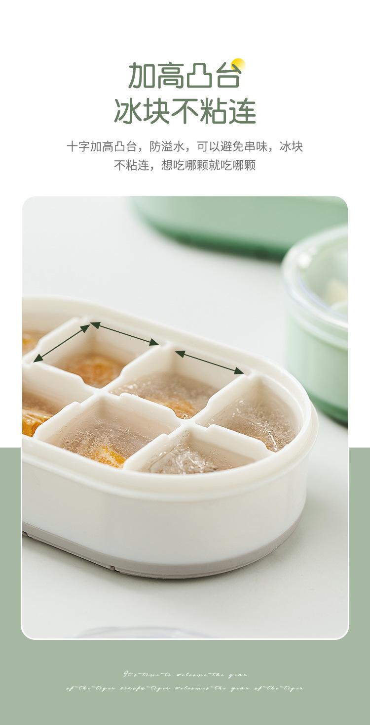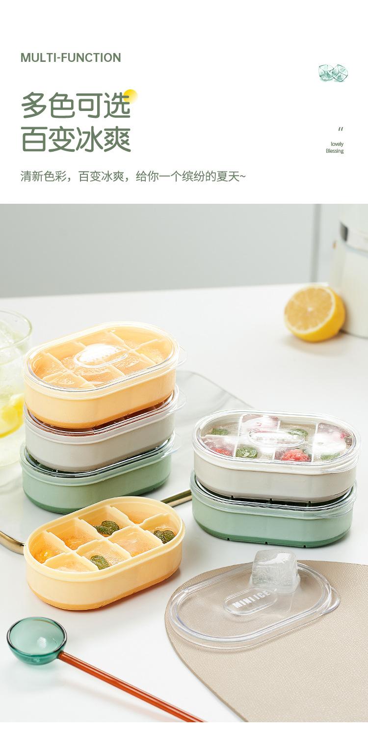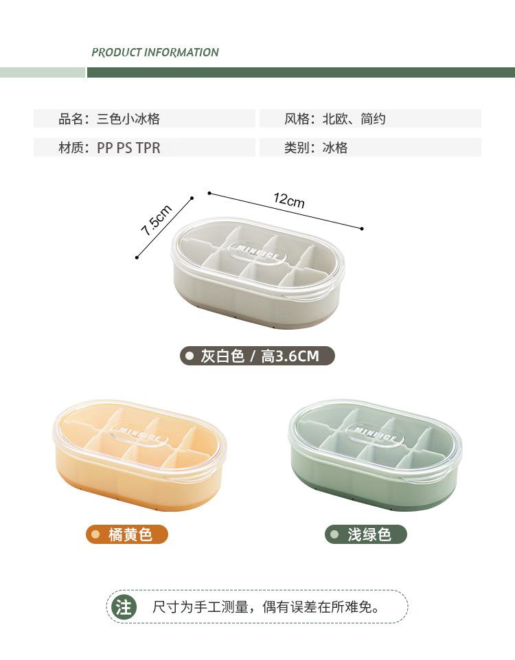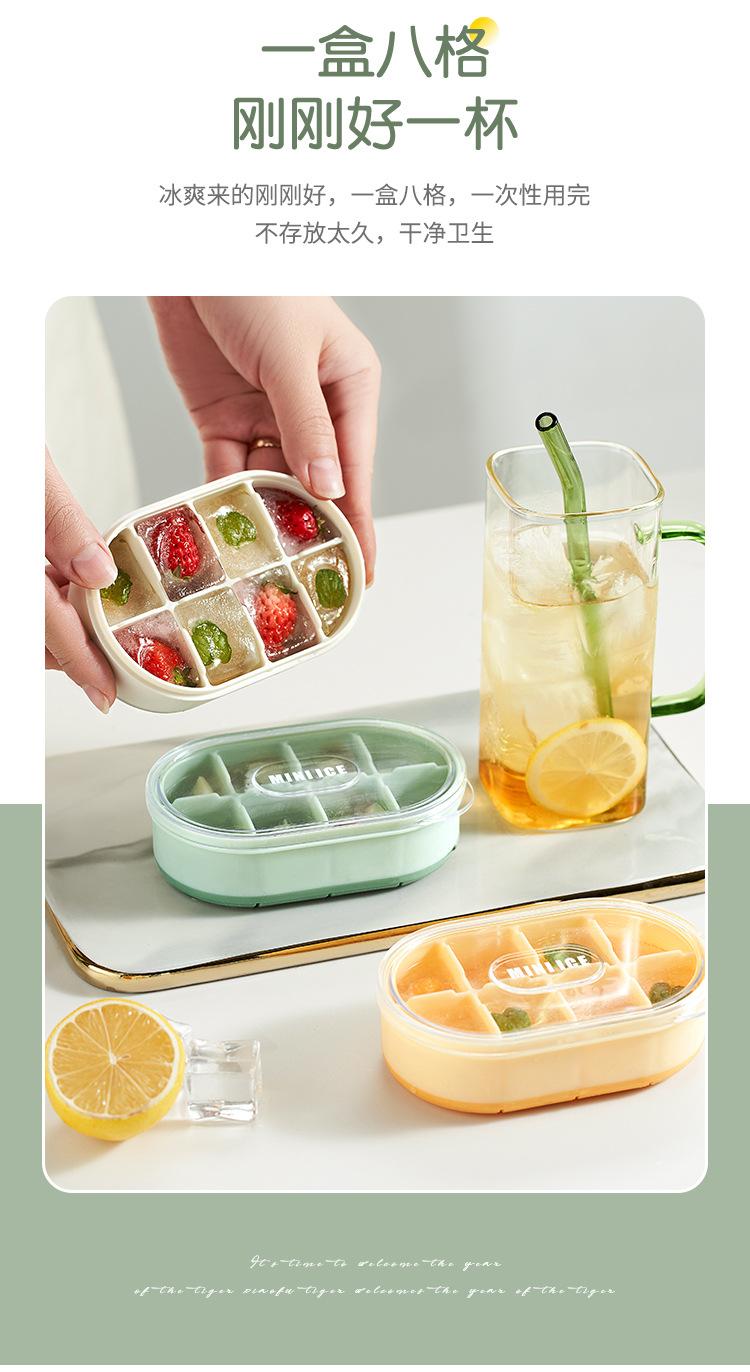 Nome do produto: Caixa oval com 8 compartimentos para cubos de gelo caseiros com tampa de proteção contra poeira visível e bandeja de gelo de fundo macio de silicone
