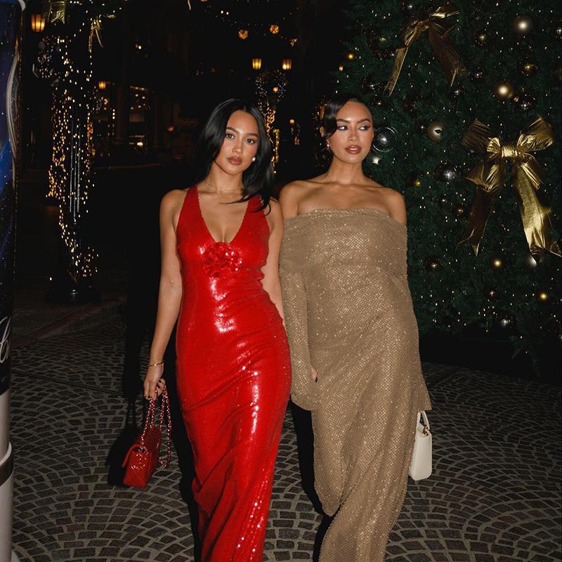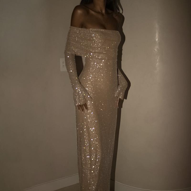 Compre Outono 2024 Moda Sexy Lantejoulas Elegante Vestido Quadril Slim-fit Gola de uma palavra Chifre Vestido de manga comprida no atacado no Joom.pro