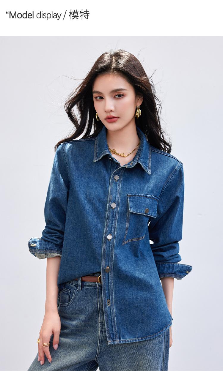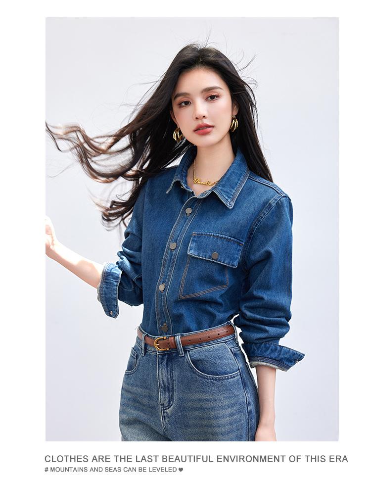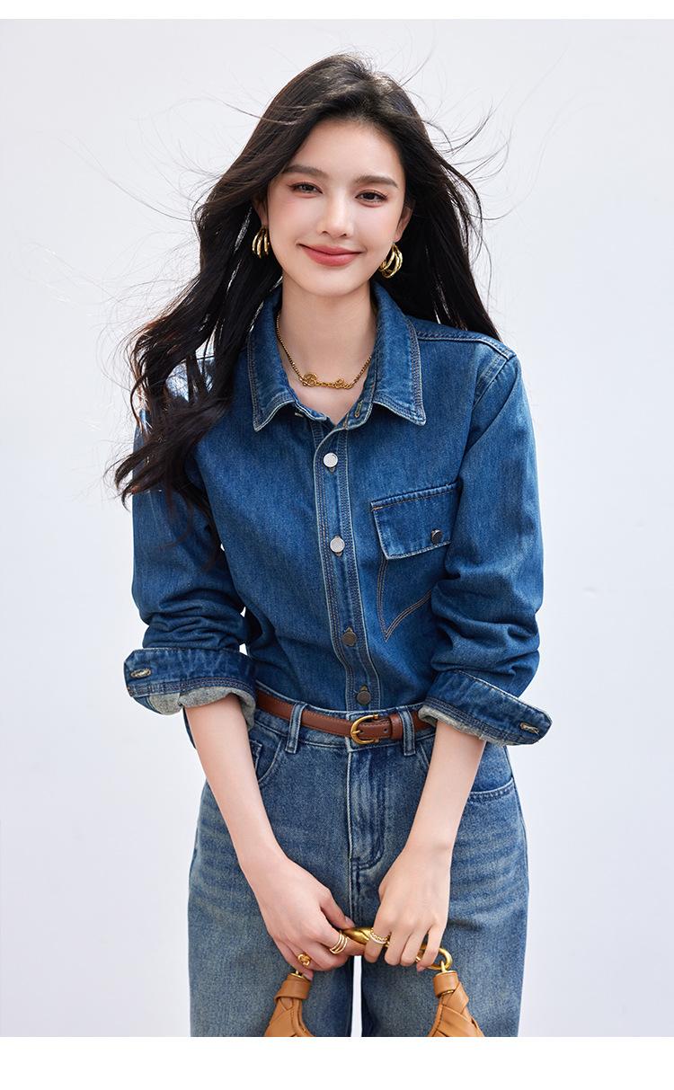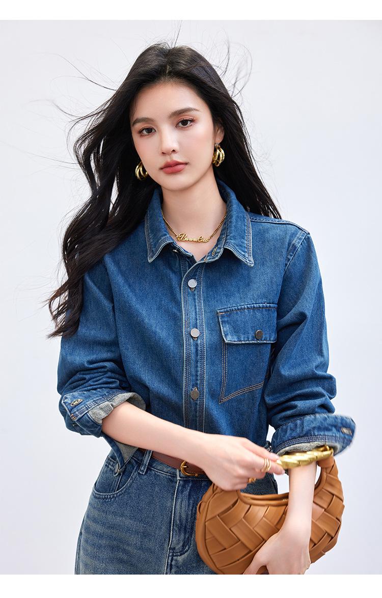 Camisa jeans feminina de bolso único com estampa de giro real 2025