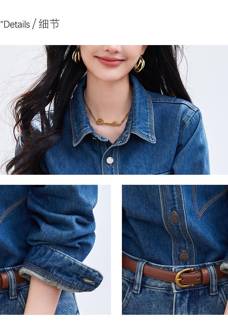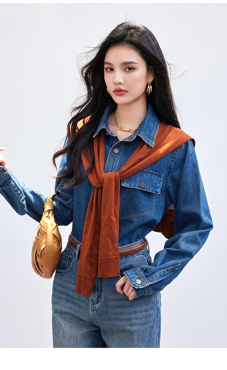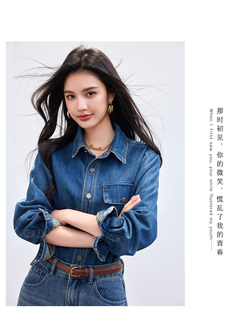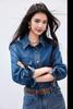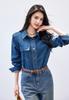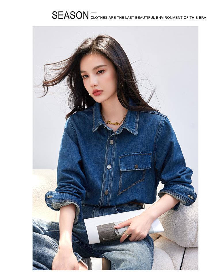 Camisa jeans feminina de bolso único com estampa de giro real 2025