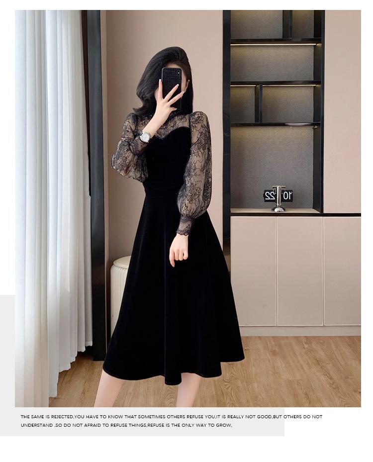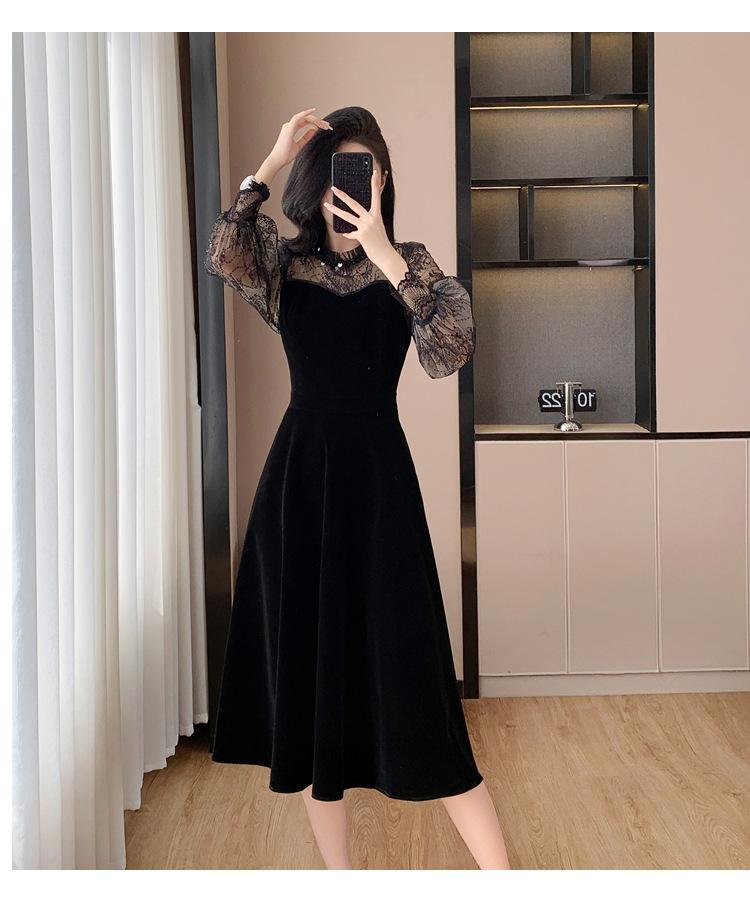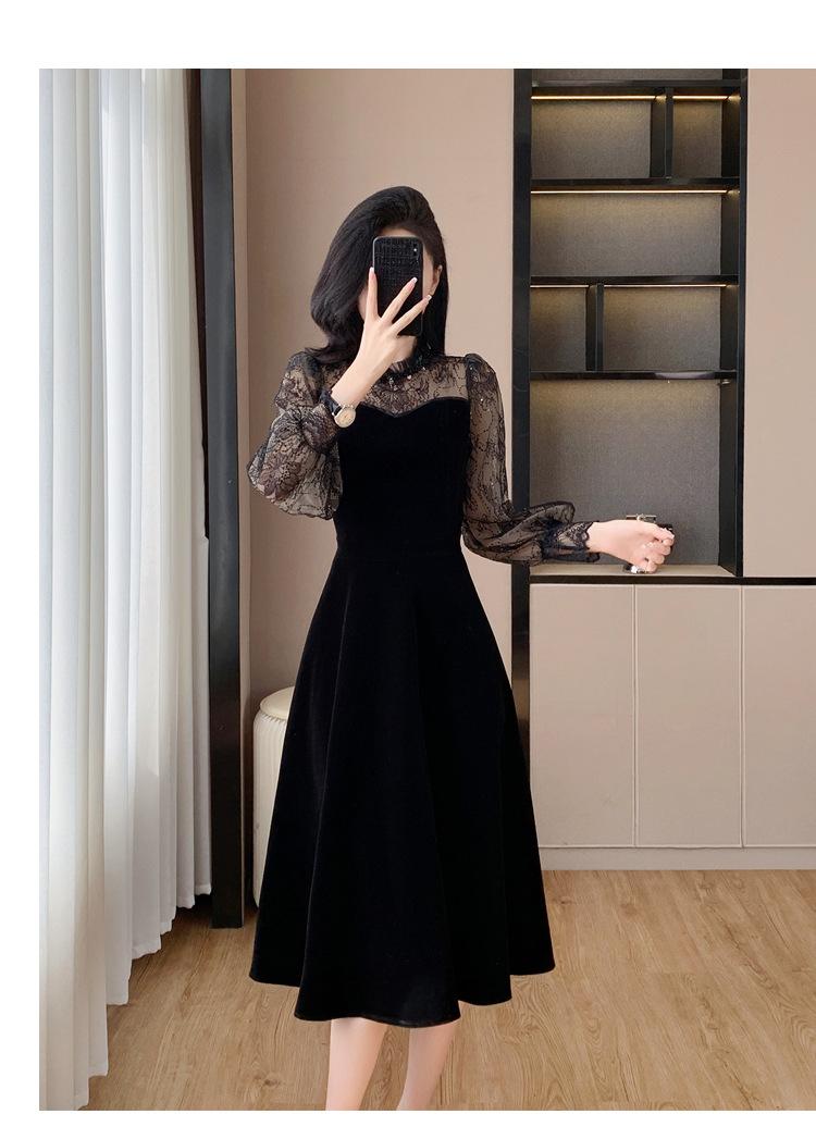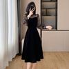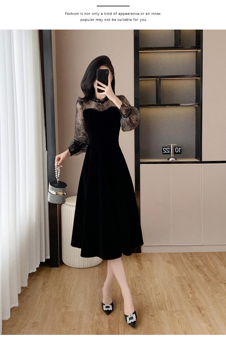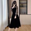 Vestido de veludo preto estilo francês Hepburn feminino outono e inverno novo estilo design sentido elegante cintura justa emagrecimento saia interna