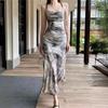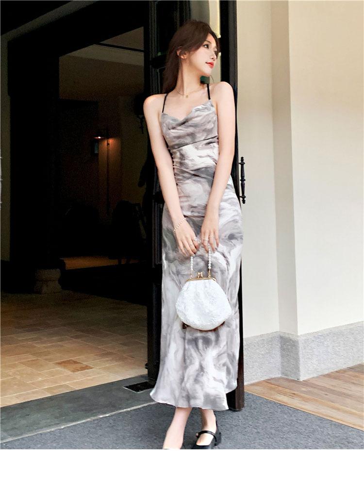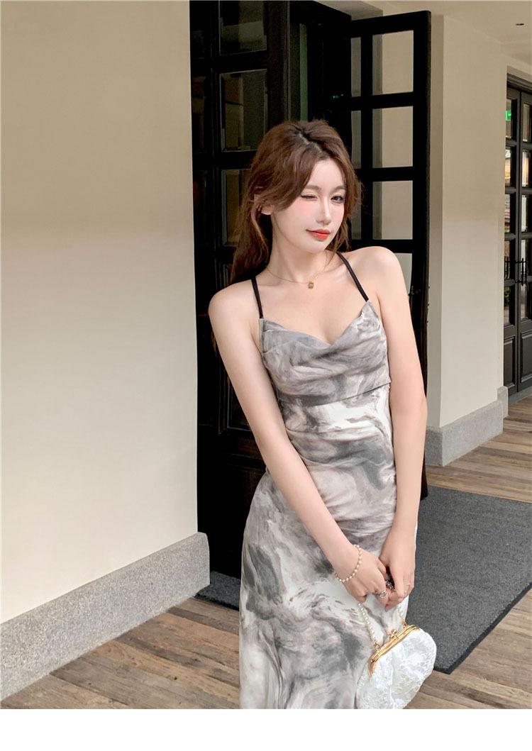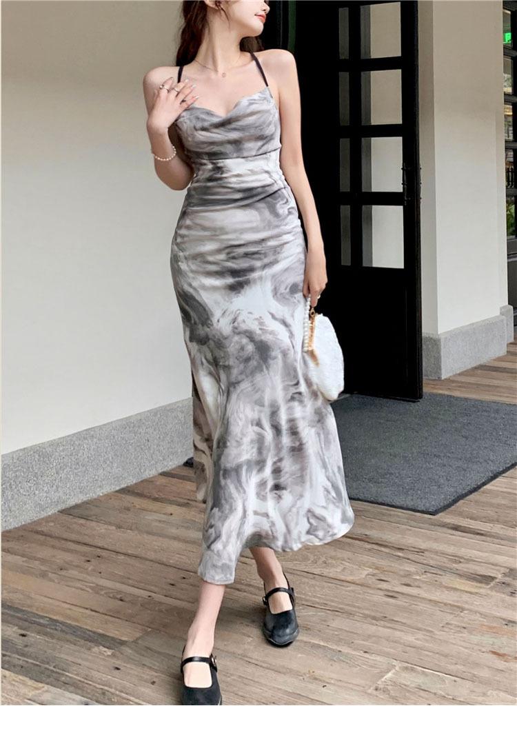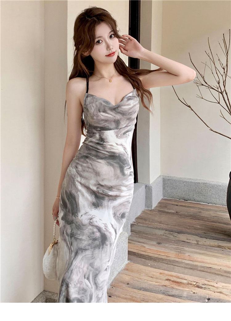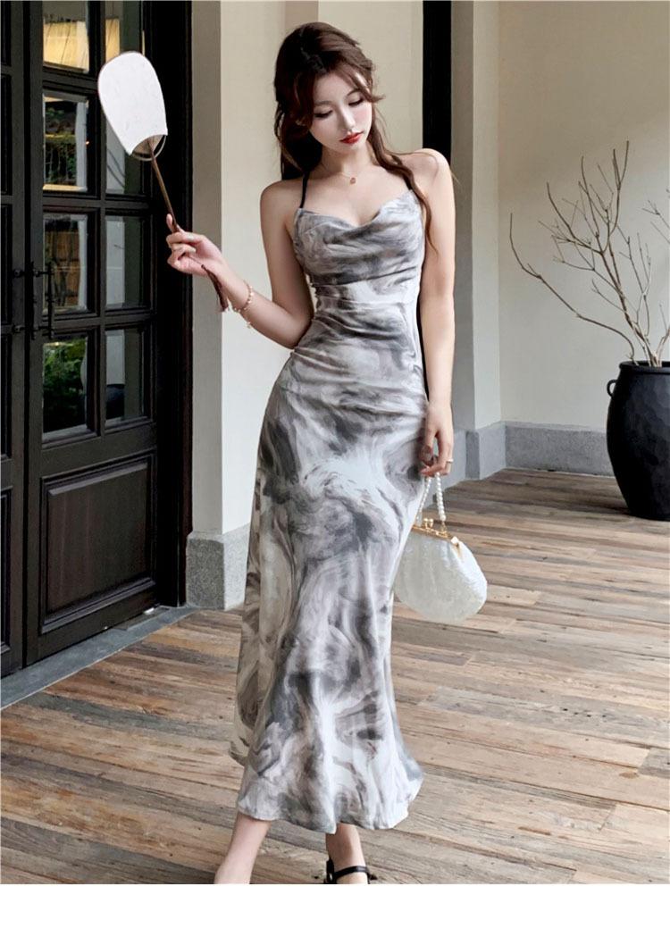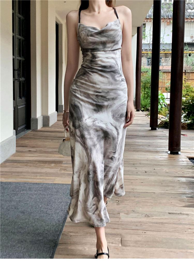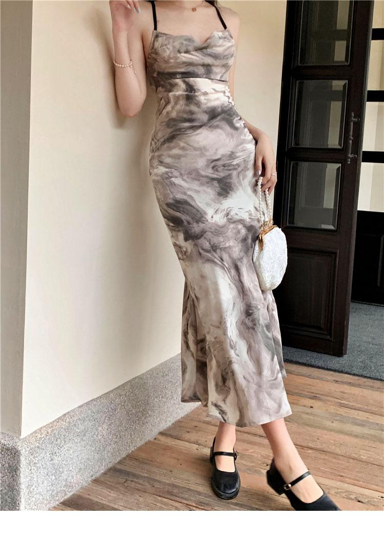 Compre Vestido estilo desejo puro com estampa de tinta francesa, estilo retrô slim, sem costas, estilo tie-dye no atacado no Joom.pro