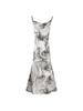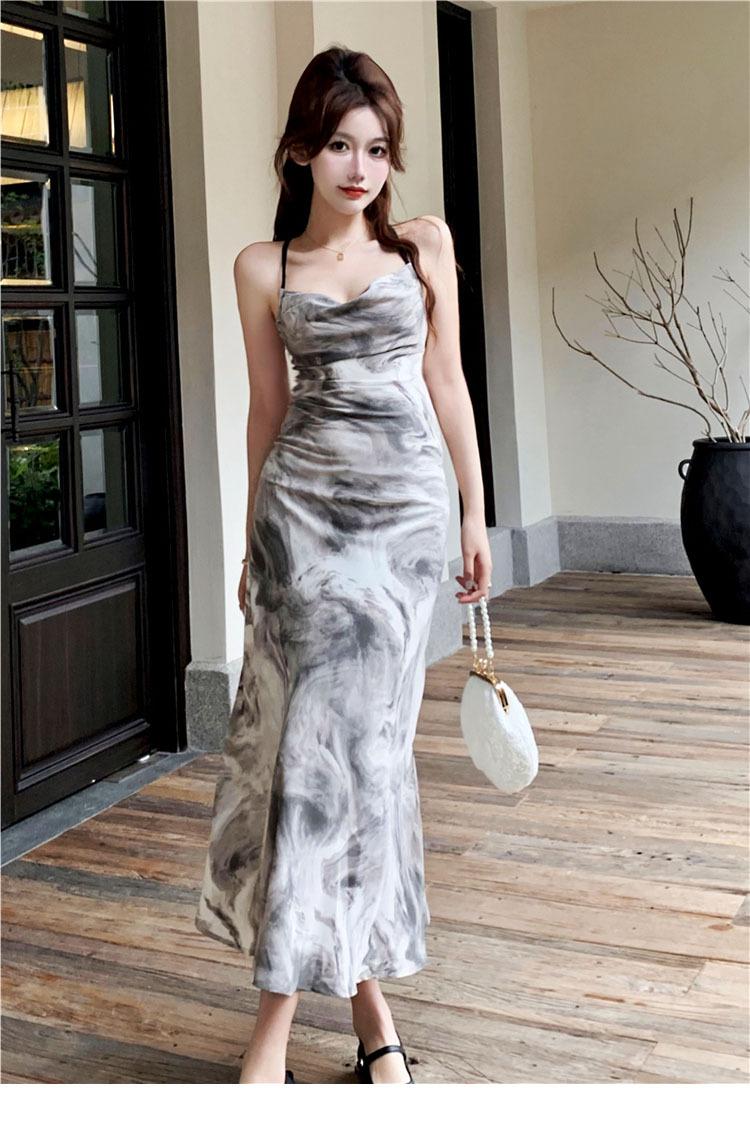 Vestido estilo desejo puro com estampa de tinta francesa, estilo retrô slim, sem costas, estilo tie-dye
