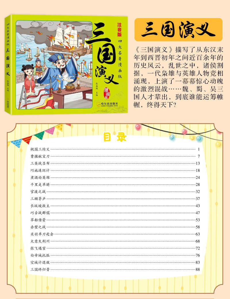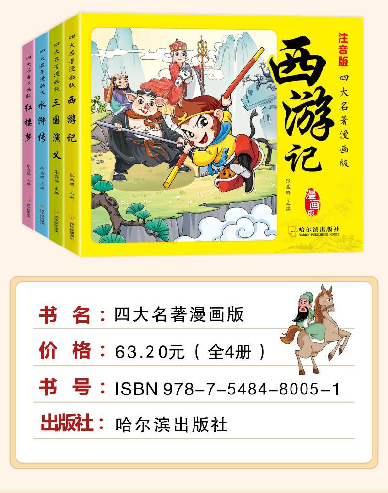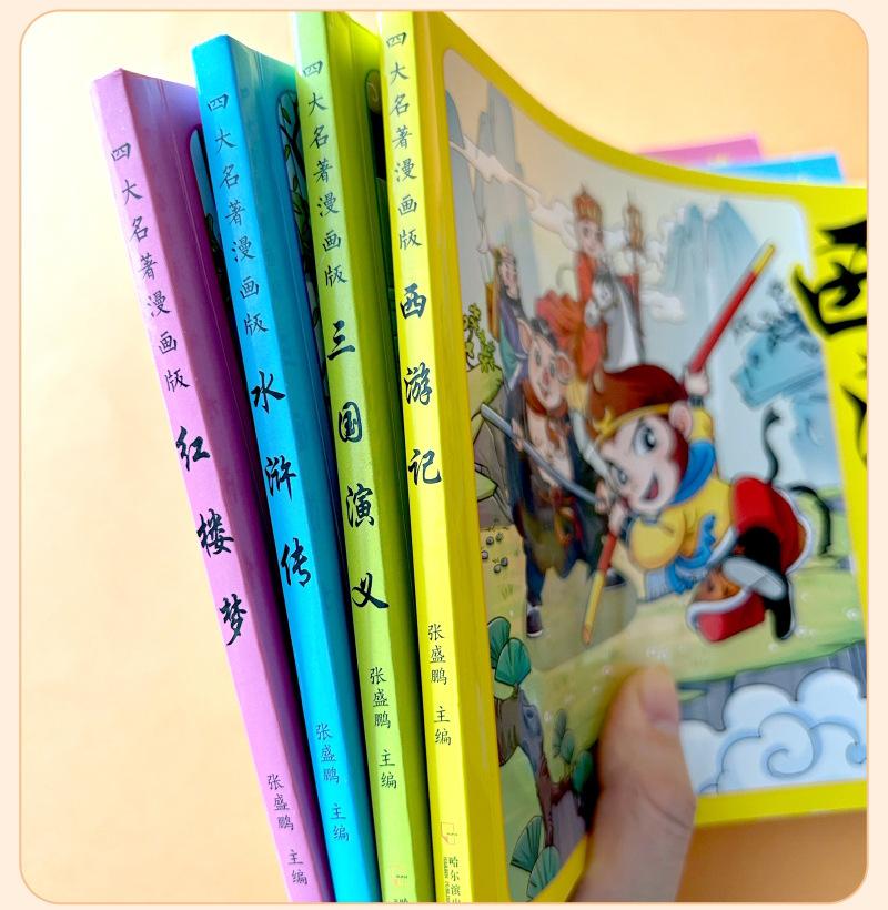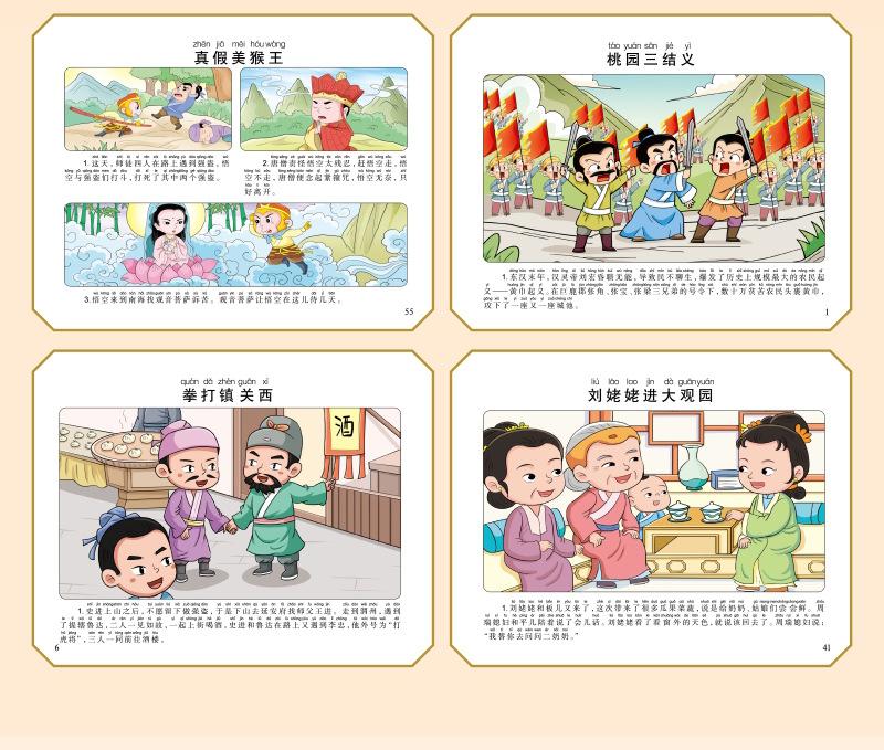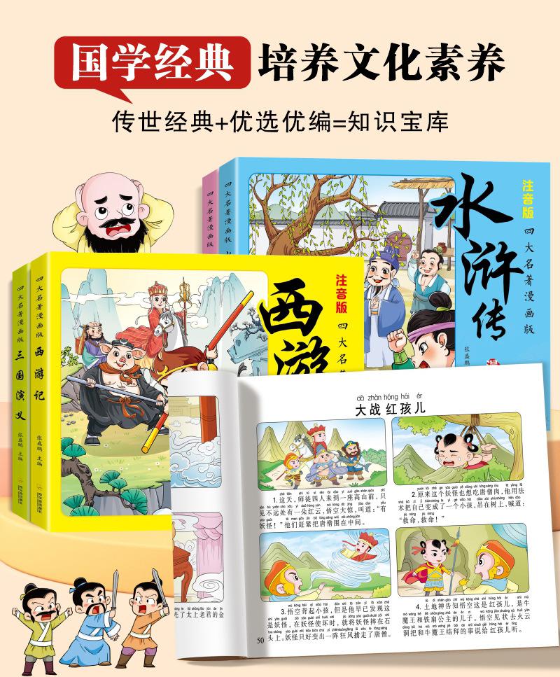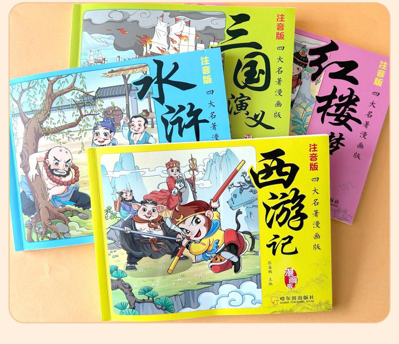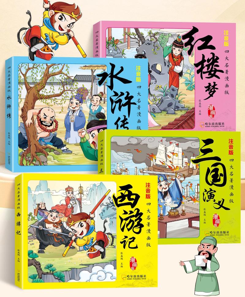 Versão em desenho animado das quatro obras-primas Histórias em quadrinhos Versão para alunos do ensino fundamental Versão fonética do Romance dos Três Reinos Margem da Água Sonho das Mansões Vermelhas Viagem ao Oeste