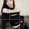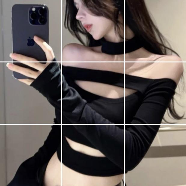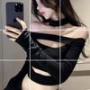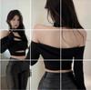 Camiseta de manga comprida com ombro sexy feminina, design de outono, nicho, ombro vazado, top curto 5163