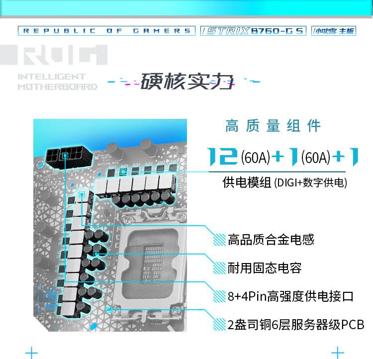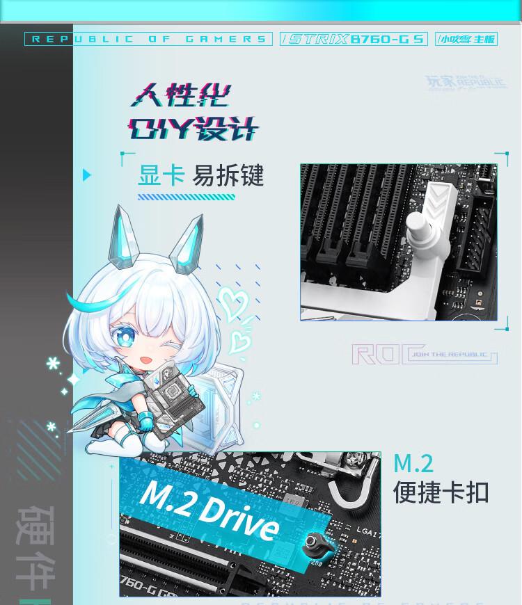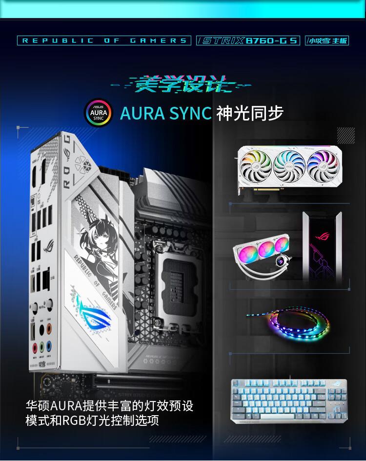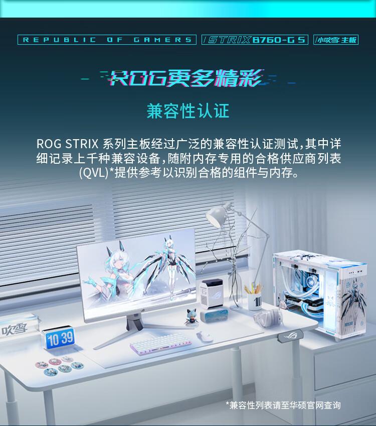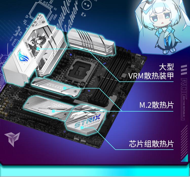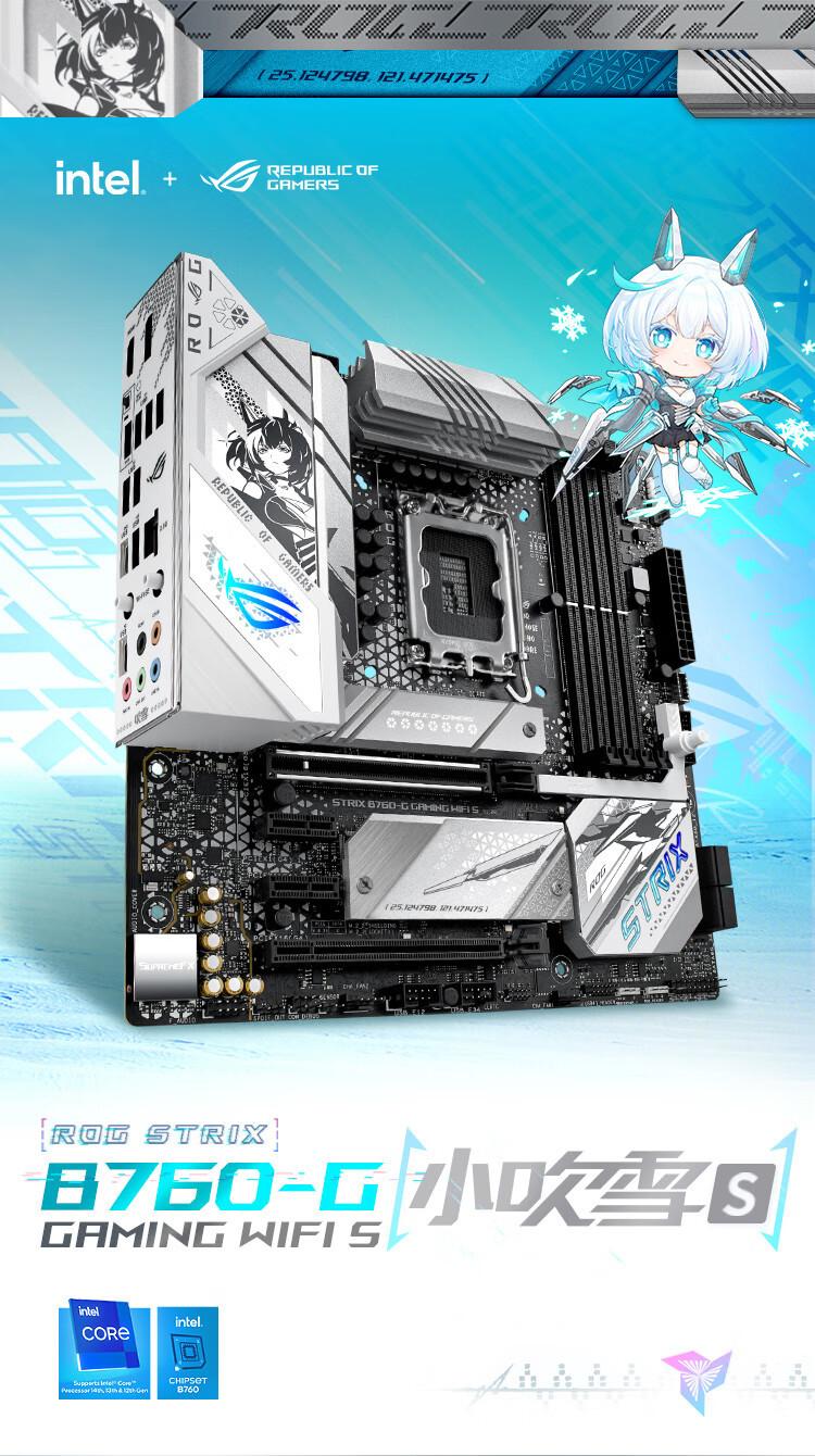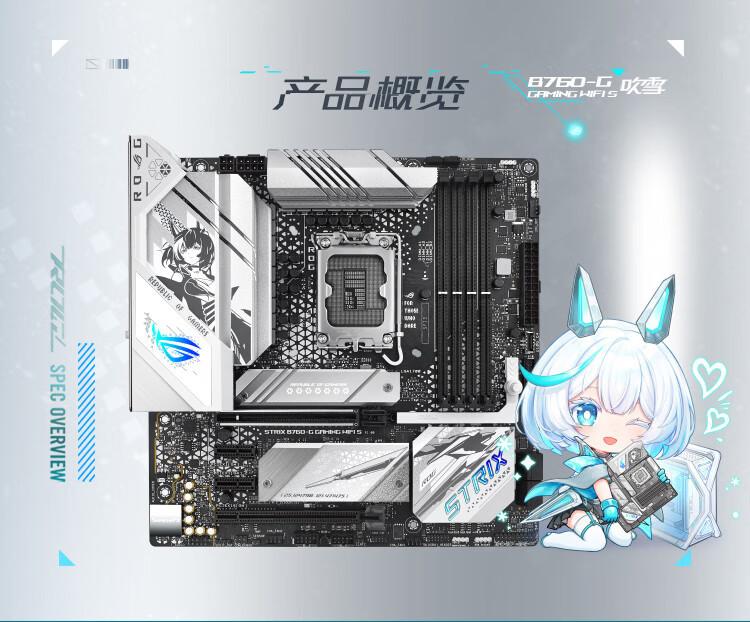 | ROG B760-G S Pequena Tempestade de Neve | B760 | 12+1+1 DrMOS | 8000+ OC | 2 | Wi-Fi 6E+2.5Gbps | ¥1.499 | Design de anime branco-prateado, forte overclocking de memória |