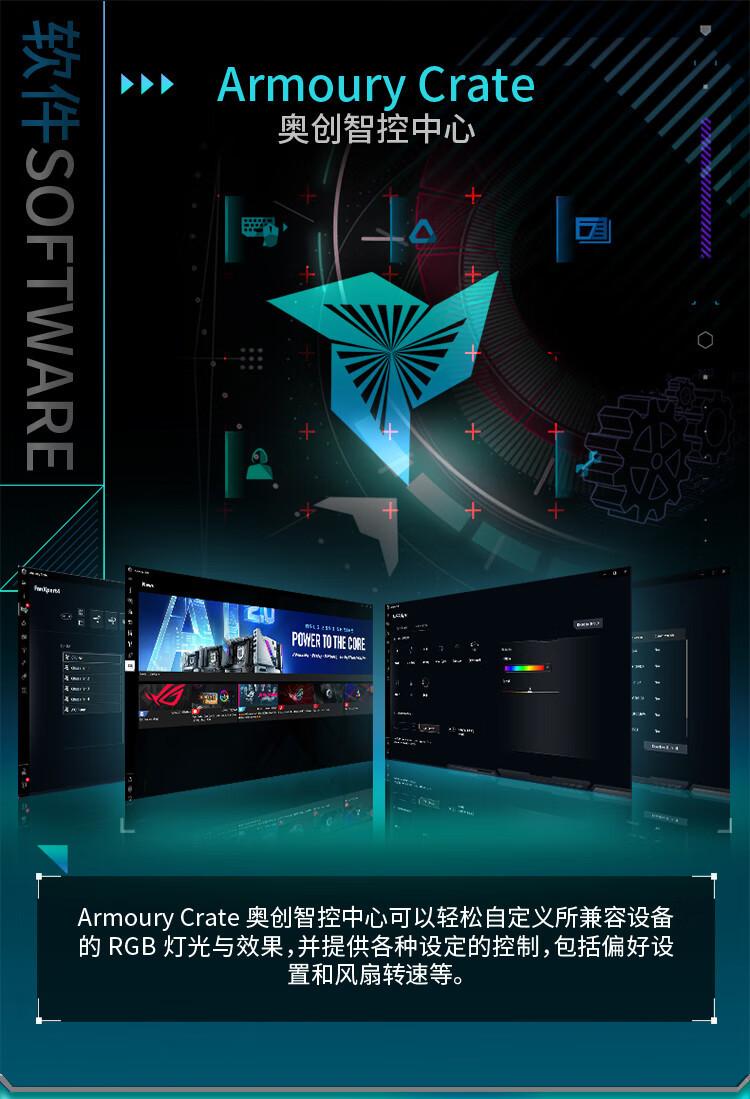 Armoury Crate: Integra Aura Sync (suporta 16,8 milhões de cores), gerenciamento de resfriamento Fan Xpert 4 e monitoramento do sistema, e pode ser vinculado a placas gráficas ASUS, gabinetes e outros hardwares.