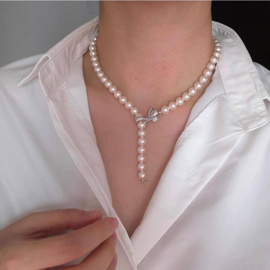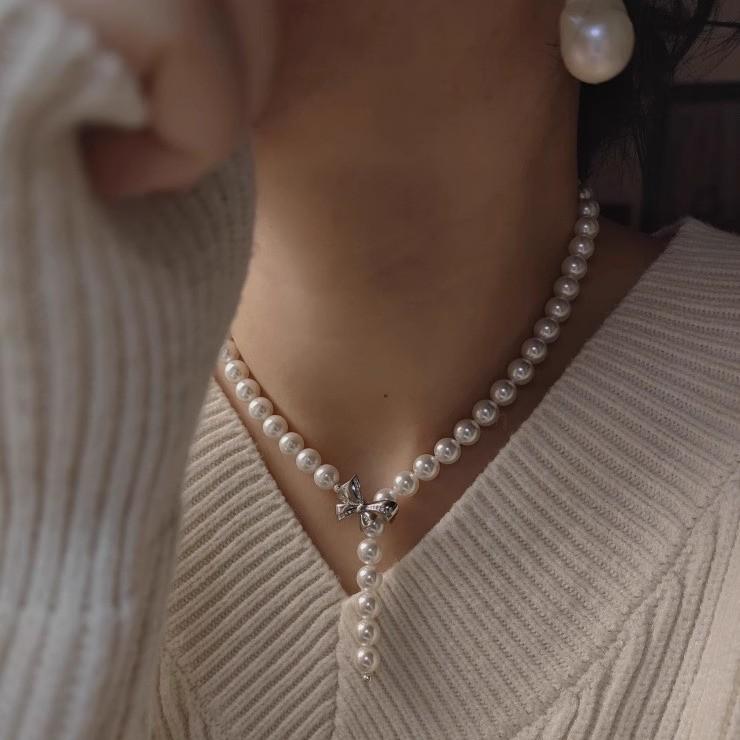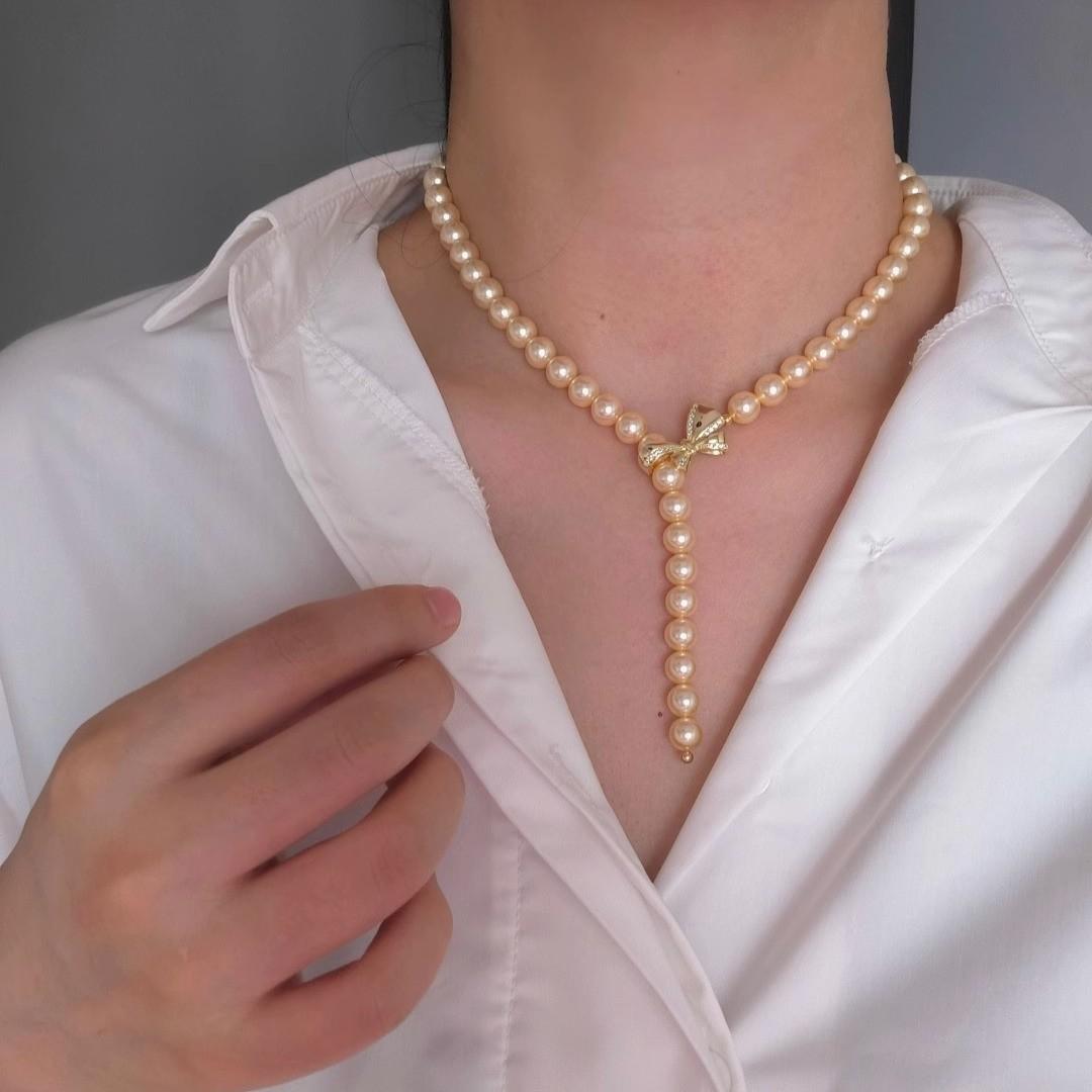 White gold bow button warm white bead necklace