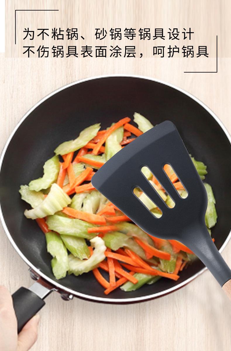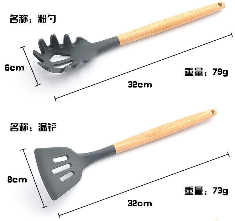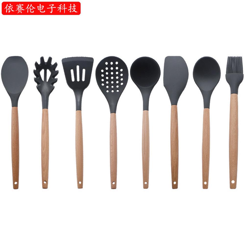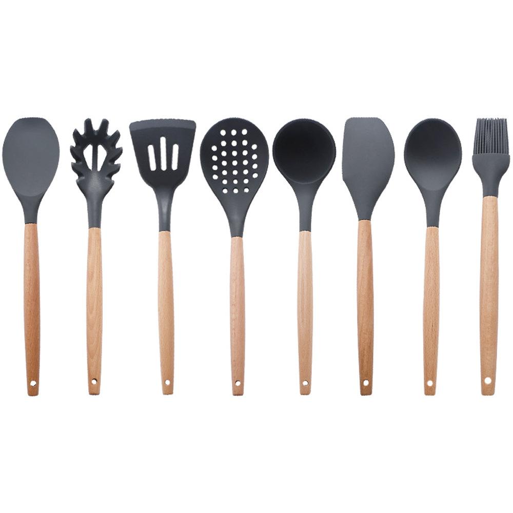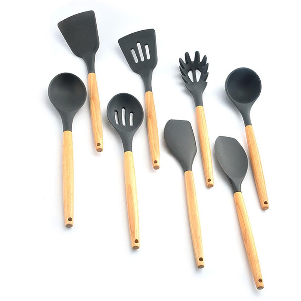 Utensílios de cozinha de silicone com cabo de madeira, 8 peças, adequado para alimentos, alta temperatura, resistente, silicone, pá, escorredor de cozinha, panela antiaderente, colher de sopa, pá