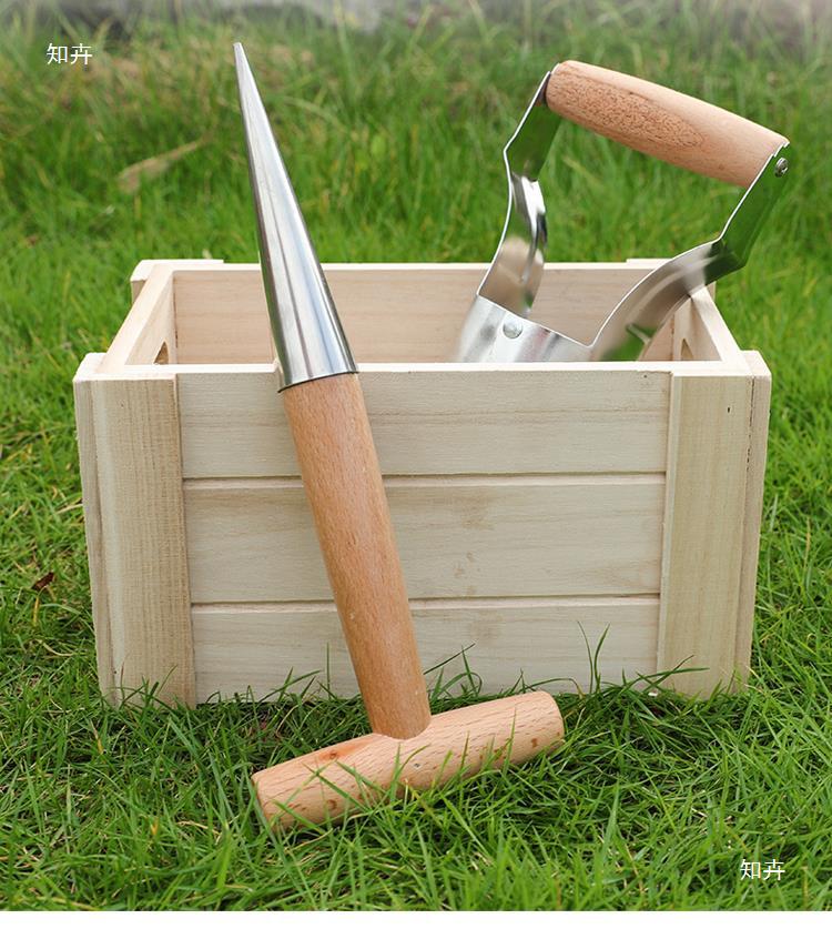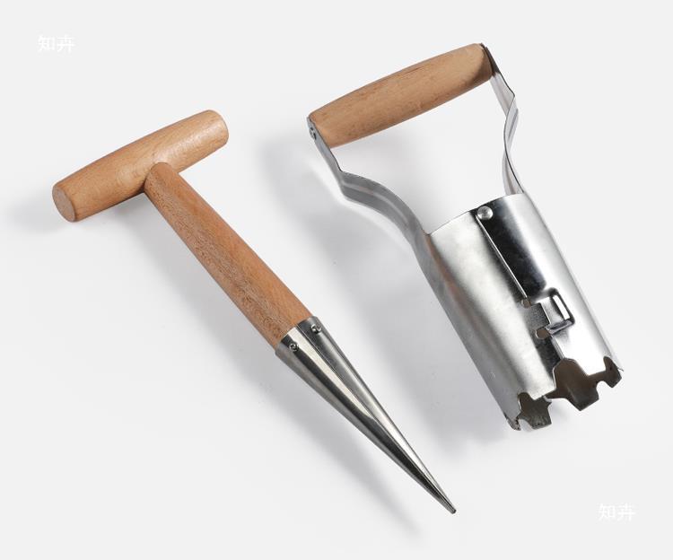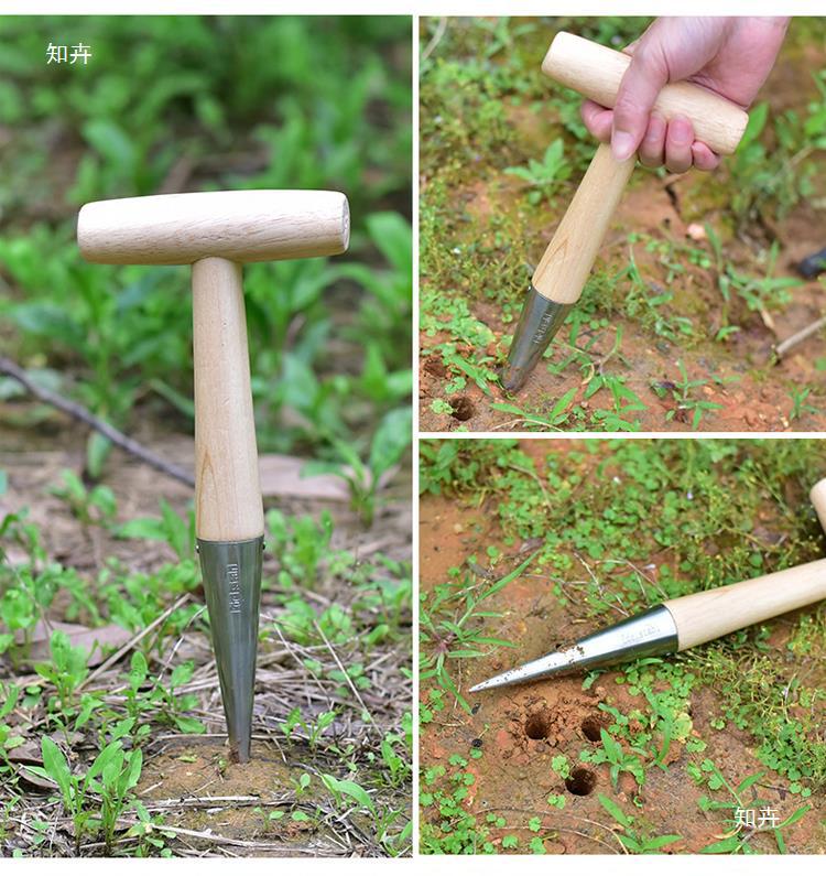 Wooden handle sowing caving device [], small seedling transplant with wooden handle, plastic seeding hole punc...