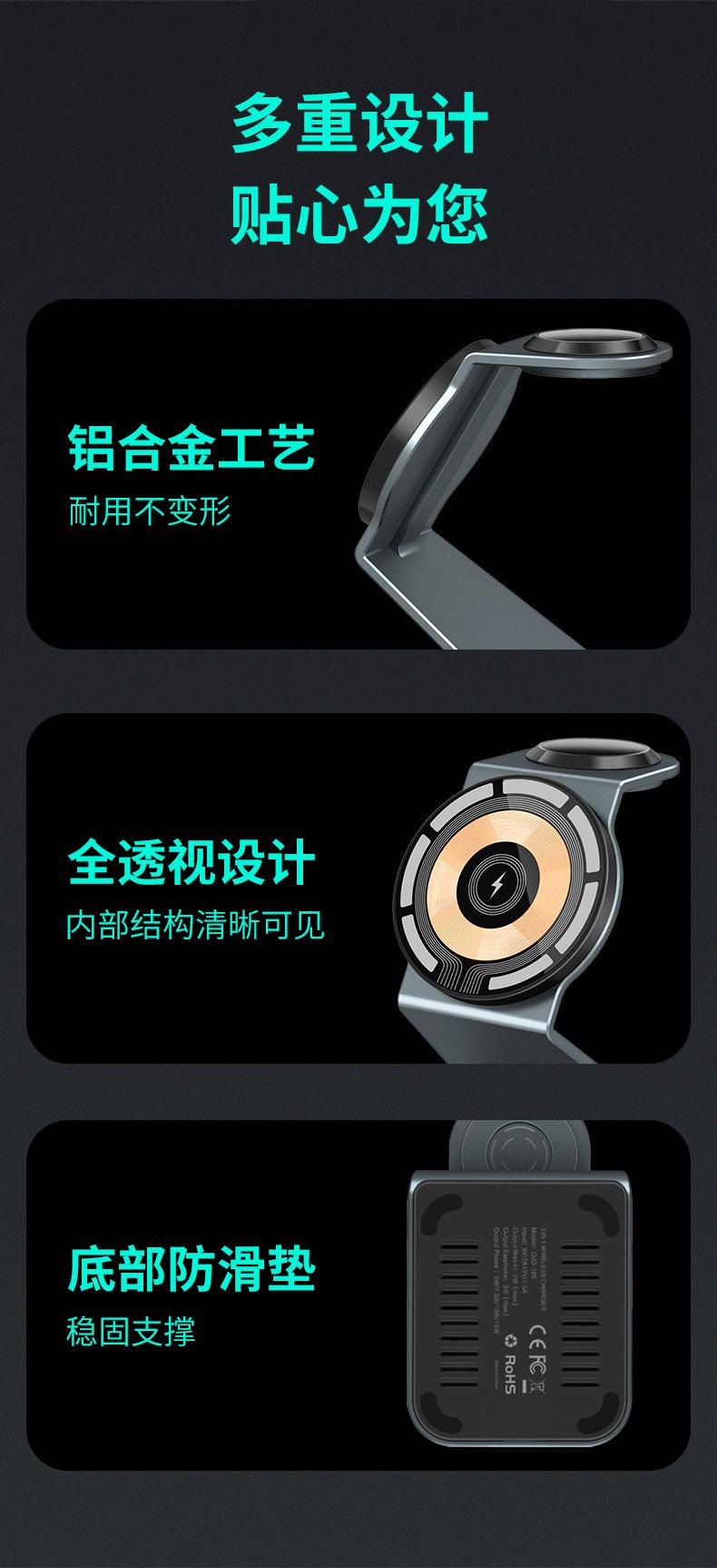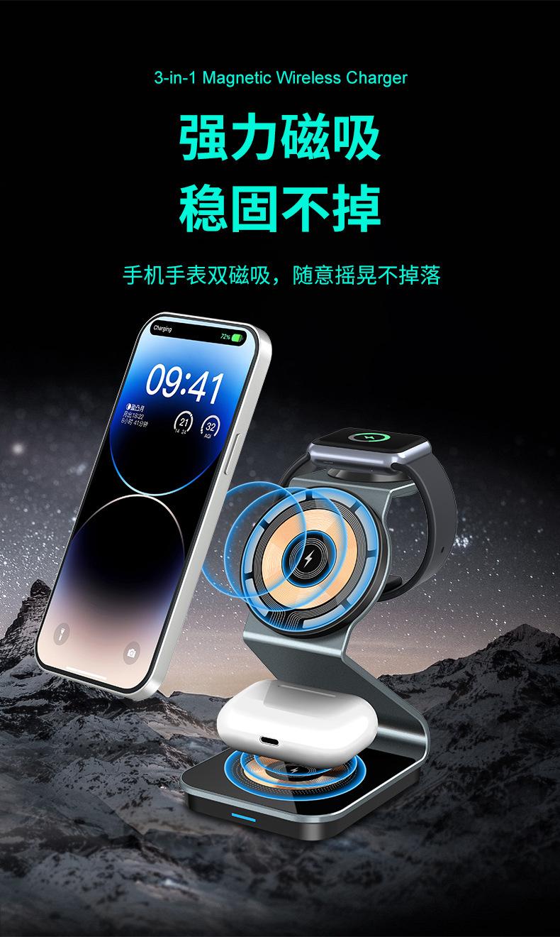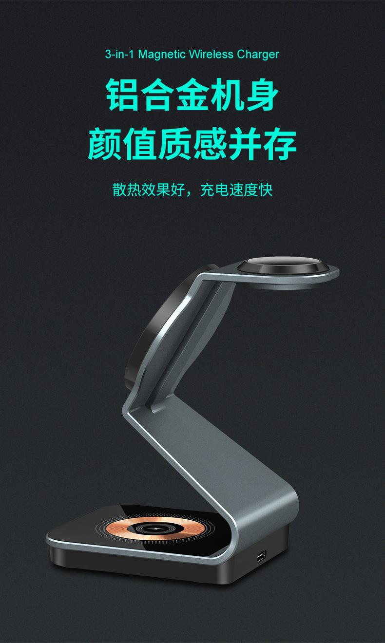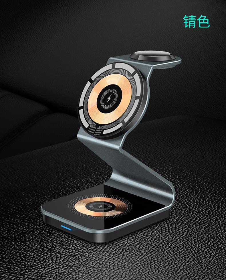 Carregador sem fio de sucção magnética de liga de alumínio, carregamento rápido para relógio de celular Apple, fone de ouvido, suporte de carregamento sem fio três em um