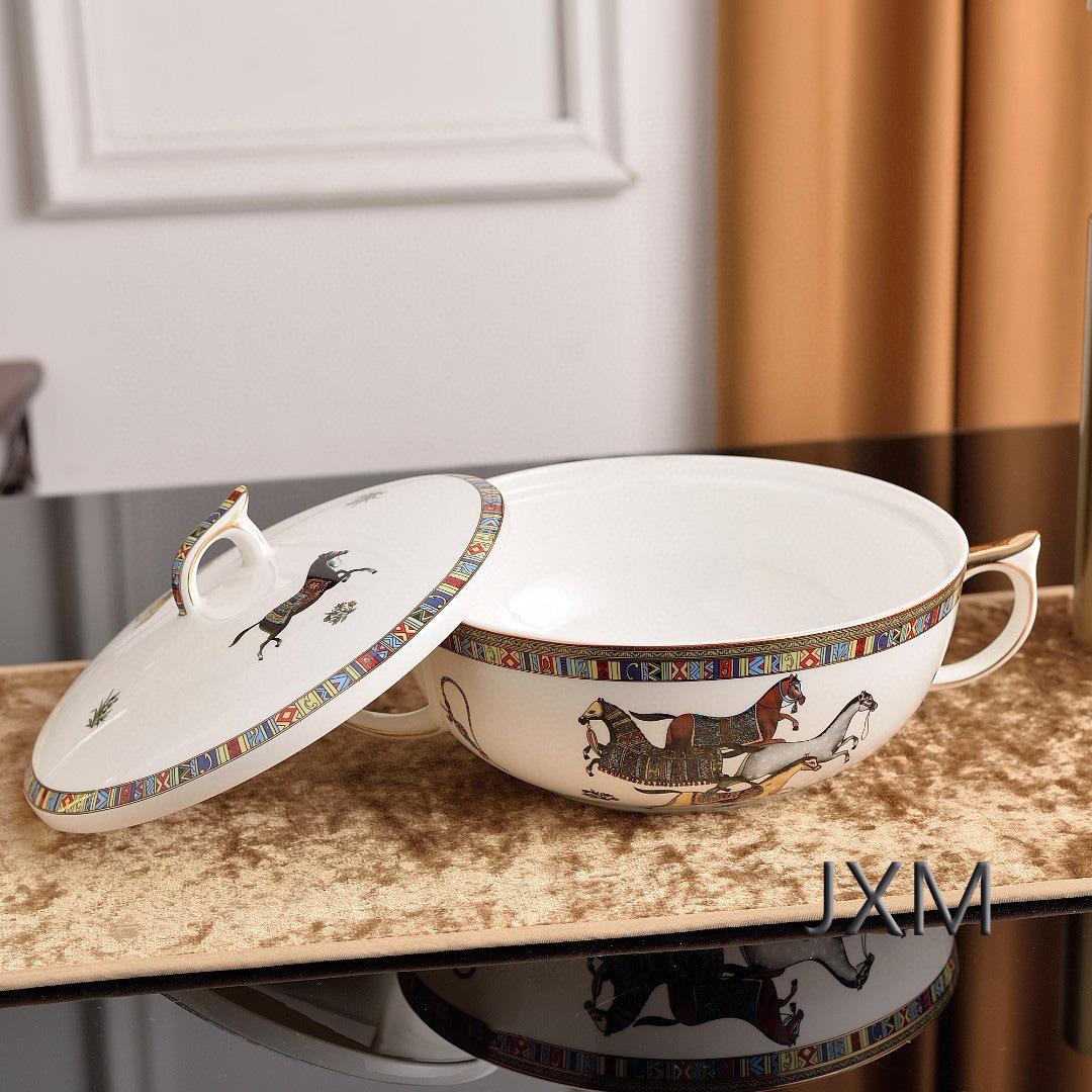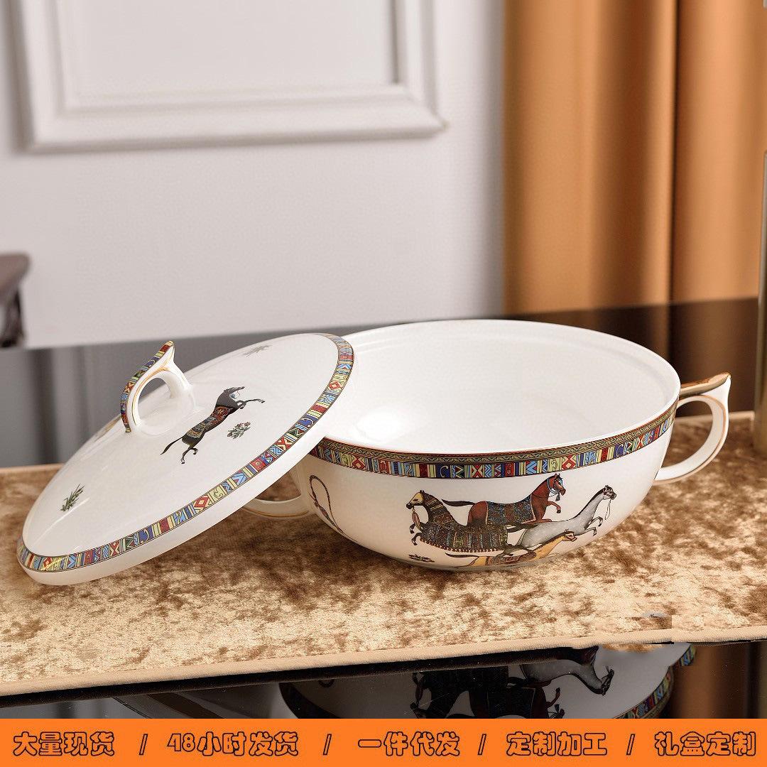 Compre H família luxo louças casa grande sopa bacia cerâmica nova dupla orelha macarrão tigela com tampa grande tigela sopa 1500ml no atacado no Joom.pro