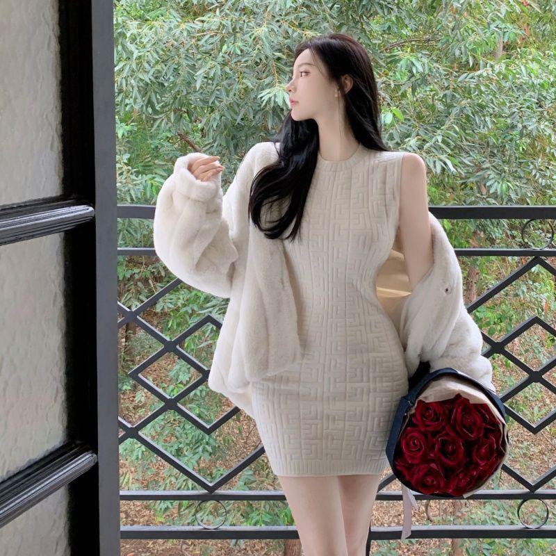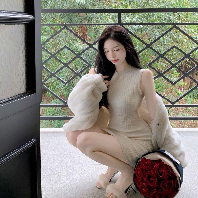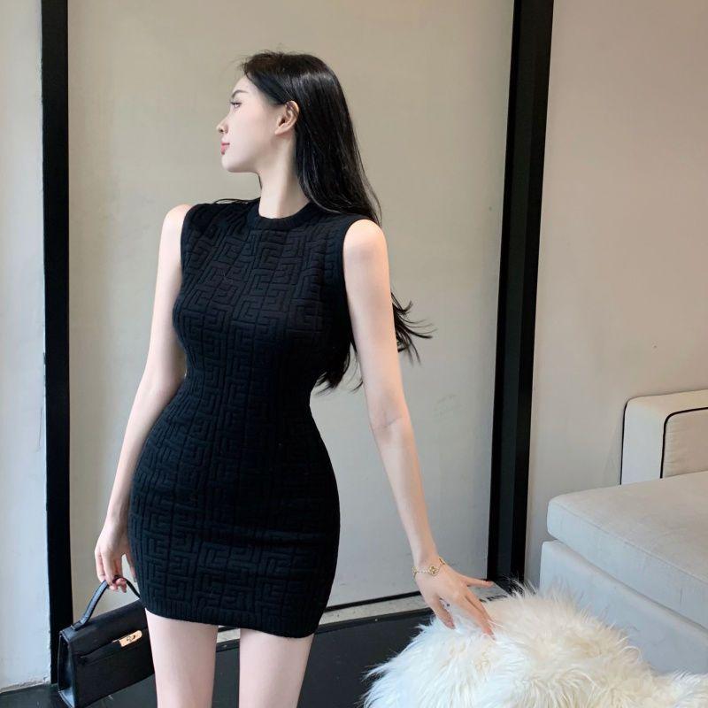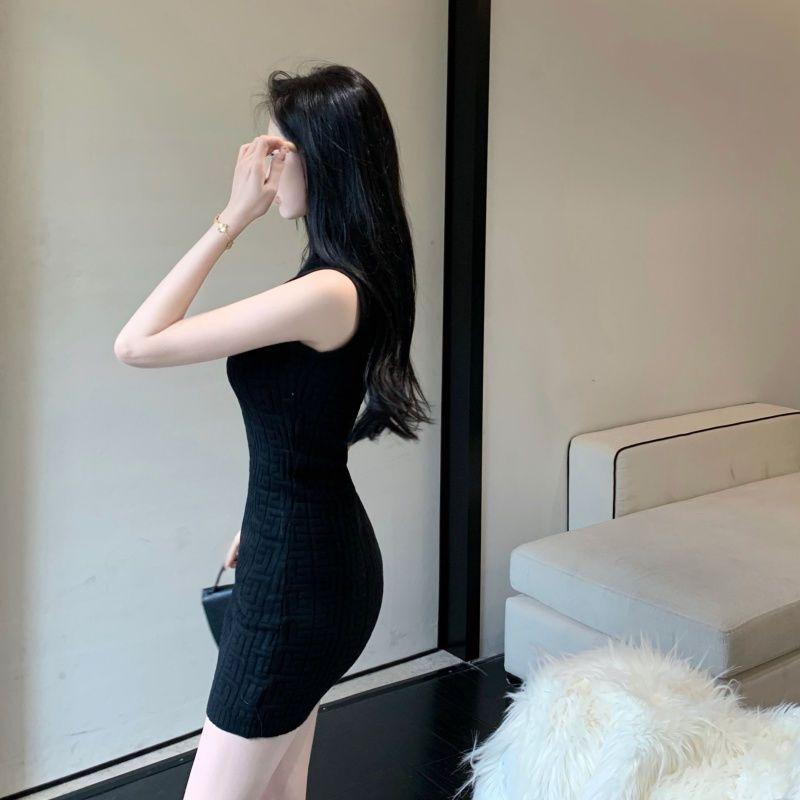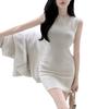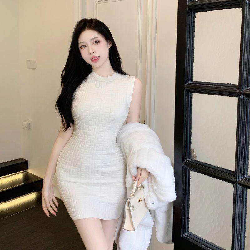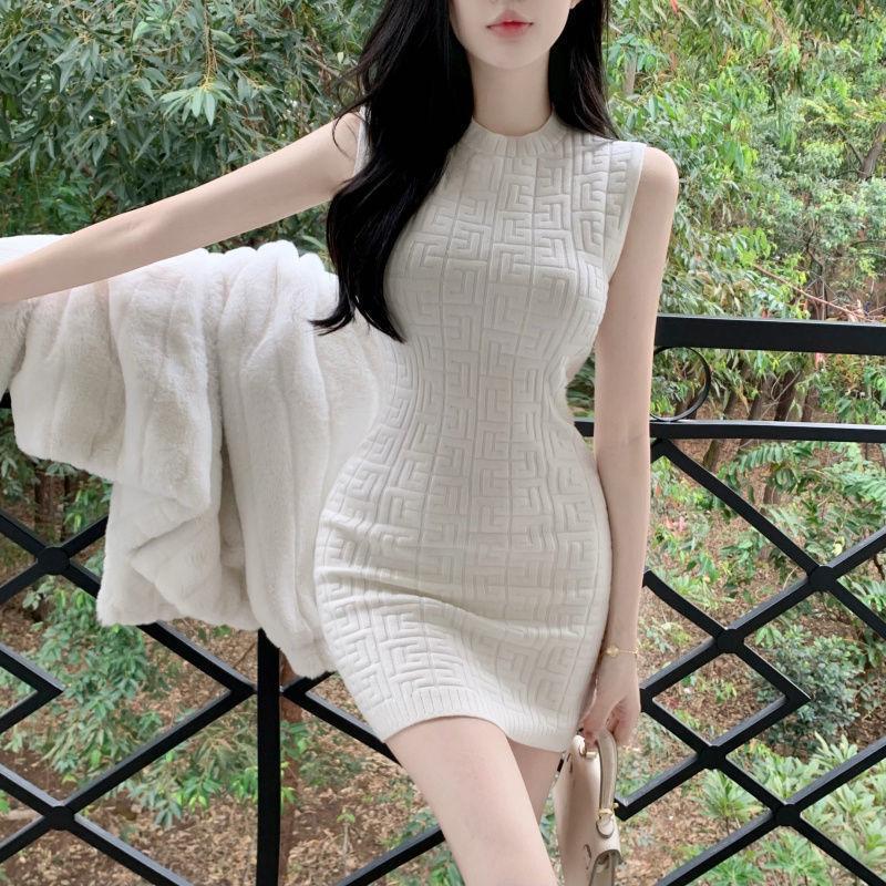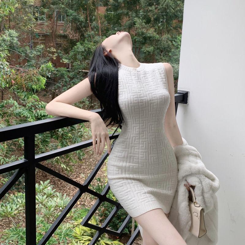 Vestido quente estilo coreano, novo verão, slim-fit, sexy, branco, malha, estilo coreano, cintura vistosa, sem mangas, saia base