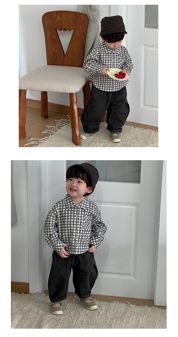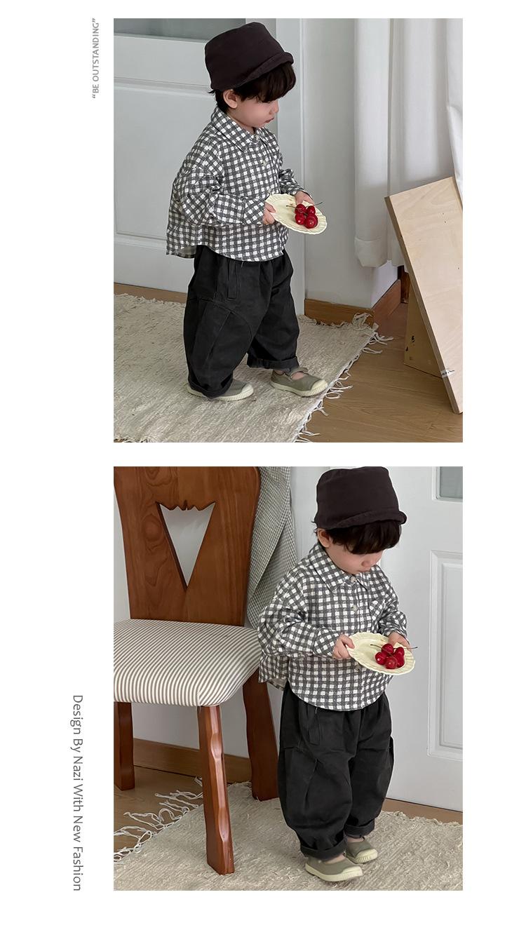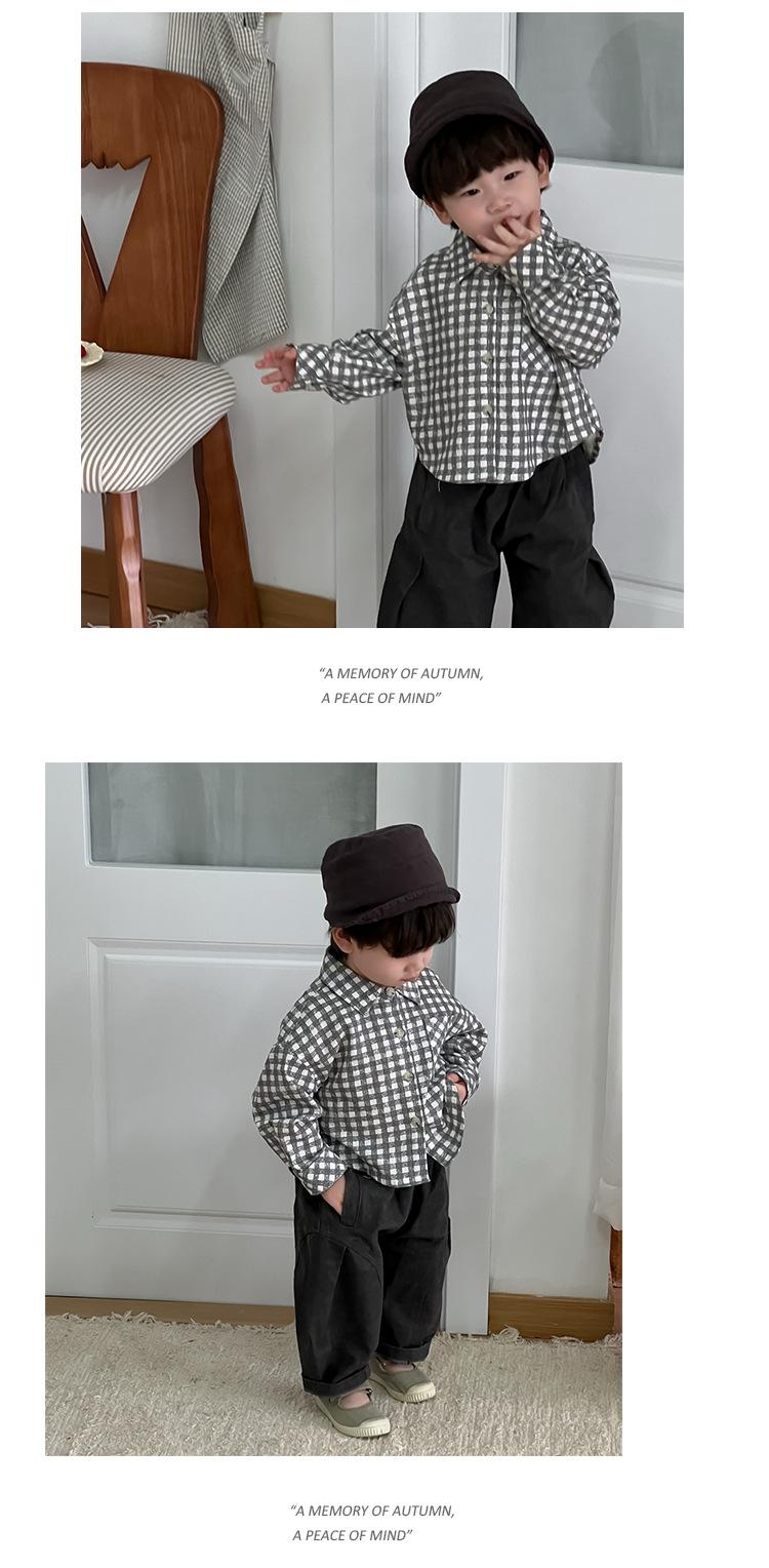 Roupa de Outono para Bebê 2025 Novo Estilo Coreano Roupa Infantil Roupa de Outono para Meninos Camisa Xadrez com Lapela Terno Calças Casuais Tendência