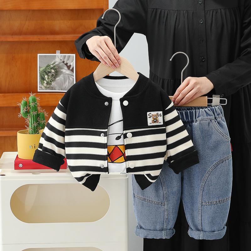 Compre Roupas infantis meninos primavera e outono terno 2025 novo bebê infantil primavera listrado botão camisa conjunto de três peças no atacado no Joom.pro