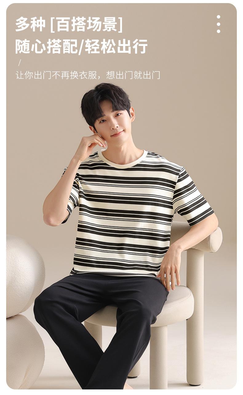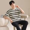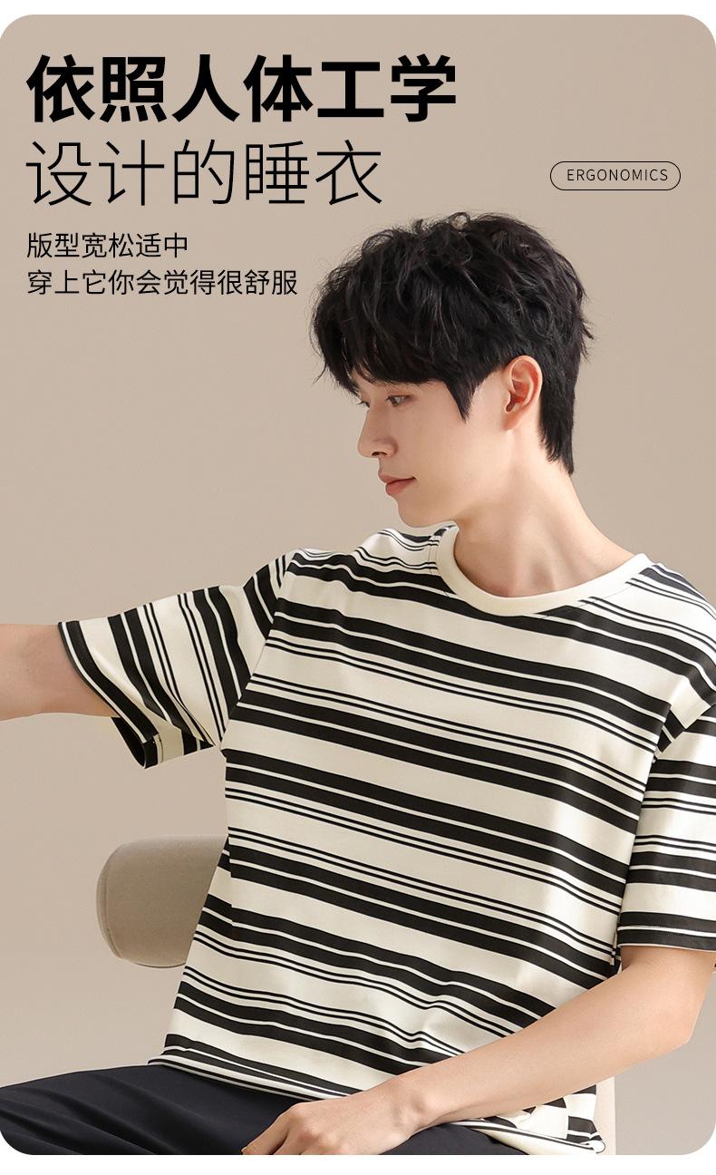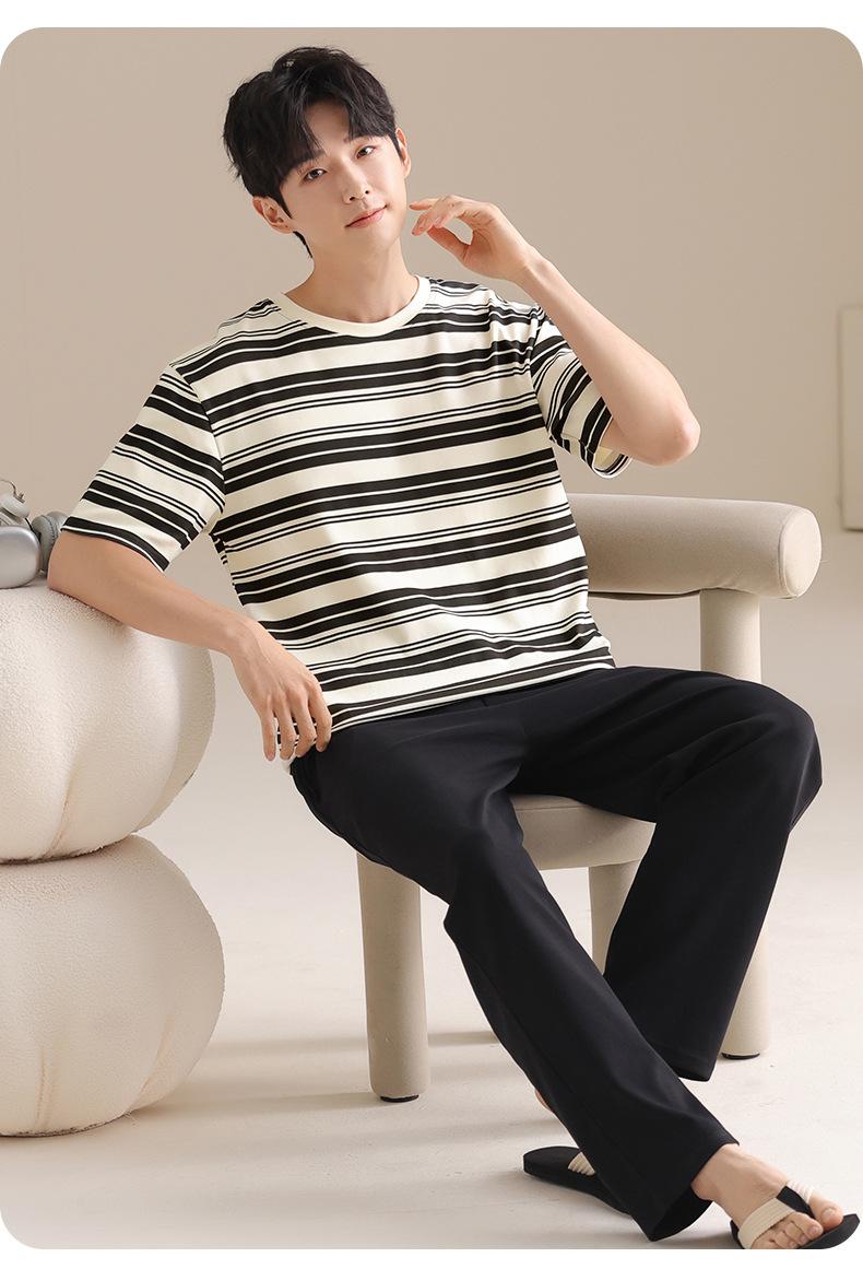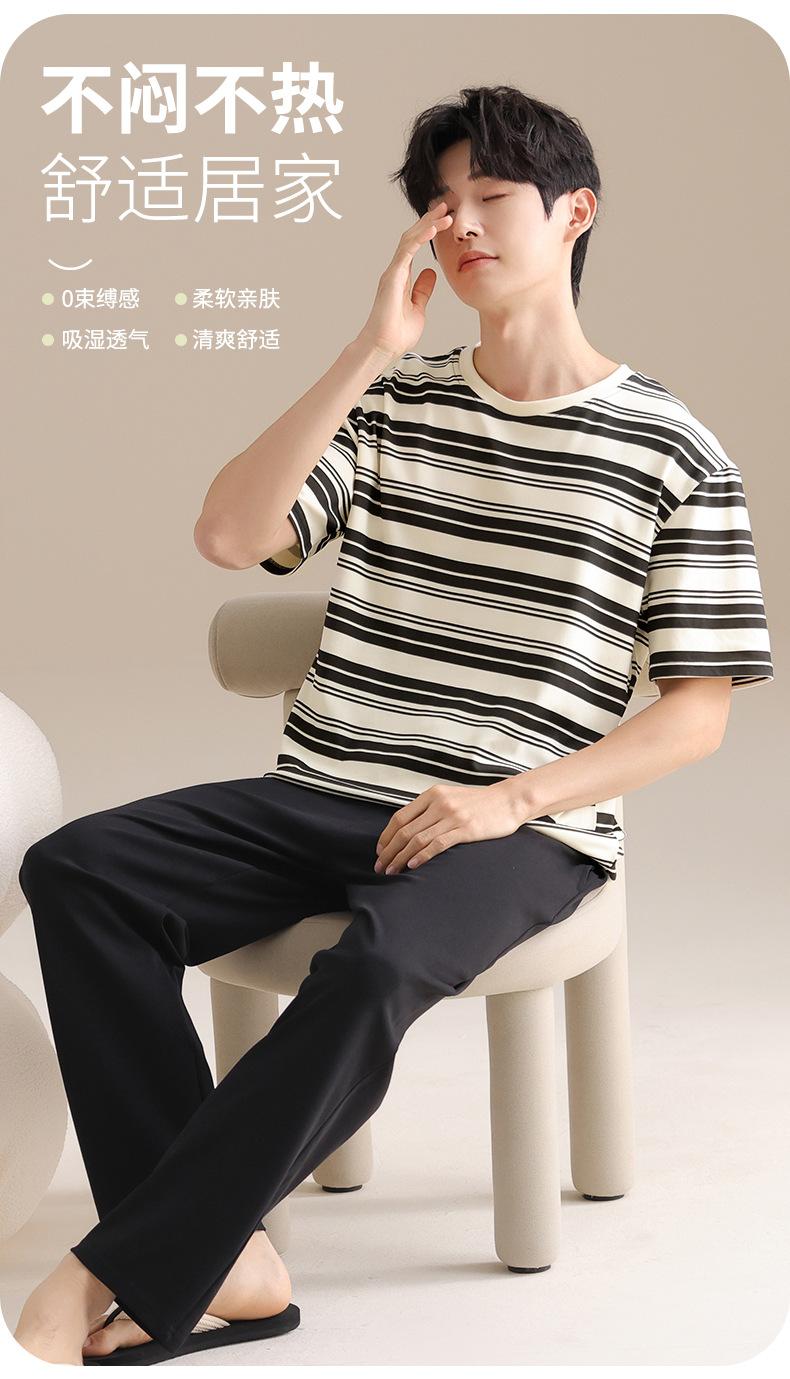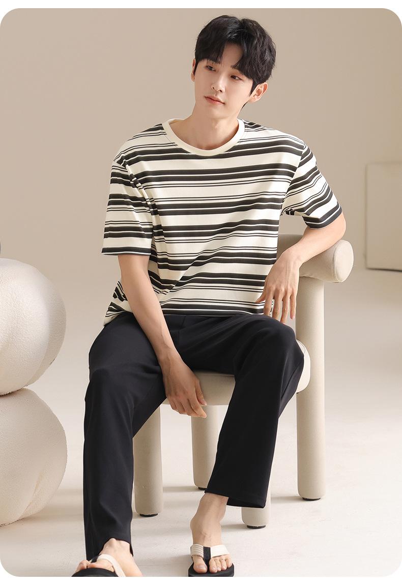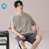 Pijama de algodão puro masculino, pulôver de verão, calças de manga curta, listrado, casual, conjunto completo, roupa nova, roupa de casa, terno