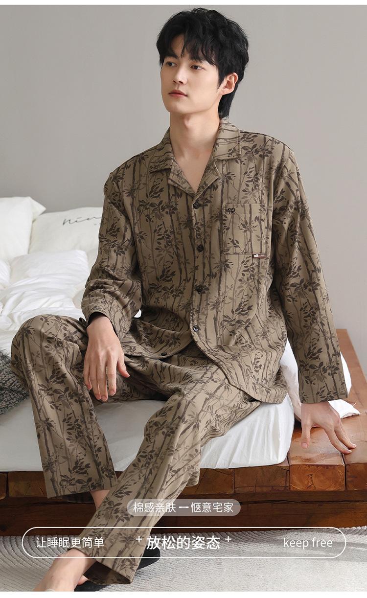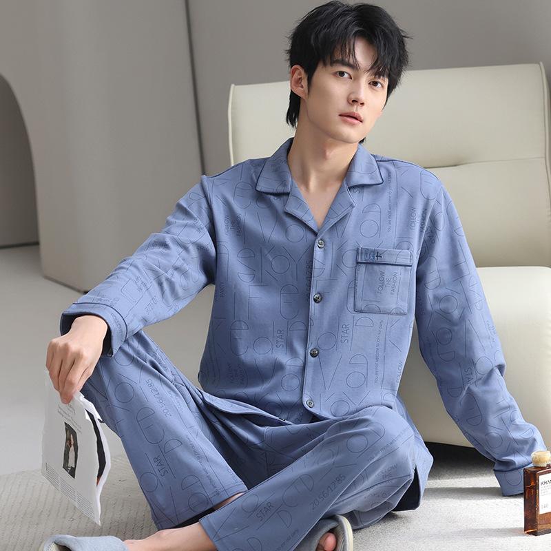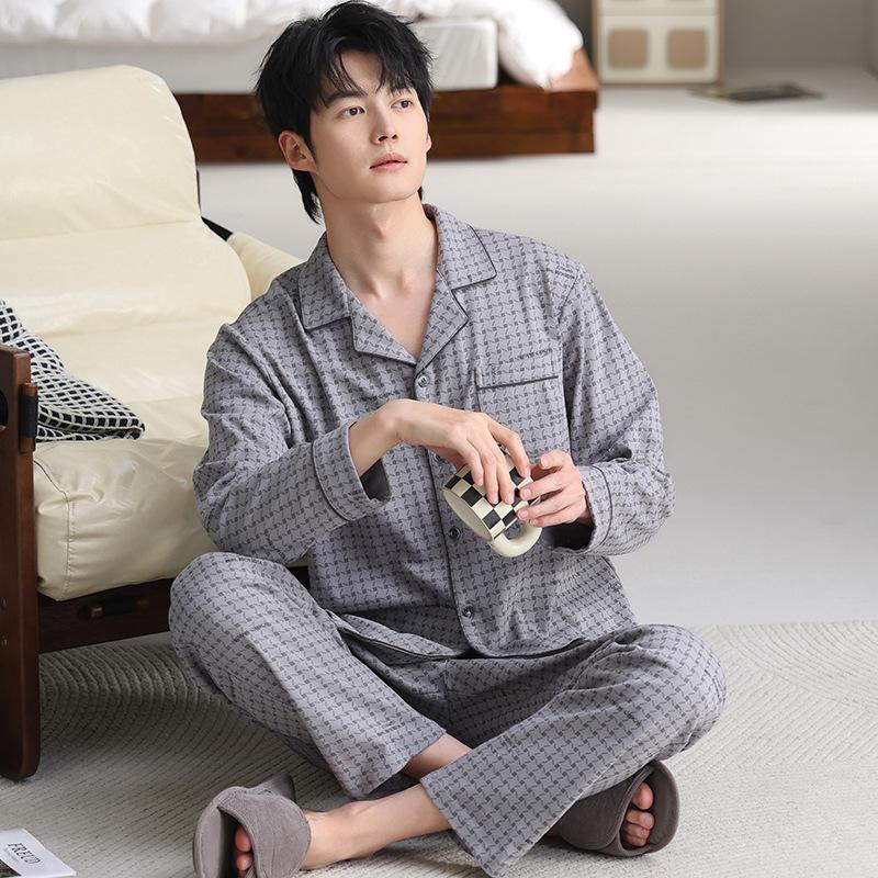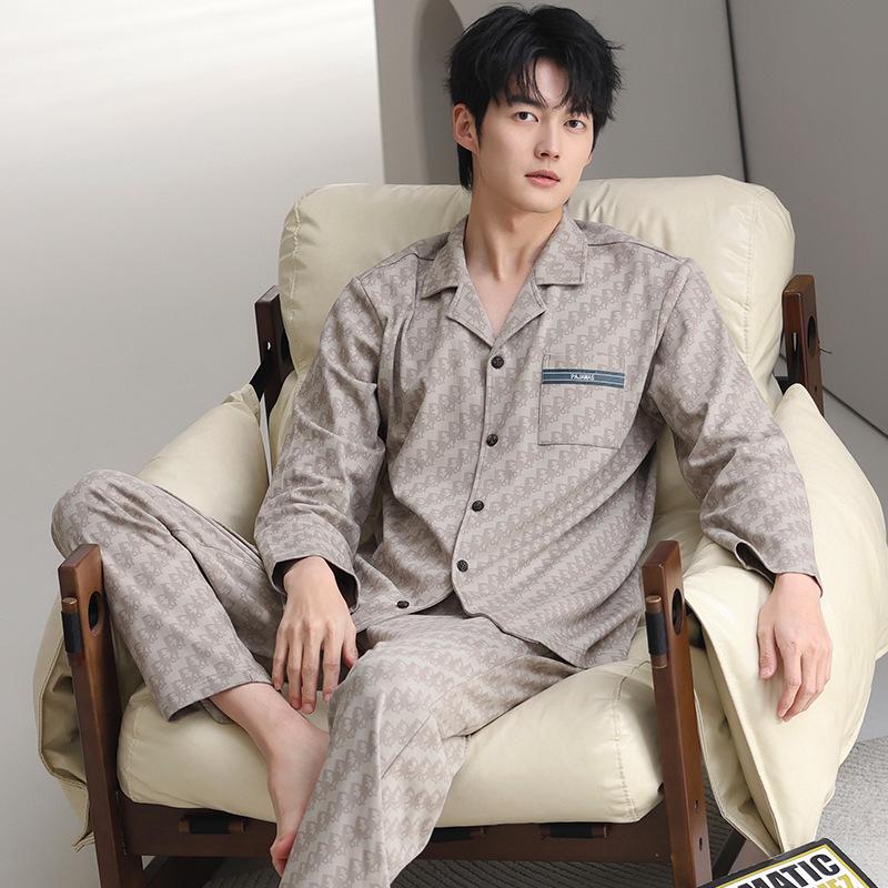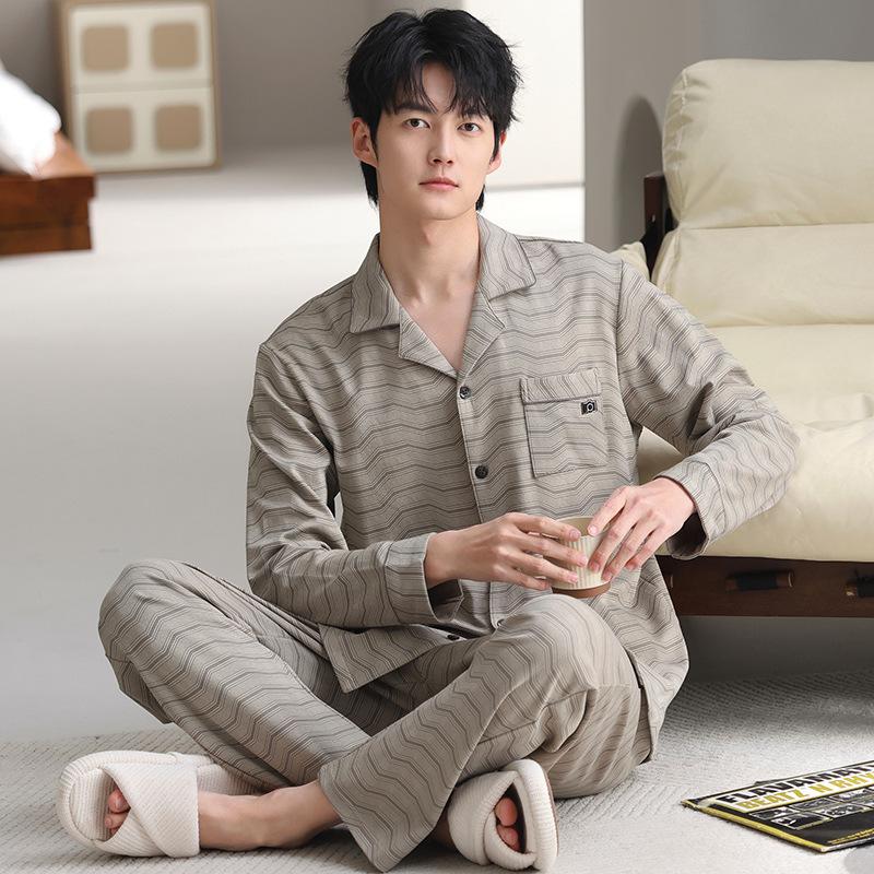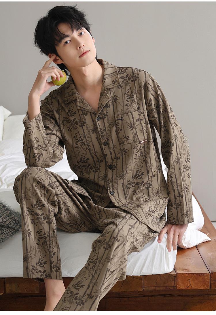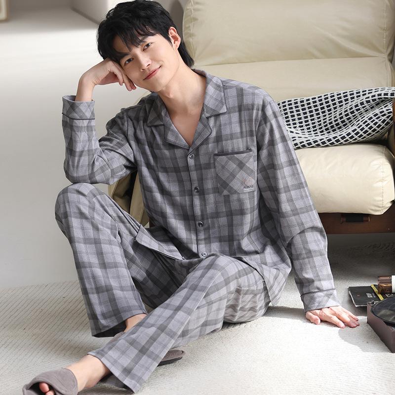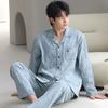 Novos pijamas masculinos de algodão primavera e outono manga comprida cardigan lapela calças simples casual roupas de casa terno desgaste exterior
