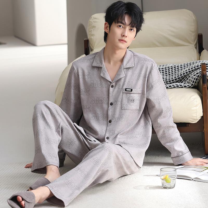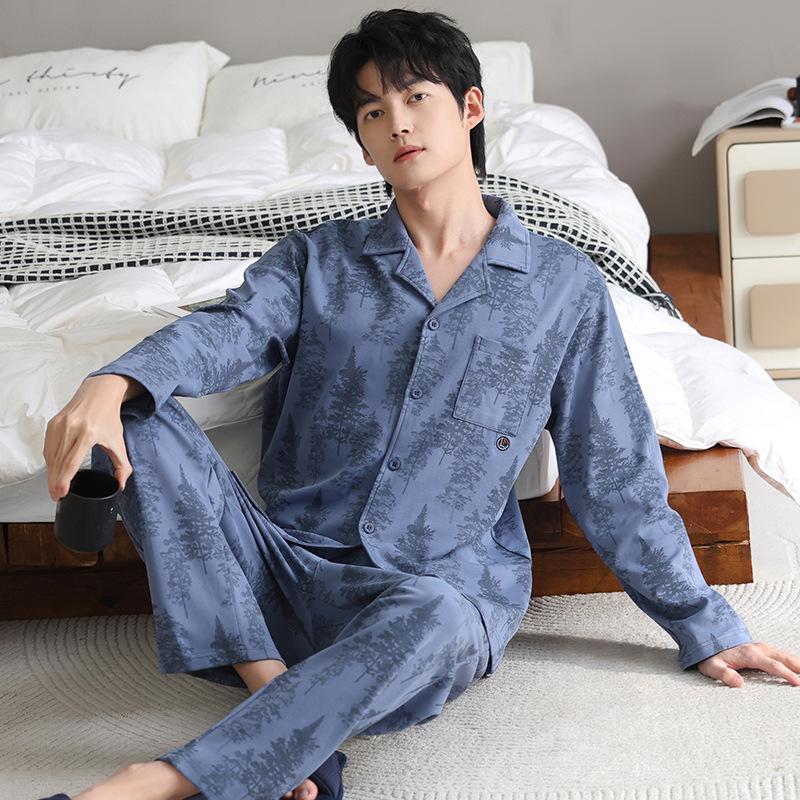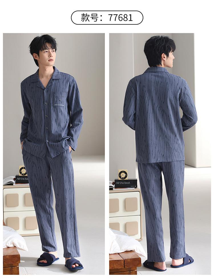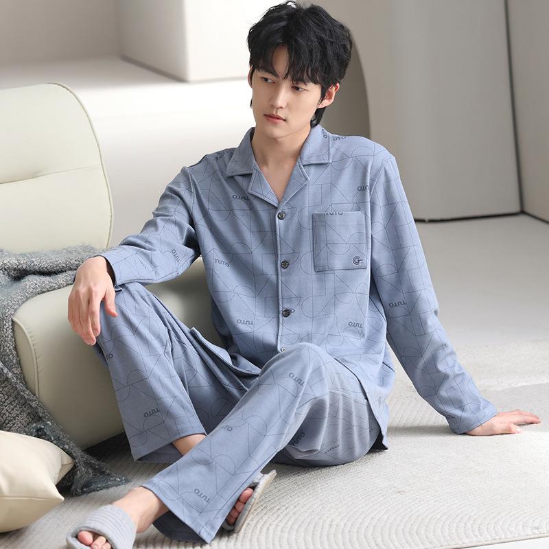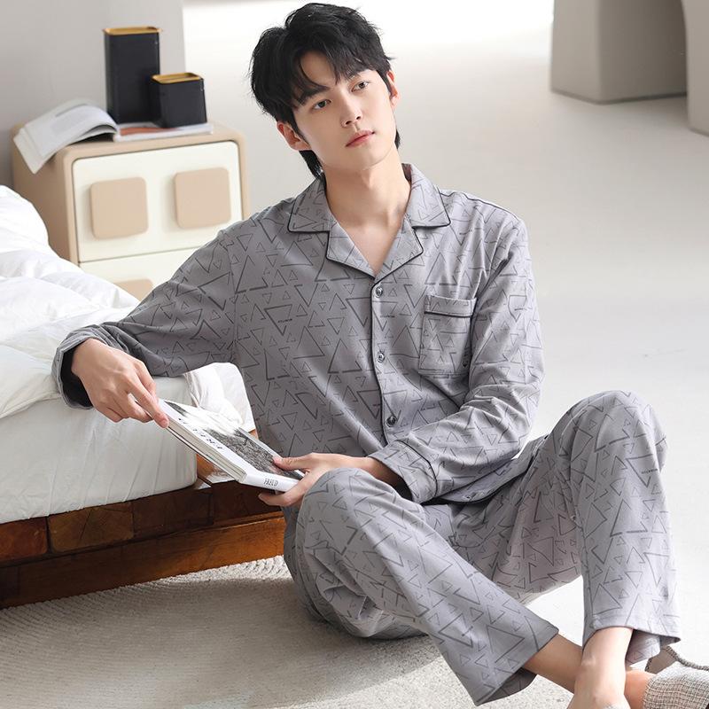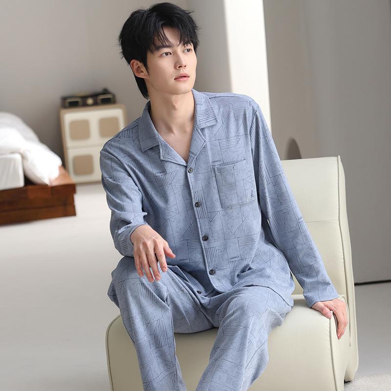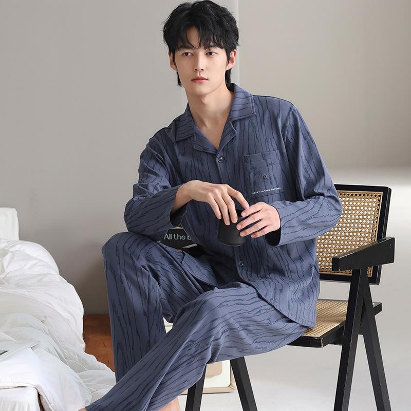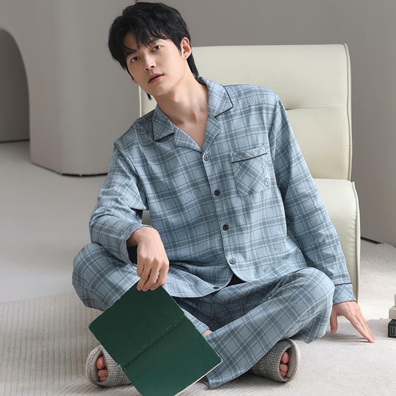 Novos pijamas masculinos de algodão primavera e outono manga comprida cardigan lapela calças simples casual roupas de casa terno desgaste exterior