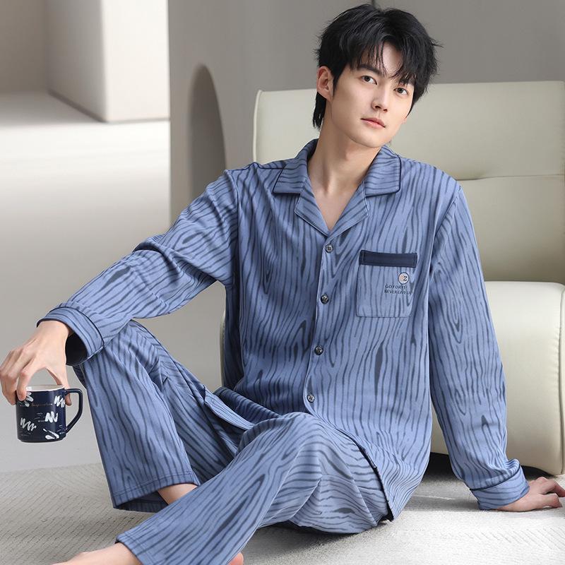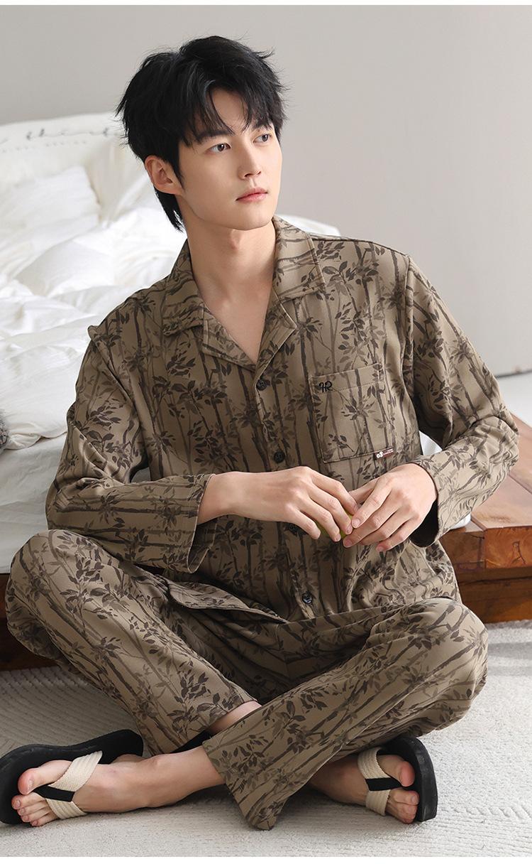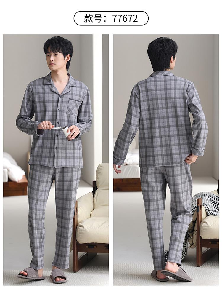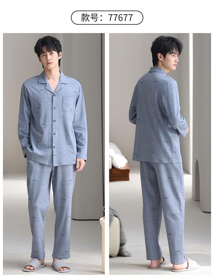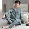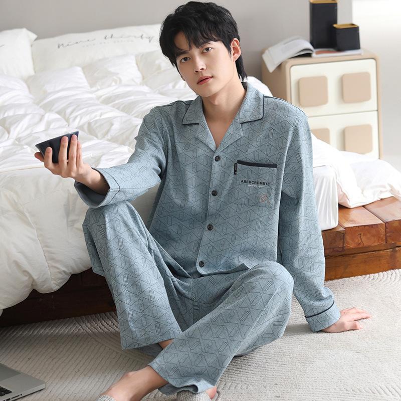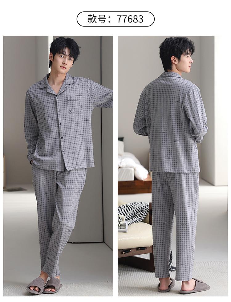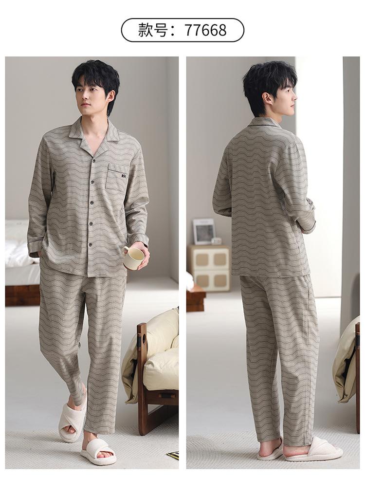 Novos pijamas masculinos de algodão primavera e outono manga comprida cardigan lapela calças simples casual roupas de casa terno desgaste exterior