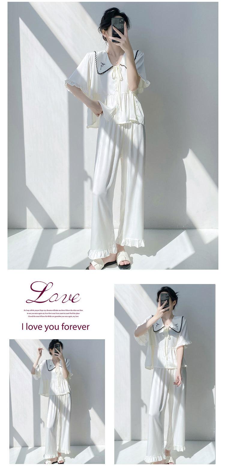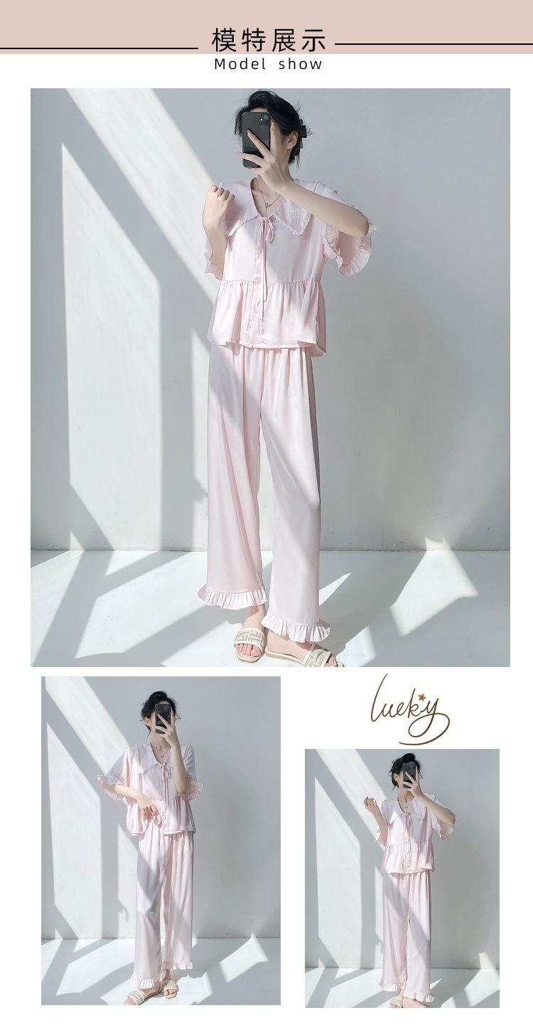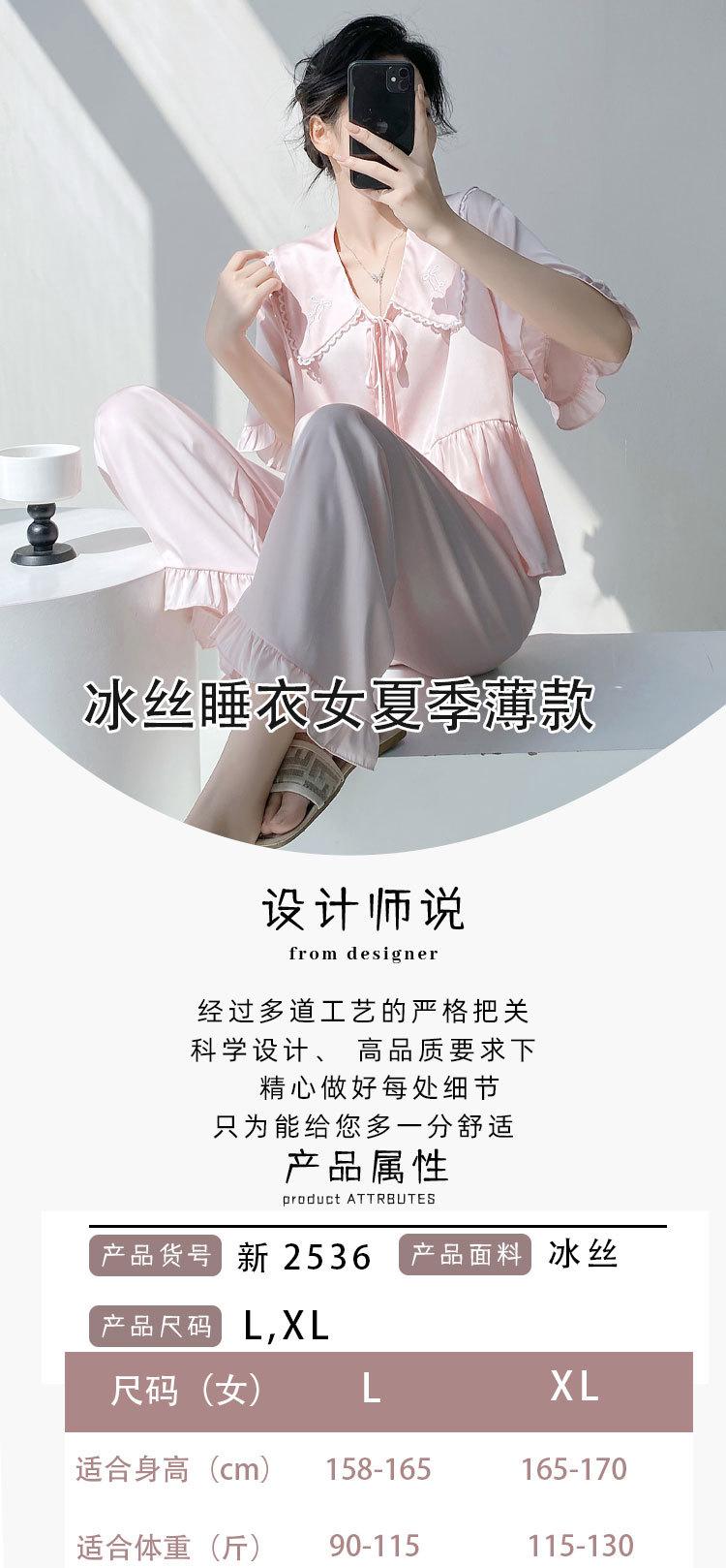Pijamas femininos de manga curta, calças, primavera e outono, seda fina, gelo, duas peças, terno, uso externo, simulação de seda, roupas para casa, verão