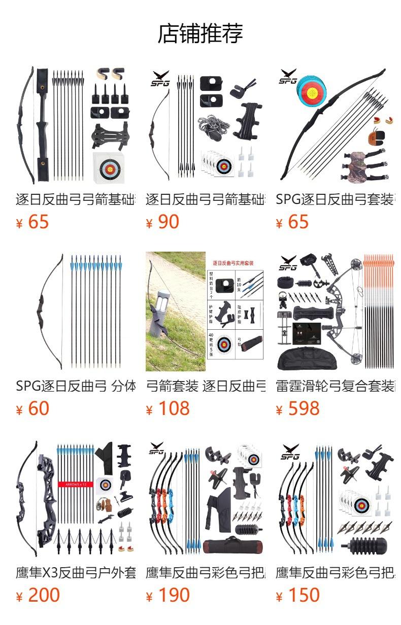 Conteúdo do conjunto: Arco recurvo + Flechas de fibra de vidro*6 + Papel para alvo*5 + Descanso de flecha*4 + Culatras de cobre*2 + Protetor de braço com furos + Protetor de dedo