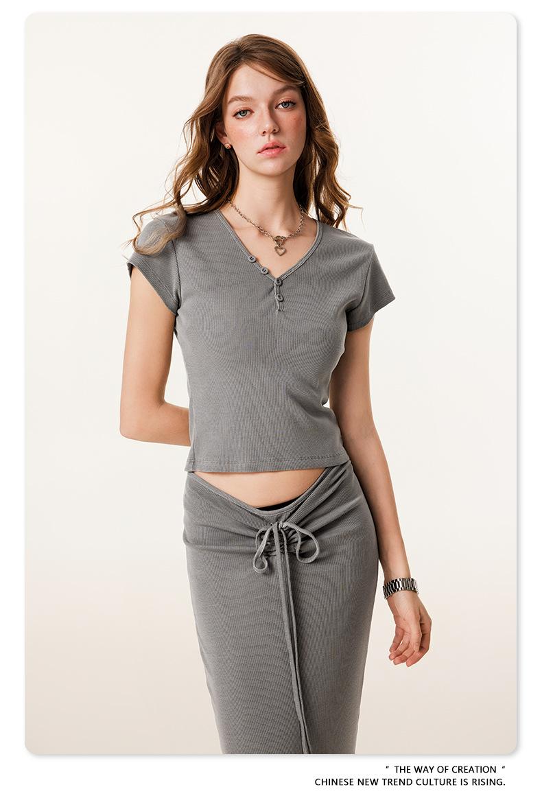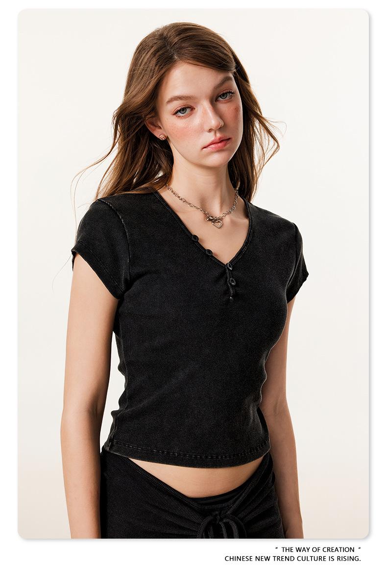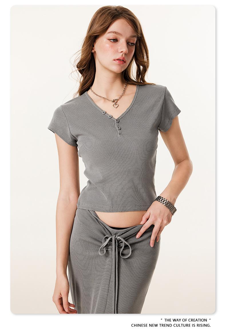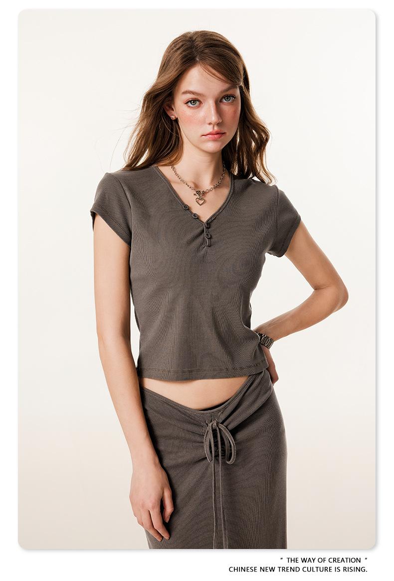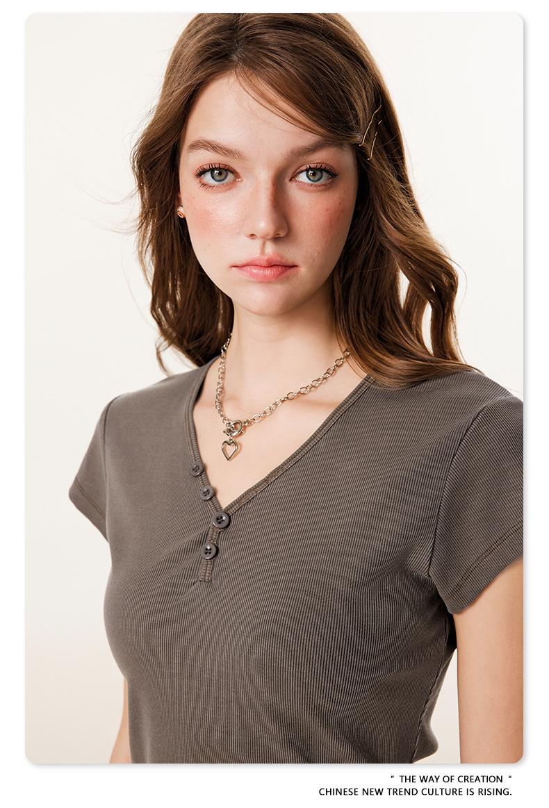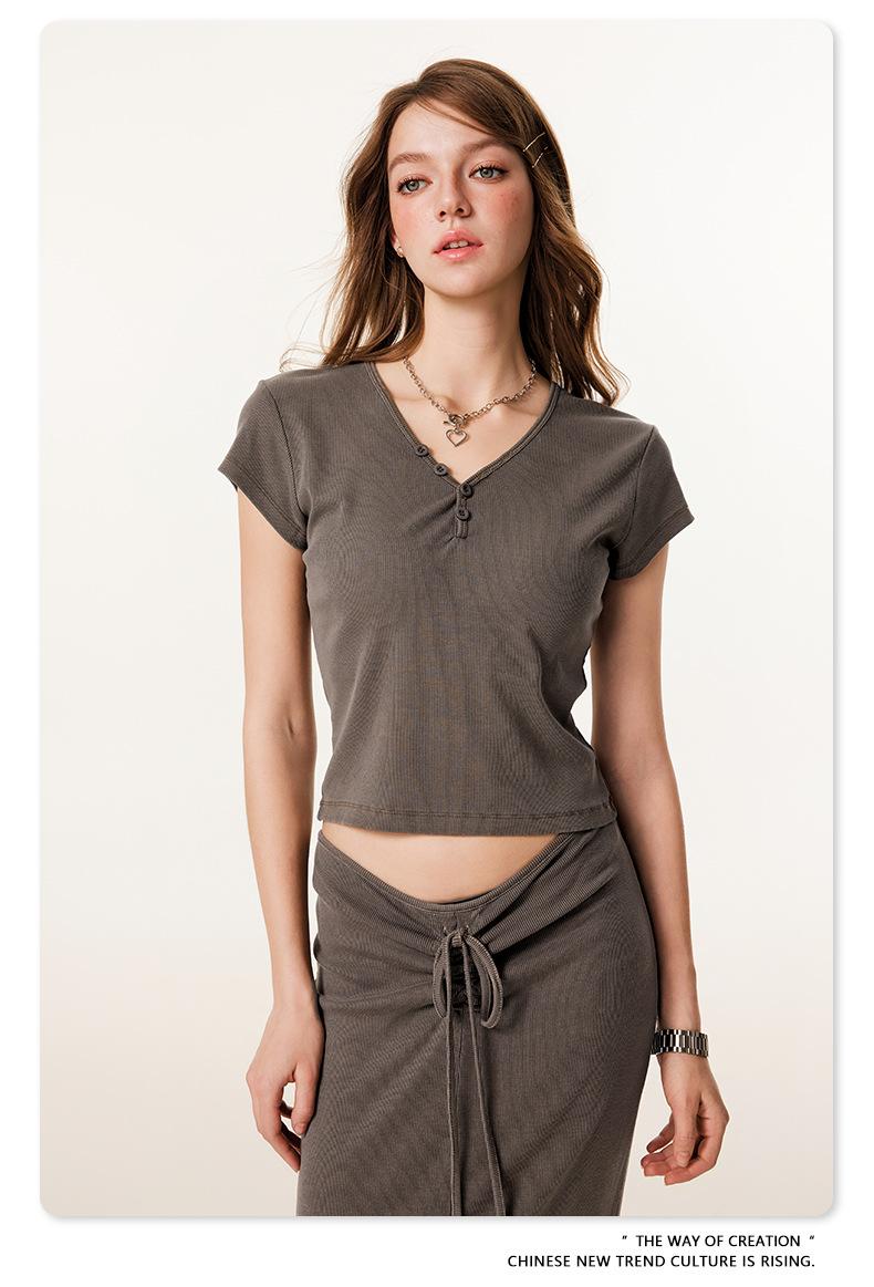 Compre Seja Roupa Feminina 2025 Verão Design Retrô Americano Sexy Slim Top Botão Decote V Ombro Direito Camiseta de Manga Curta para Mulheres no atacado no Joom.pro