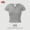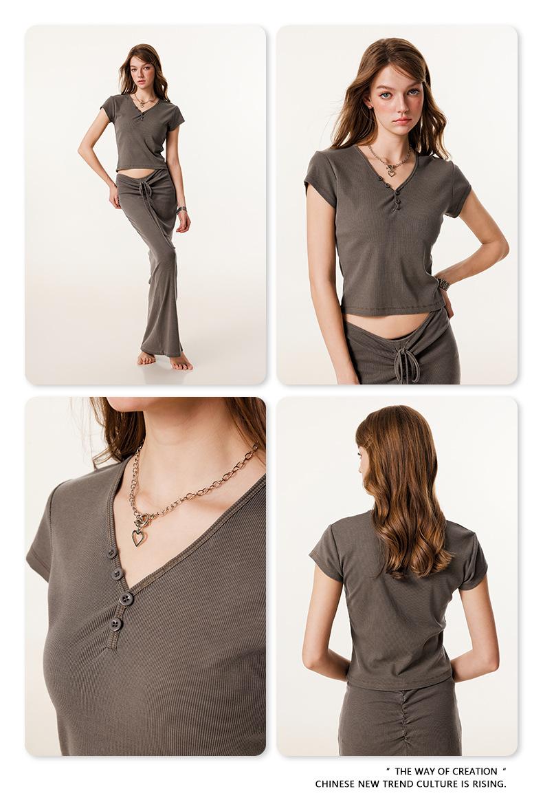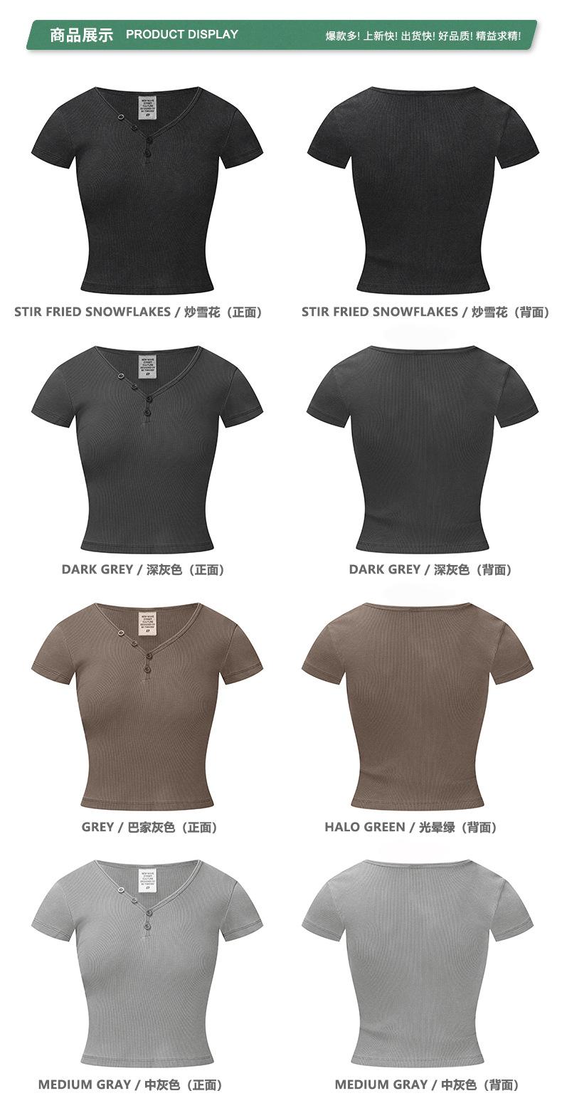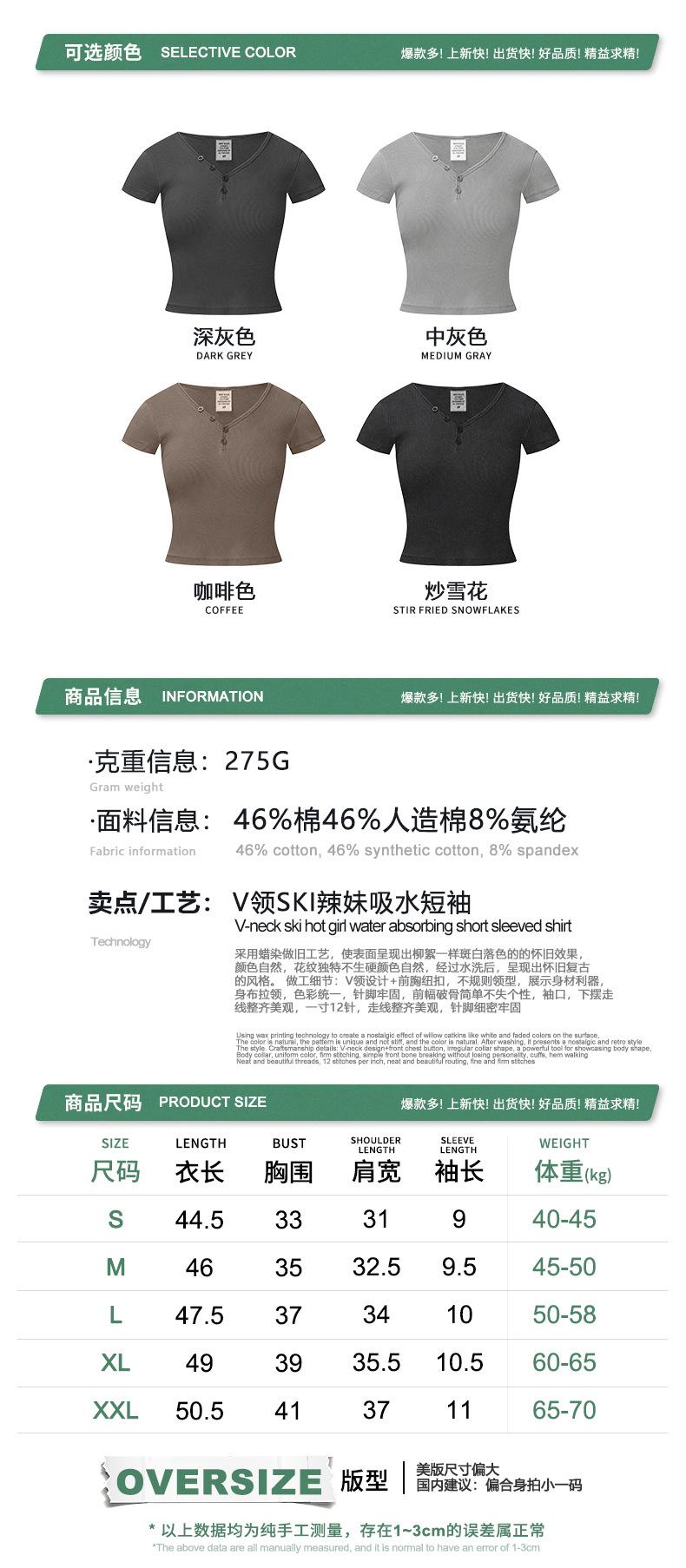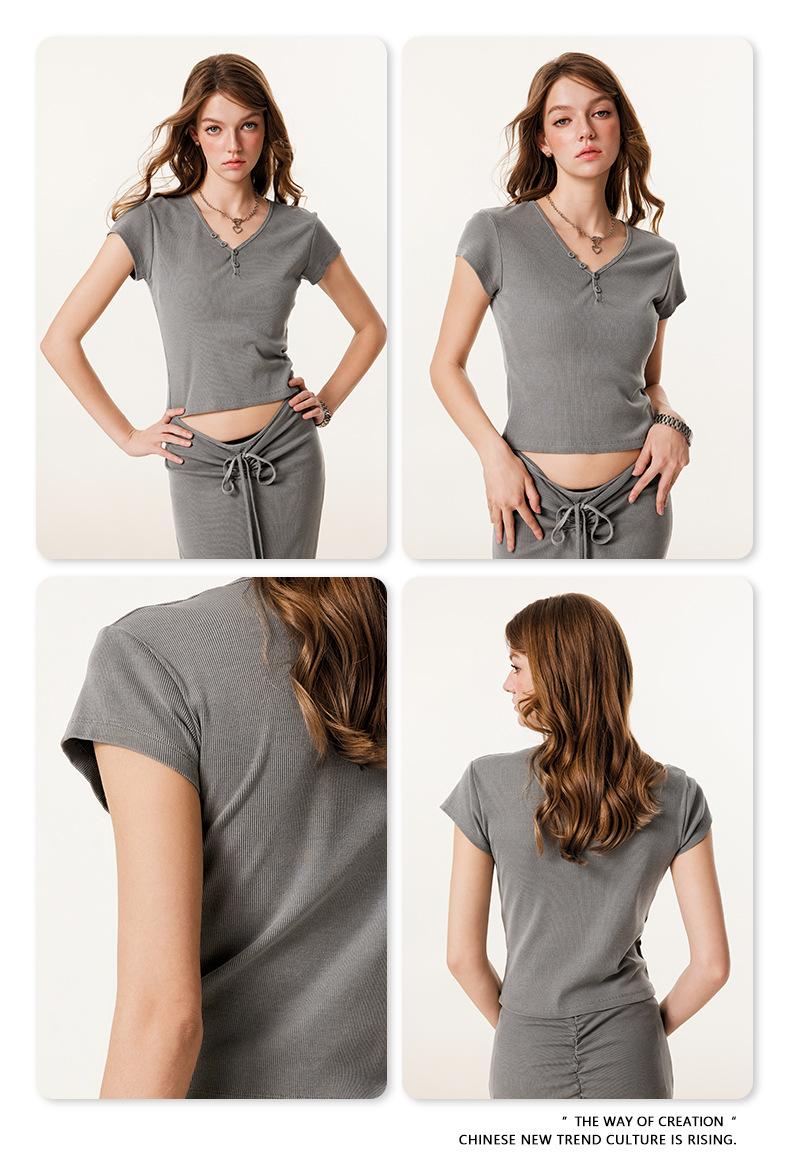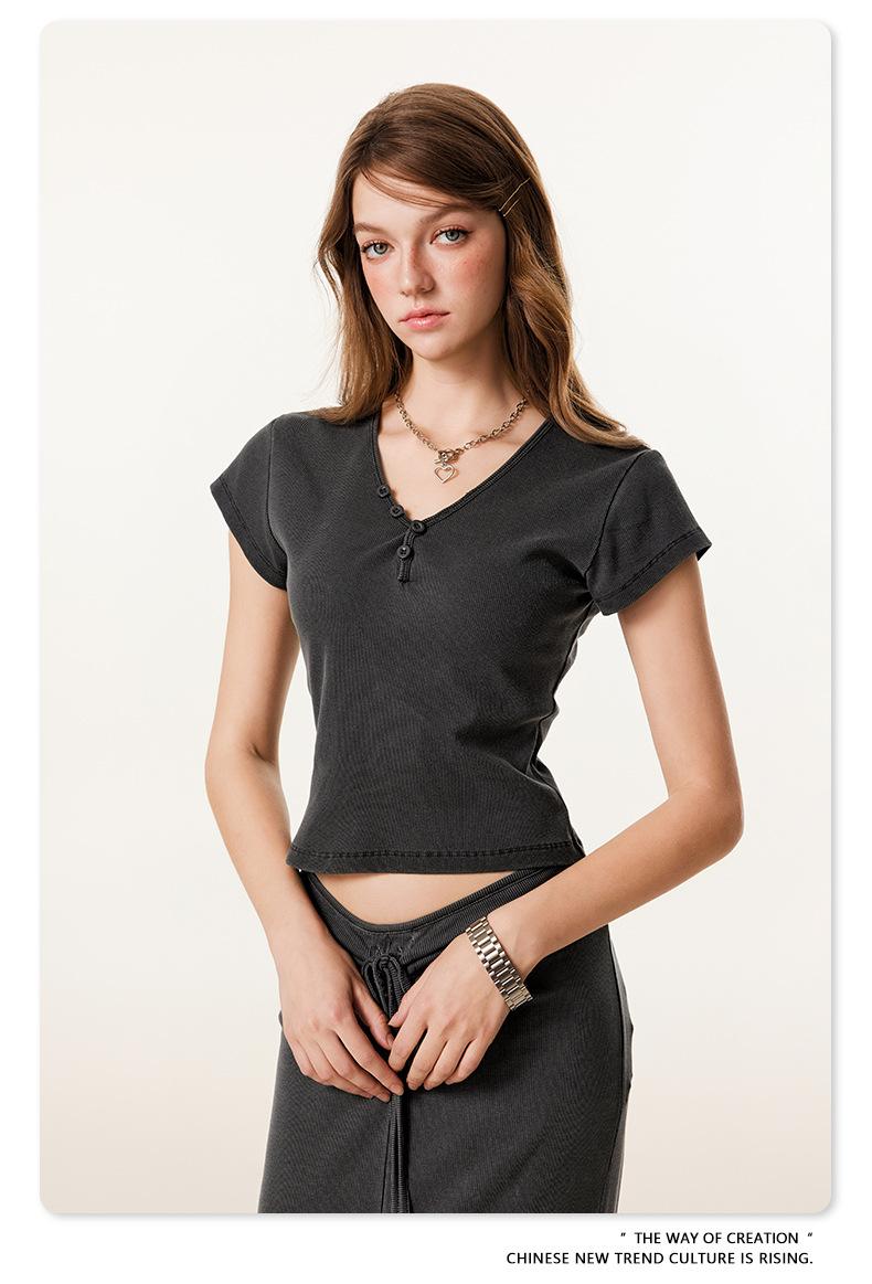 Compre Seja Roupa Feminina 2025 Verão Design Retrô Americano Sexy Slim Top Botão Decote V Ombro Direito Camiseta de Manga Curta para Mulheres no atacado no Joom.pro