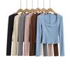 Camiseta americana com gola redonda e manga comprida, forrada com lã, design Sense, fenda lateral, plissada, slim fit, elástica, cor sólida, base, top para mulheres